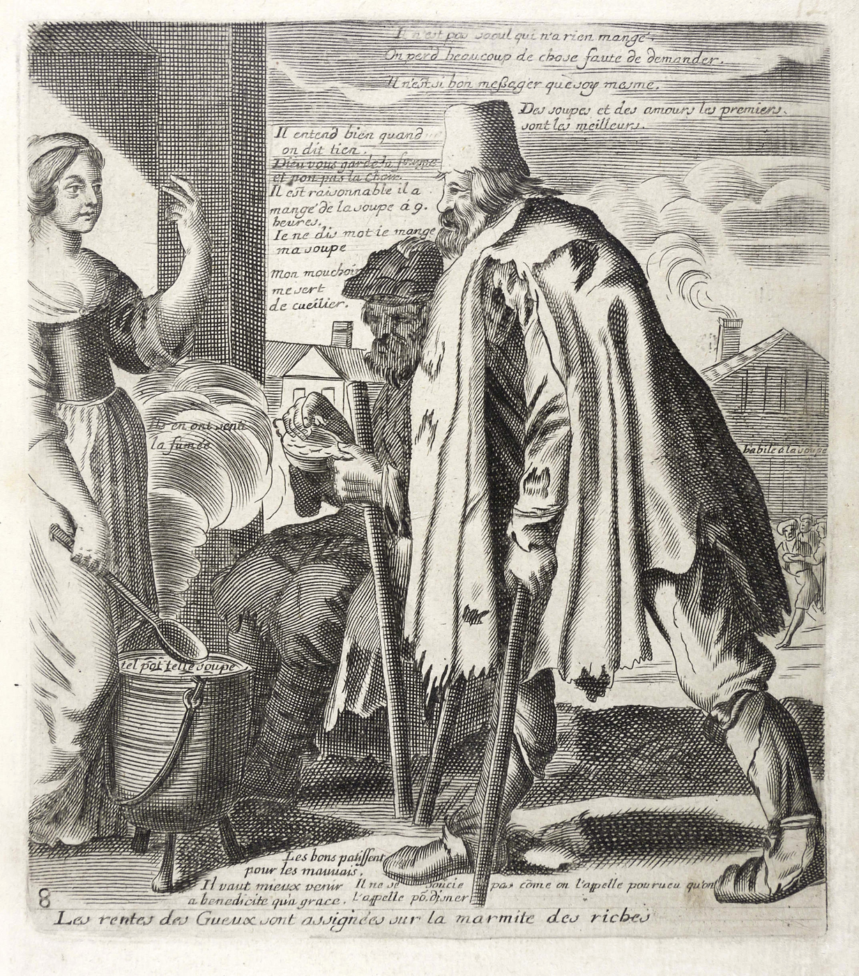 Aus: Jacques Lagniet, Recueil des plus illustres proverbes (Paris: Jacques Lagniet 1657-1663), Bd. 1-4[5]. – In der Platte unterhalb der Darstellung betitelt: ″Les rentes des Gueux sont assignées sur la marmite des riches″. Dazu nummeriert: ″8″. – Blatt verso mit geringen Montageresten und Sammlungsstempeln. Sonst aber guter Zustand.