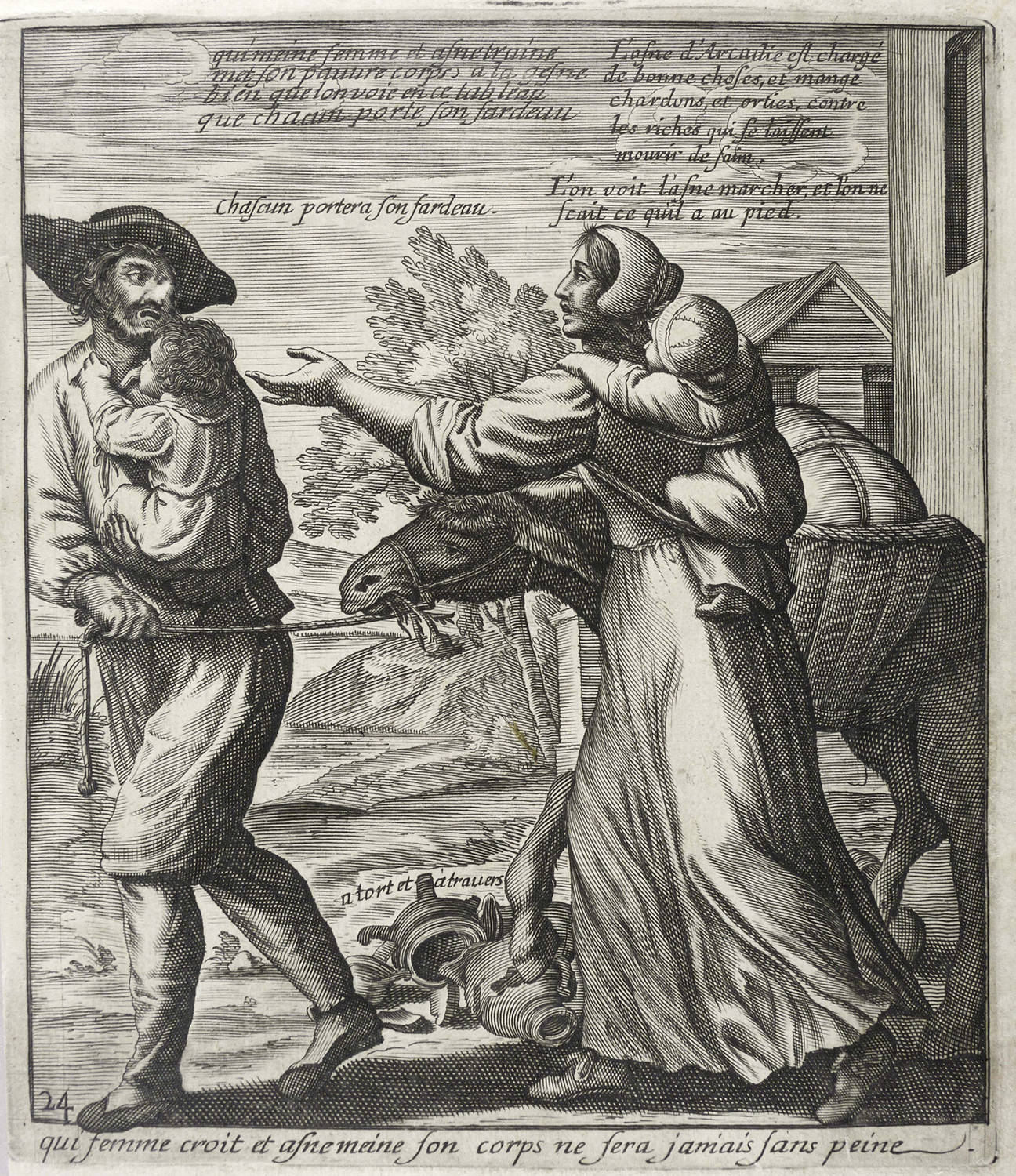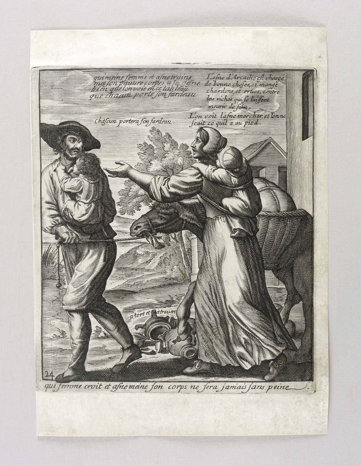 Aus: Jacques Lagniet, Recueil des plus illustres proverbes (Paris: Jacques Lagniet 1657-1663), Bd. 1-4[5]. – In der Platte unterhalb der Darstellung betitelt: ″Qui femme croit et asne meine son corps ne fera jamais sans peine″. Dazu nummeriert: ″24″. – Blatt verso mit geringen Montageresten. Sonst aber guter Zustand.