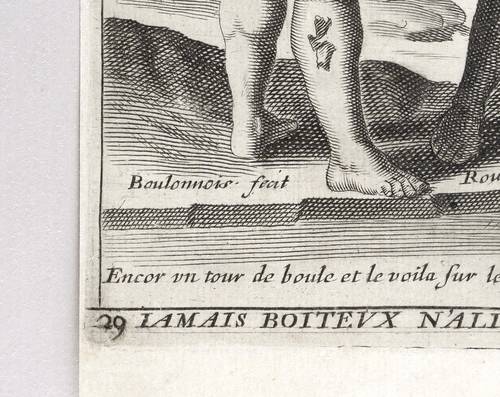 Aus: Jacques Lagniet, Recueil des plus illustres proverbes (Paris: Jacques Lagniet 1657-1663), Bd. 1-4[5]. – In der Platte unterhalb der Darstellung betitelt und nummeriert: ″29″. – Blatt verso mit geringen Montageresten. Sonst aber guter Zustand.