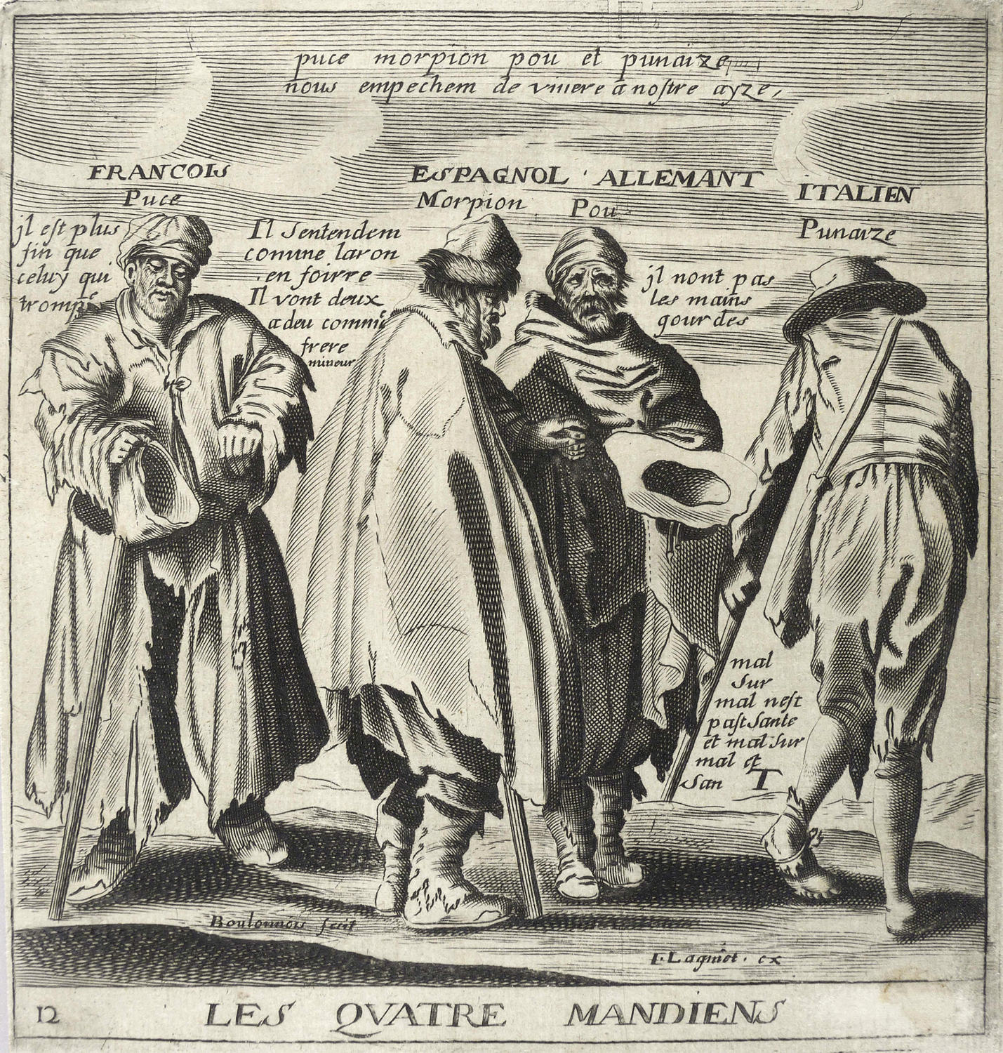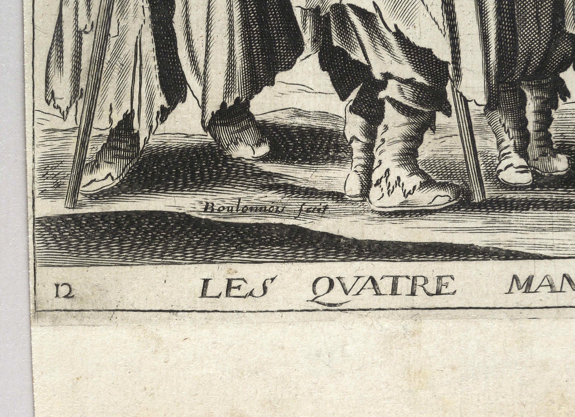 Aus: Jacques Lagniet, Recueil des plus illustres proverbes (Paris: Jacques Lagniet 1657-1663), Bd. 1-4[5]. – In der Platte links unten signiert: ″Boulonnois fecit″. Unterhalb der Darstellung betitelt: ″Le quatre mandiens″. Dazu nummeriert: ″12″. – Blatt verso mit geringen Montageresten und Sammlungsstempeln. Untere rechte Ecke restauriert. Sonst aber guter Zustand.