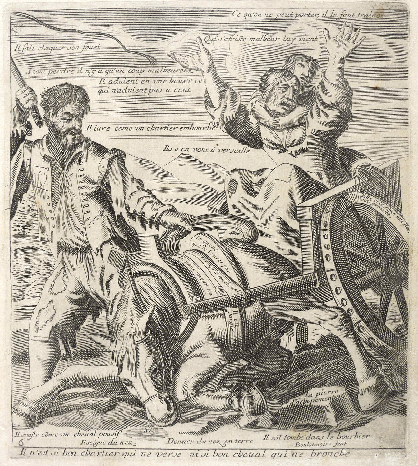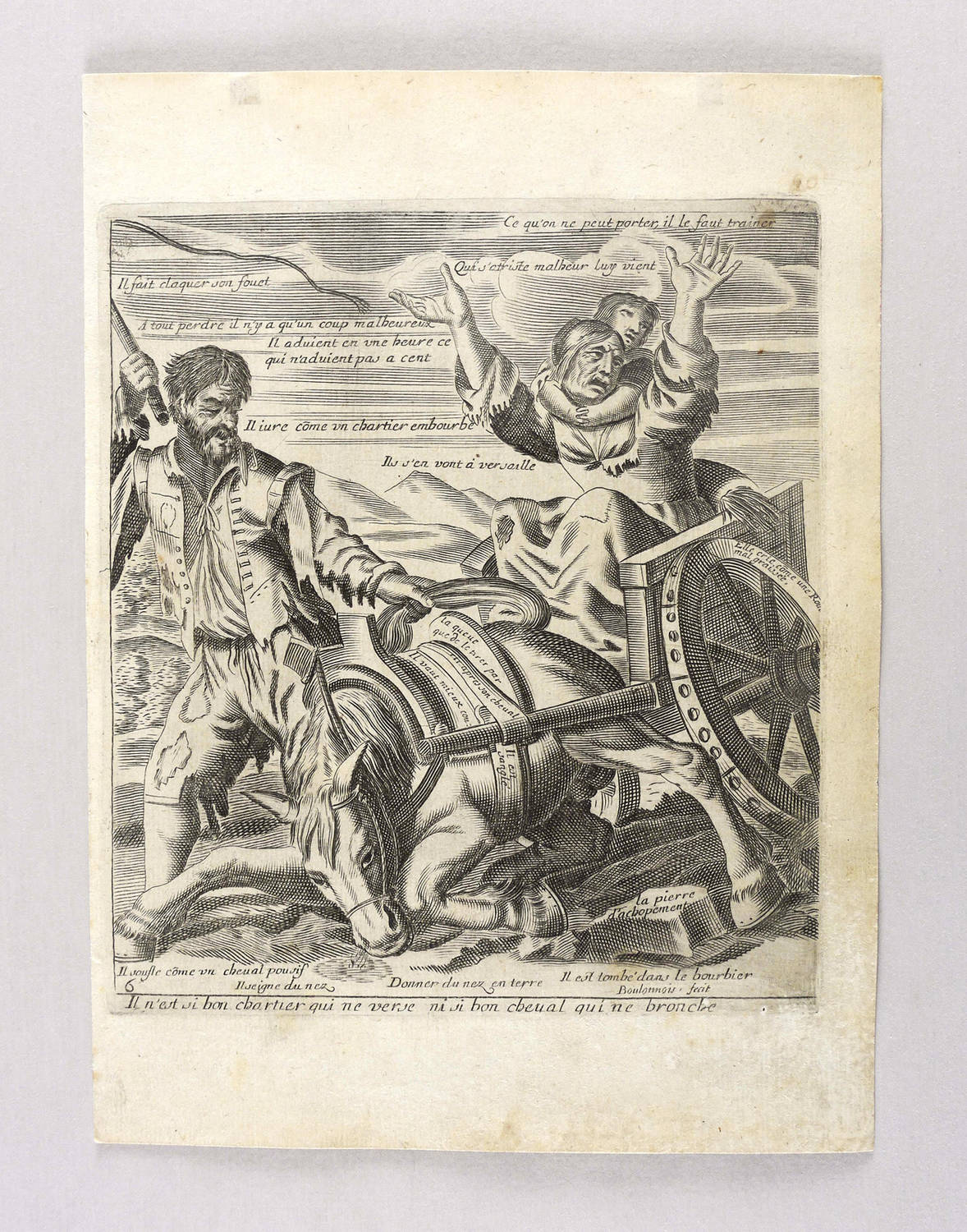 Aus: Jacques Lagniet, Recueil des plus illustres proverbes (Paris: Jacques Lagniet 1657-1663), Bd. 1-4[5]. – In der Platte unterhalb der Darstellung betitelt: ″Il ne si bon chartier qui ne verse, ni si bon cheval qui ne bronche″. Dazu nummeriert: ″6″. – Blatt verso mit geringen Montageresten und Sammlungsstempeln. Sonst aber guter Zustand.