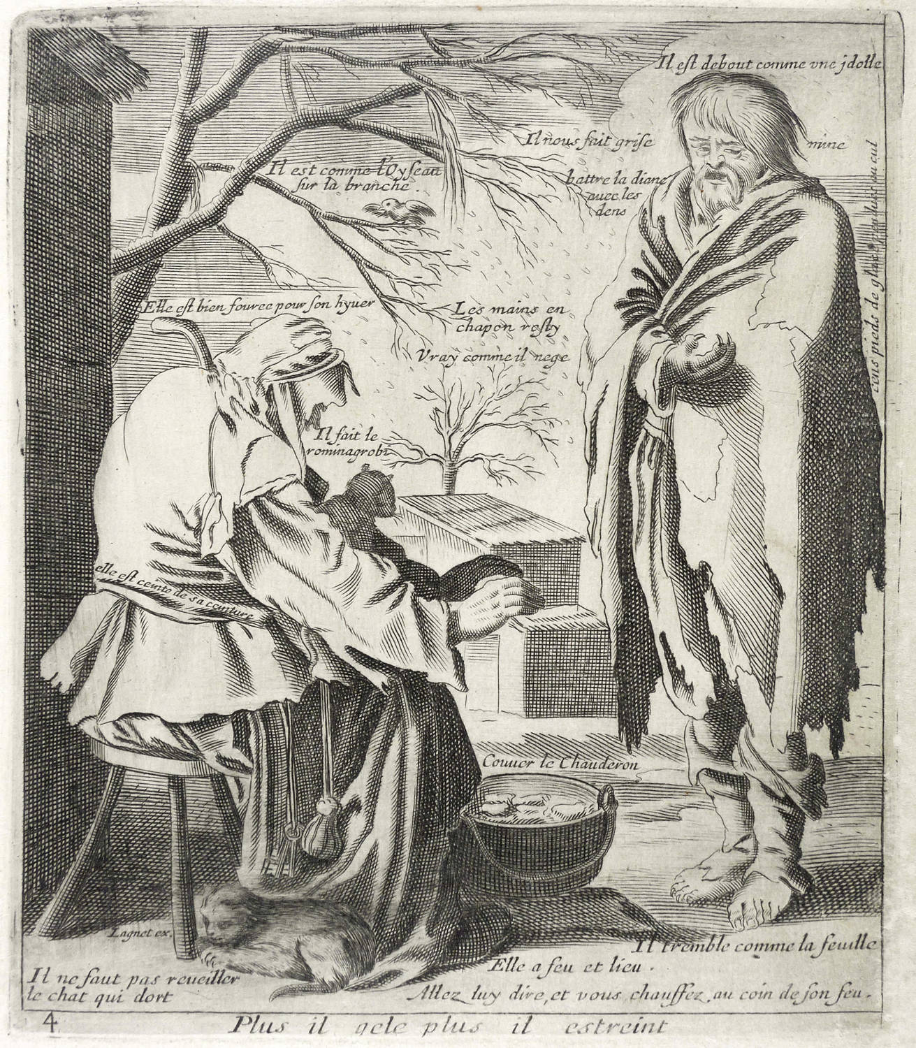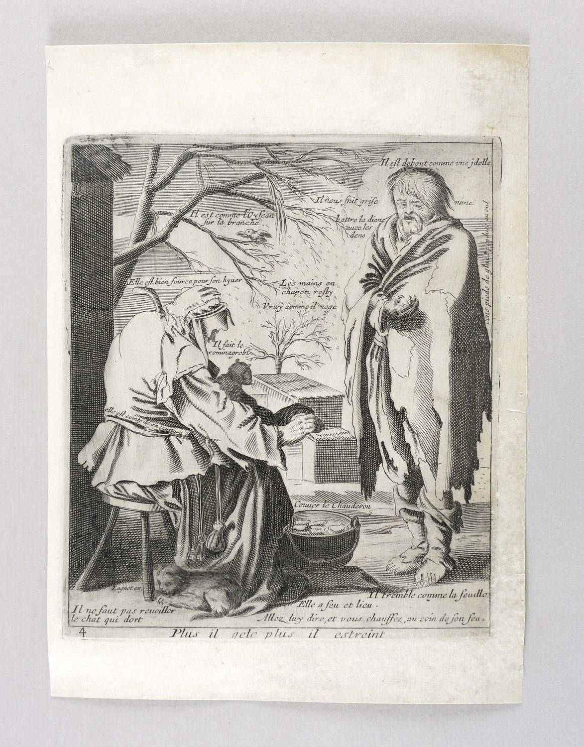 Aus: Jacques Lagniet, Recueil des plus illustres proverbes (Paris: Jacques Lagniet 1657-1663), Bd. 1-4[5]. – In der Platte unterhalb der Darstellung betitelt: ″Plus il gèle plus il estreint″. Dazu nummeriert: ″4″. – Blatt verso mit geringen Montageresten und Sammlungsstempeln. Sonst aber guter Zustand.