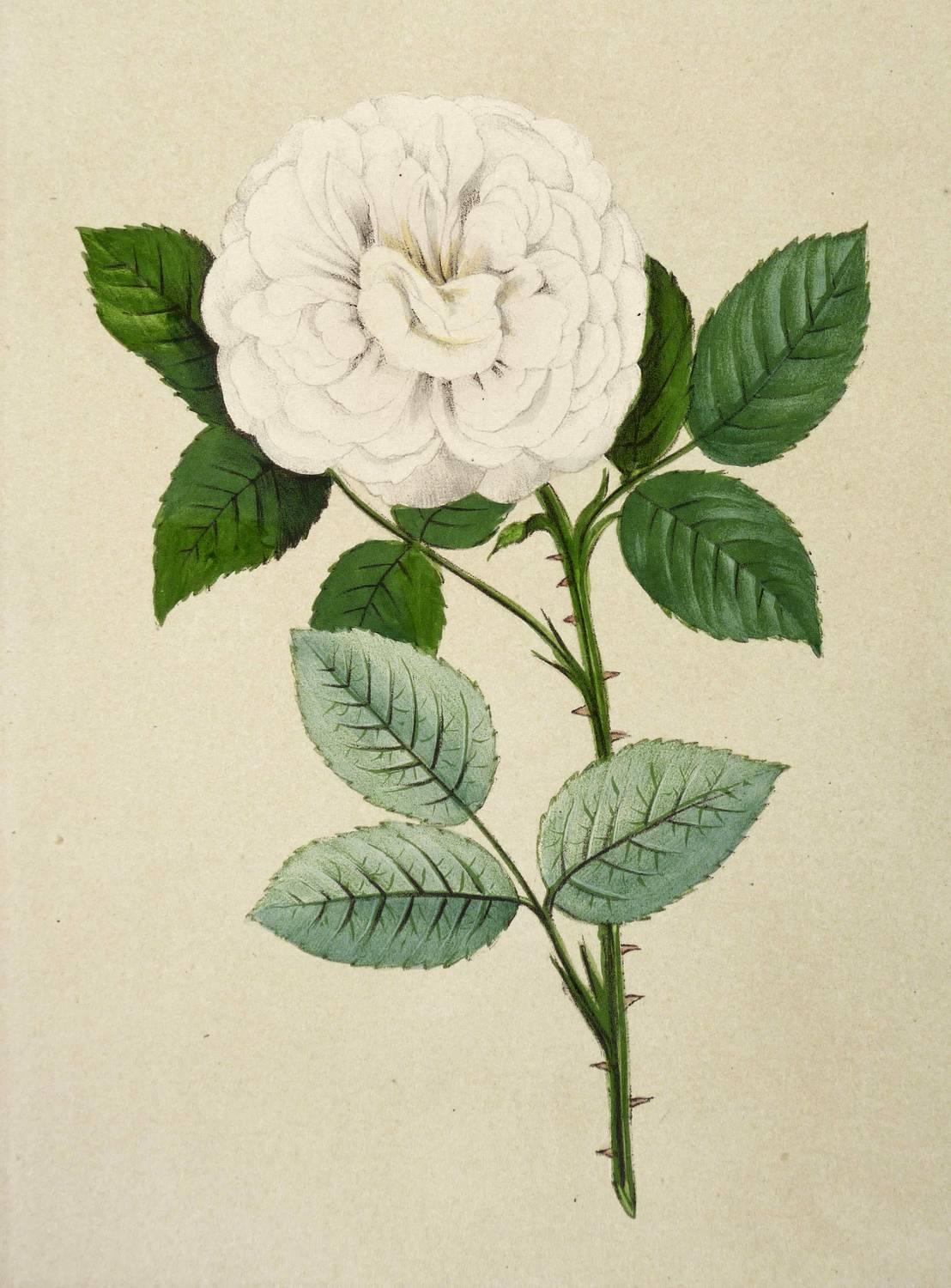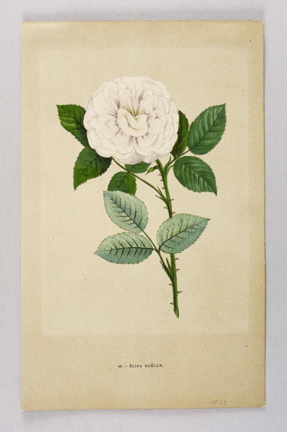 Aus: Hippolyte Jamain & Eugène Forney, Les Roses. histoire-culture-description (Paris: J. Rothschild 1873). – Unterhalb der Darstellung betitelt. – Die Sorte ist eine Züchtung von Jean-Baptiste Guillot père von 1869. – Blatt mit leichtem Lichtrand und verso mit Montageresten. Sonst guter Zustand.