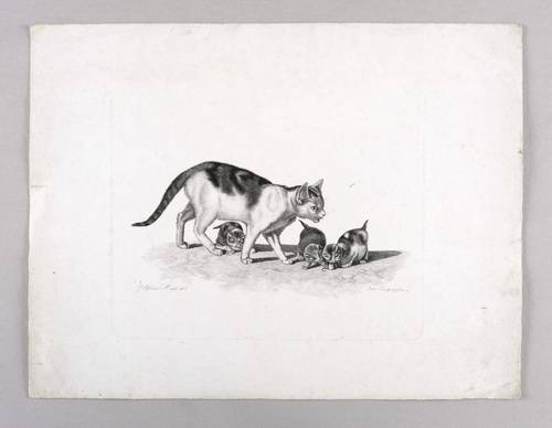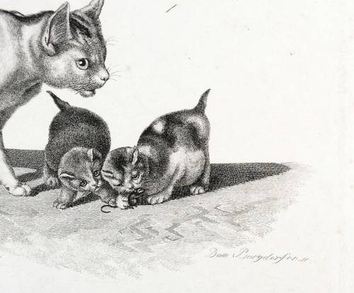 Aus: Six feuilles chats. &c de G. Mind, gravées par D. Bourgdorfer à Berne (Bern: J.J. Burgdorfer 1823). – Rechts unten signiert: ″Dan. Burgdorfer. sc.″ – Blatt leicht angeschmutzt und mit restauriertem Einriss im linken Rand. Untere rechte Ecke bestoßen. Insgesamt noch guter Zustand.