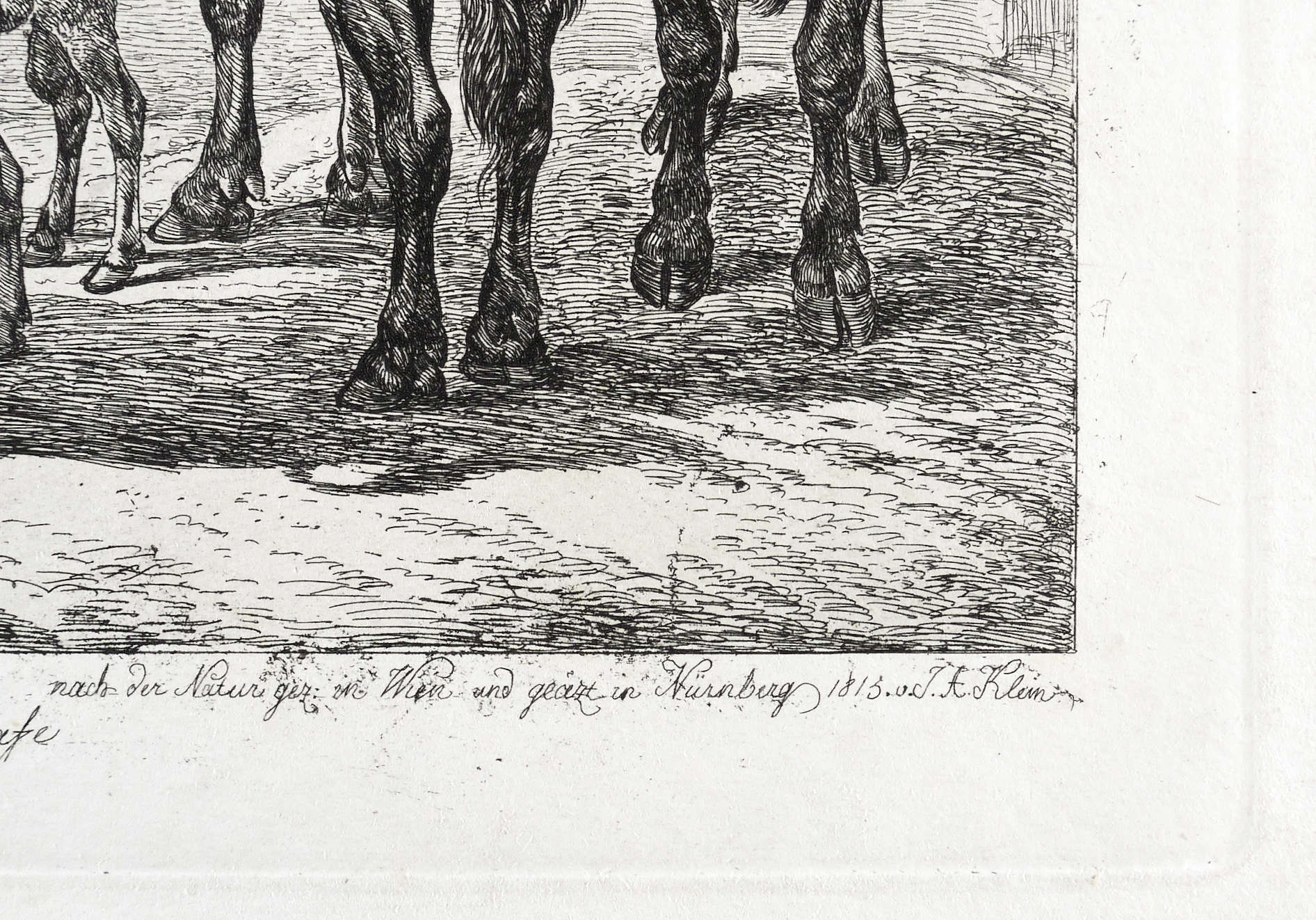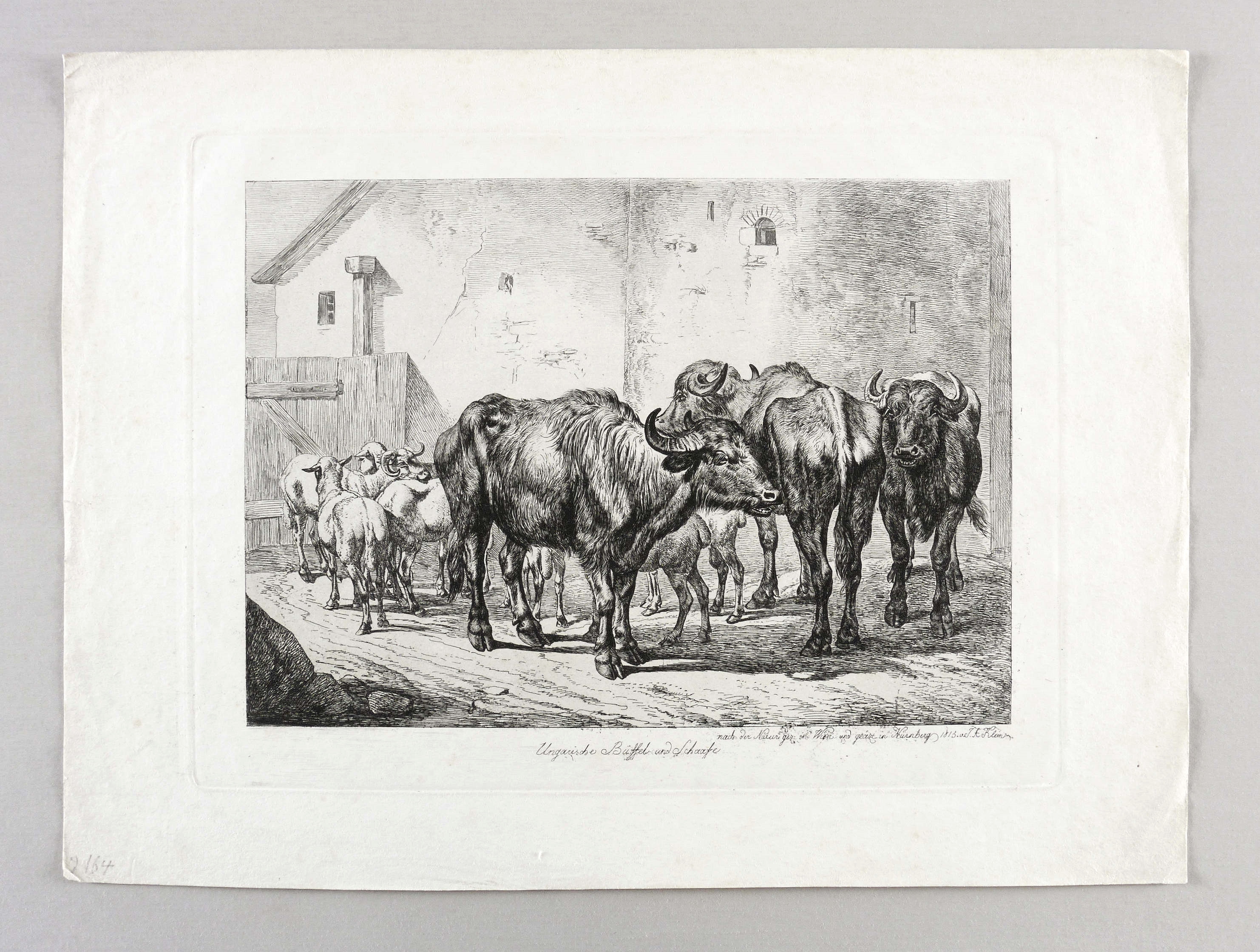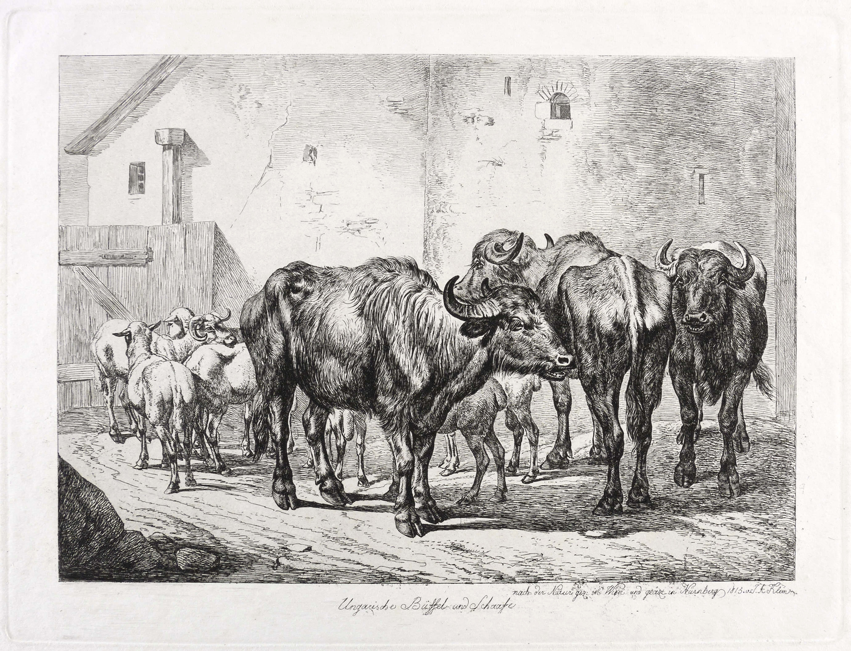 Jahn 164 III (von III). – Rechts unten signiert und datiert: ″nach der Natur gez: in Wien und geäzt in Nürnberg 1815 v. J.A. Klein″. – Bei Jahn beschrieben als: ″Ungarische Büffel und Schaafe in einem durch ein Thor geschlossenen Hofraum bei Gebäuden stehend. Es sind sieben Schafe und drei Büffel, von welch letzteren einer nach rechts, der zweite von dem Betrachter abwärts und der dritte diesem zugewendet steht.″ – Ecken teils leicht bestoßen. Guter Zustand.