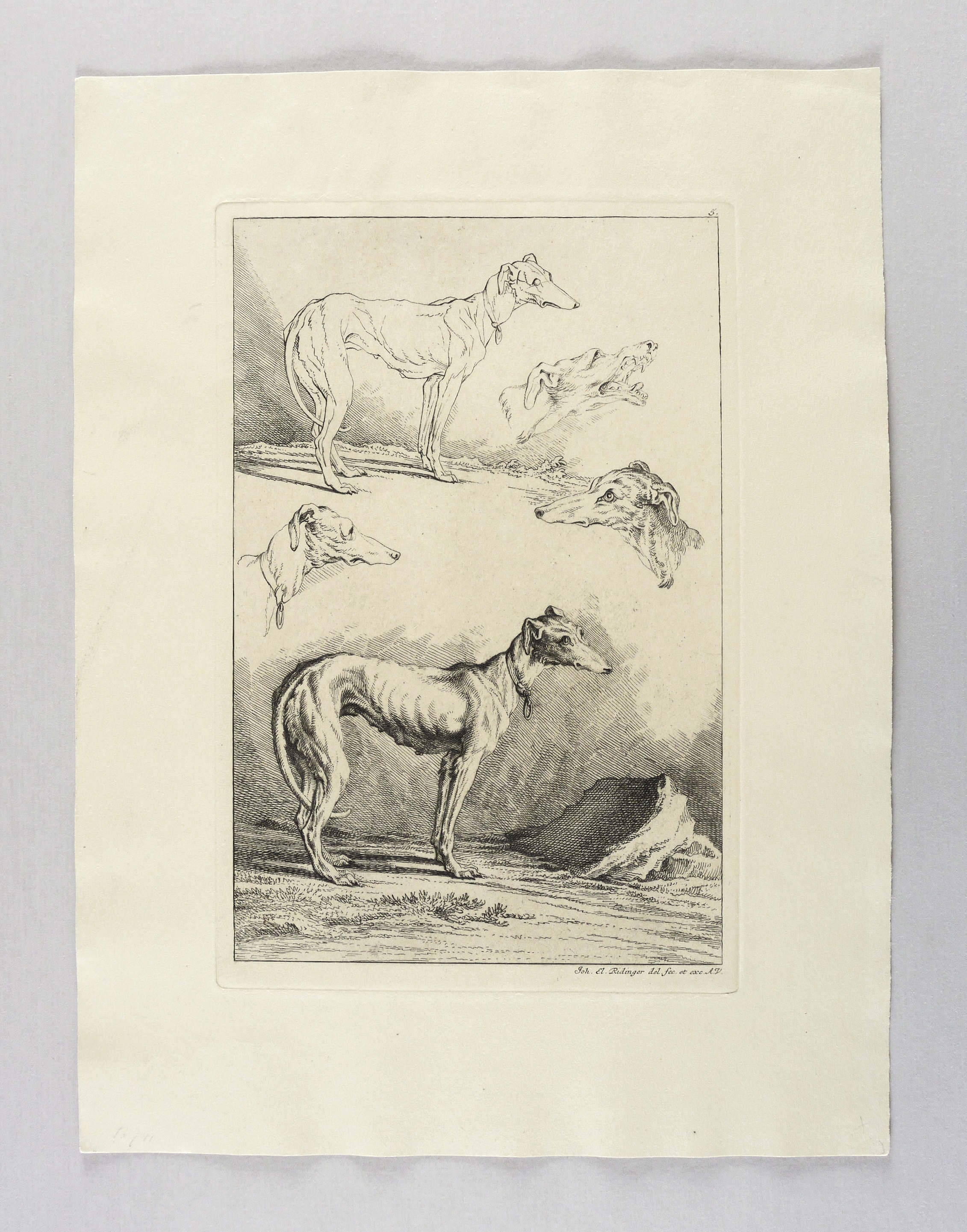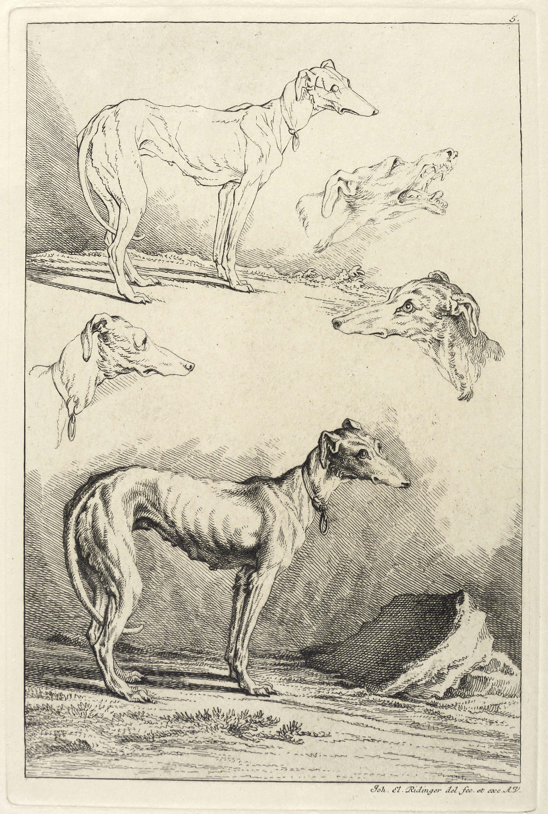 Hunde. – Windhunde. – Ridinger. – „Drei Köpfe und eine ganze Figur von Windhunden”.