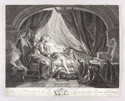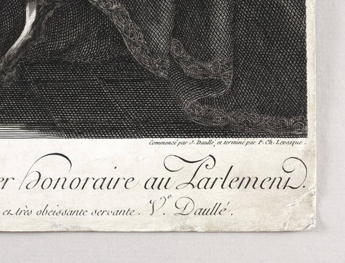 In der Platte rechts unten signiert: ″Commencé par J. Daullé, et terminé par P. Ch. Levesque.″ Unterhalb der Darstellung Titel, Dedikation und links Verlegeradresse. – Blatt bis auf den Plattenrand beschnitten und mit verschiedenen kleineren Einrissen im Randbereich. Eher mäßig guter Erhaltungszustand.
