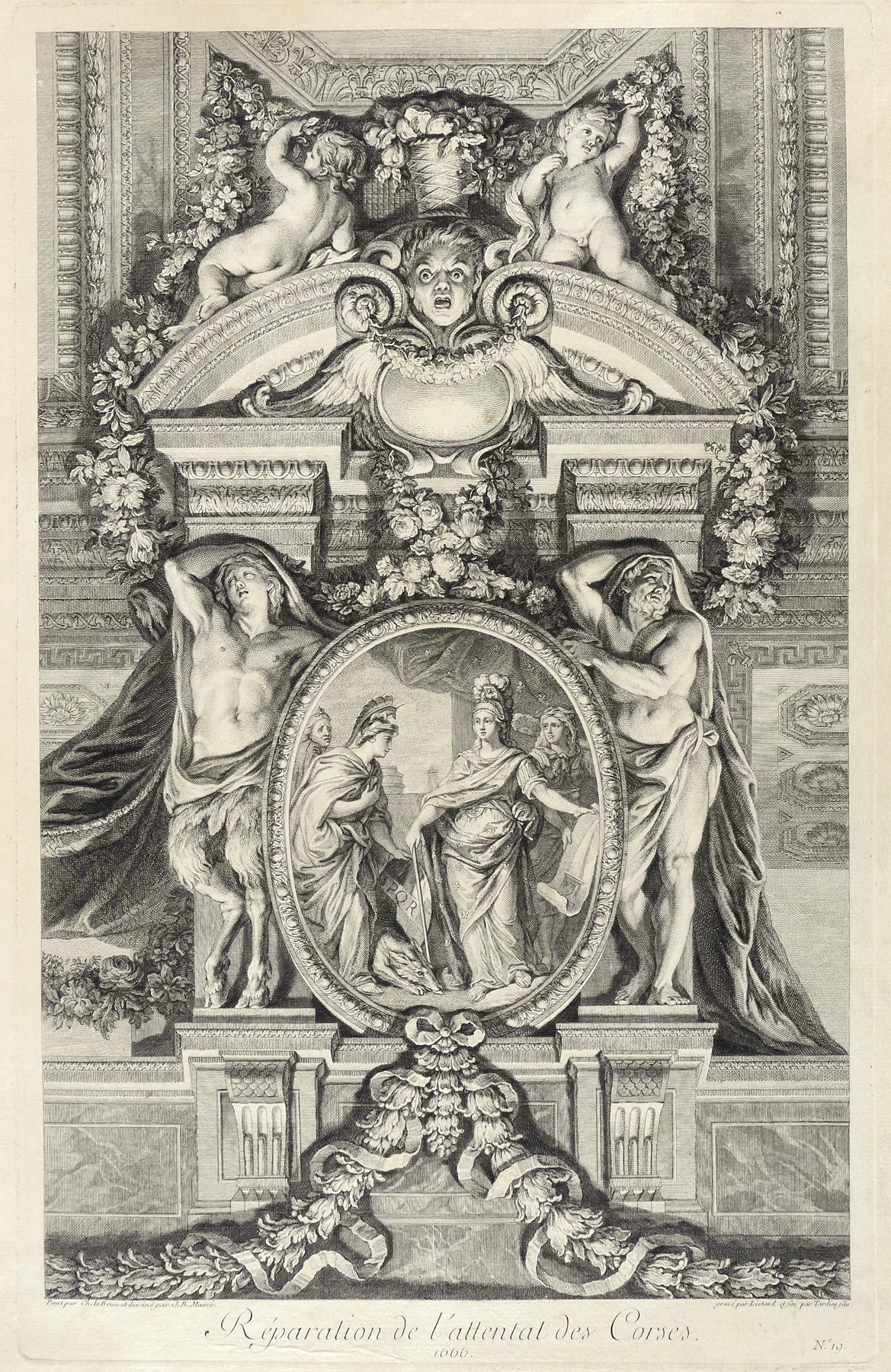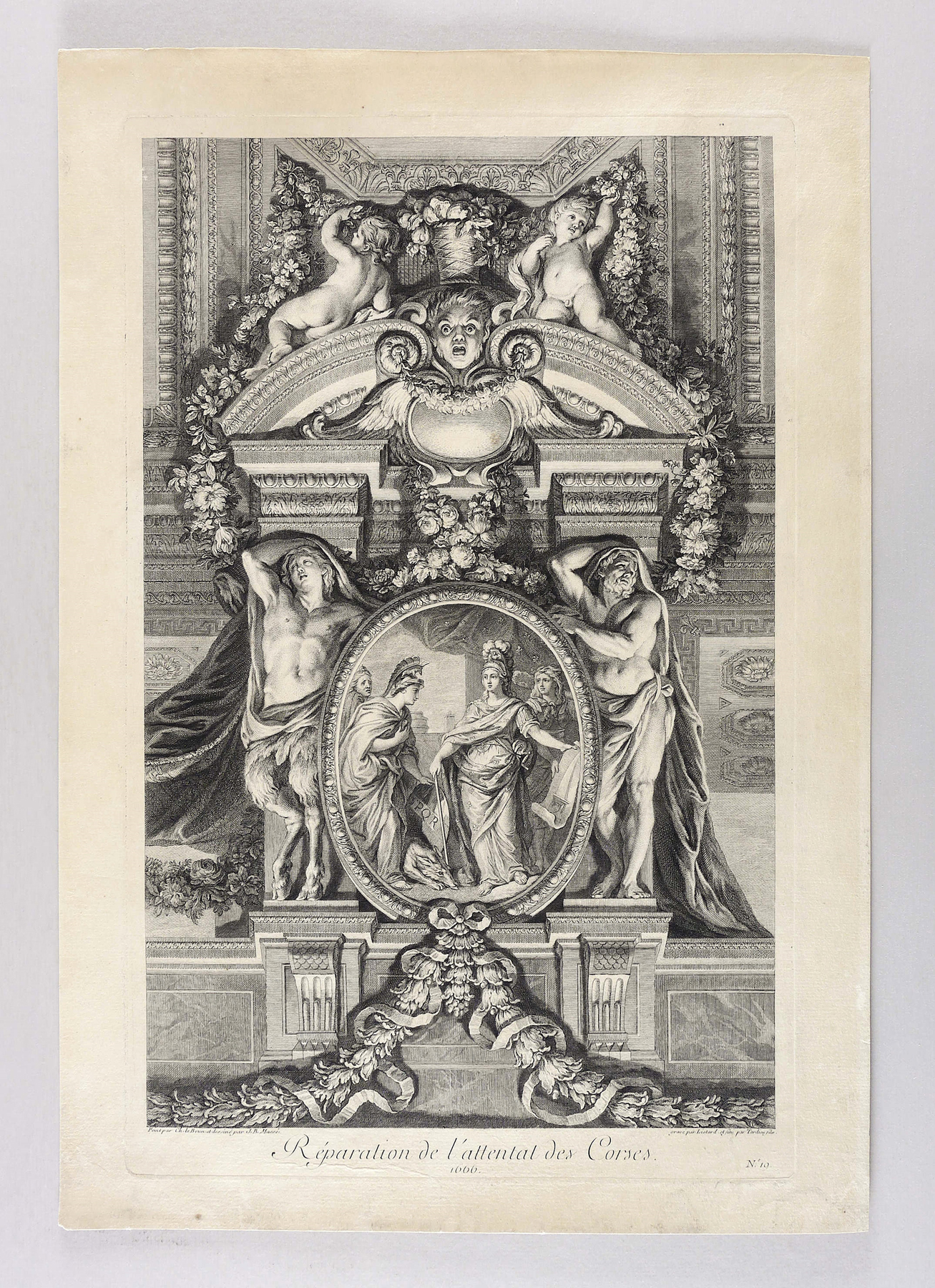 Aus: Pierre Rainssant, Grande Galerie de Versailles et les deux Salons qui l’accompagnent. peints par Charles Le Brun premier peintre de Louis XIV dessinés par Jean-Baptiste Massé Peintre et Conseiller de l’Académie Royale de Peinture et de Sculpture et gravés sous ses yeux par les meilleurs maîtres du tems (Paris: Amaulry 1753). – Rechts unten signiert: ″gravé par Liotard . et fini par Tardieu files.″ Unterhalb der Darstellung betitelt. Unten rechts nummeriert: ″N.o 10.″ – Blatt unteren rechten im Randbereich schwach fingerfleckig. Sonst guter Erhaltungszustand.