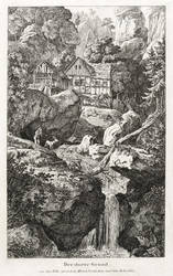 Adrian Ludwig Richter (1803 Dresden - 1884 Dresden). Bedeutender Maler, Zeichner und Grafiker der deutschen Romantik und des Biedermeier. Sohn des Zeichners und Kupferstechers Carl August Richter. Nach der Schulzeit begann er 1815 als Lehrling seines Vaters, studierte daneben an der Kunstakademie in Dresden. 1820/21 begleitete er den russischen Fürst Narischkin als Zeichner auf einer Reise nach Paris. 1823-26 reiste er nach Italien, wo er unter anderen mit Joseph Anton Koch und Julius Schnorr von Carolsfeld zusammentraf. Dies prägte seine idealistisch-harmonische Landschaftsauffassung. 1828-35 lehrte er an der Zeichenschule der Porzellanmanufaktur in Meißen, wo Gottfried Pulian zu seinen Schülern zählte. 1826 wurde er als Lehrer für Lasndschaftsmalerei an die Dresdner Kunstakademie berufen. Für die Reihe „Das malerische und romantische Deutschland“ des Leipziger Verlegers Georg Wigand schuf er die Ansichten für die Bände zu Harz, Franken und Riesengebirge. In den späten 1830er Jahren begann er mit Holzschnitt-Illustrationen für Bücher, die ihn unter einem größeren Laienpublikum in Deutschland bekannt machten. Schließlich wurde er zum Professor für Landschaftsmalerei in Dresden ernannt. 1873 musste er aufgrund eines Augenleidens mit dem Malen aufhören und schied 1876 aus der Kunstakademie in Dresden aus.