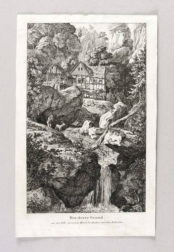 Hoff-Budde 145 H 109. – Aus: Wilhelm Adolf Lindau, Vergißmeinnicht. Ein Taschenbuch für den Besuch der sächsischen Schweiz und der angränzenden Theile Böhmens (Dresden: Arnoldische Buchhandlung 1823). – In der Platte unterhalb der Darstellung betitelt. – Blatt mit leichten Lagerspuren und kleinerem Einriss im untern Rand. Sonst aber noch guter Zustand.