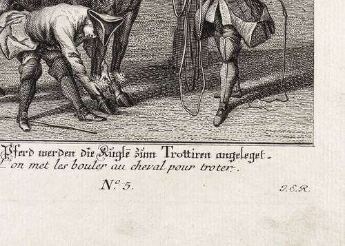 Ridinger, Johann Elias. – Kleine Reitschule. – „Dem Pferd werden die Kugle[n] zum Trottiren angelegt”.