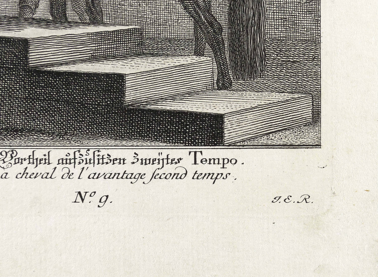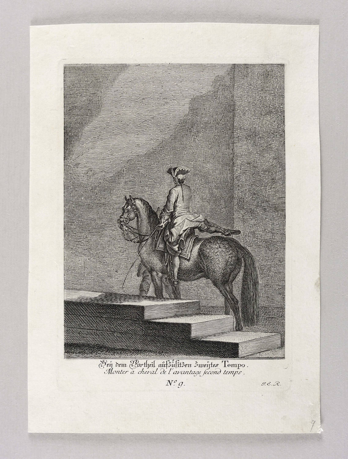 Thienemann 655. – Aus: Johann Elias Ridinger, Vorstellung und Beschreibung derer Schul und Campagne Pferden nach ihren Lectionen, In was vor gelegenheiten solche koennen gebraucht werden. (Augsburg: Johann Elias Ridinger 1760). – Unterhalb der Darstellung deutsch und französisch betitelt, dazu rechts monogrammiert: ″J.E. R.″ – Guter Zustand.