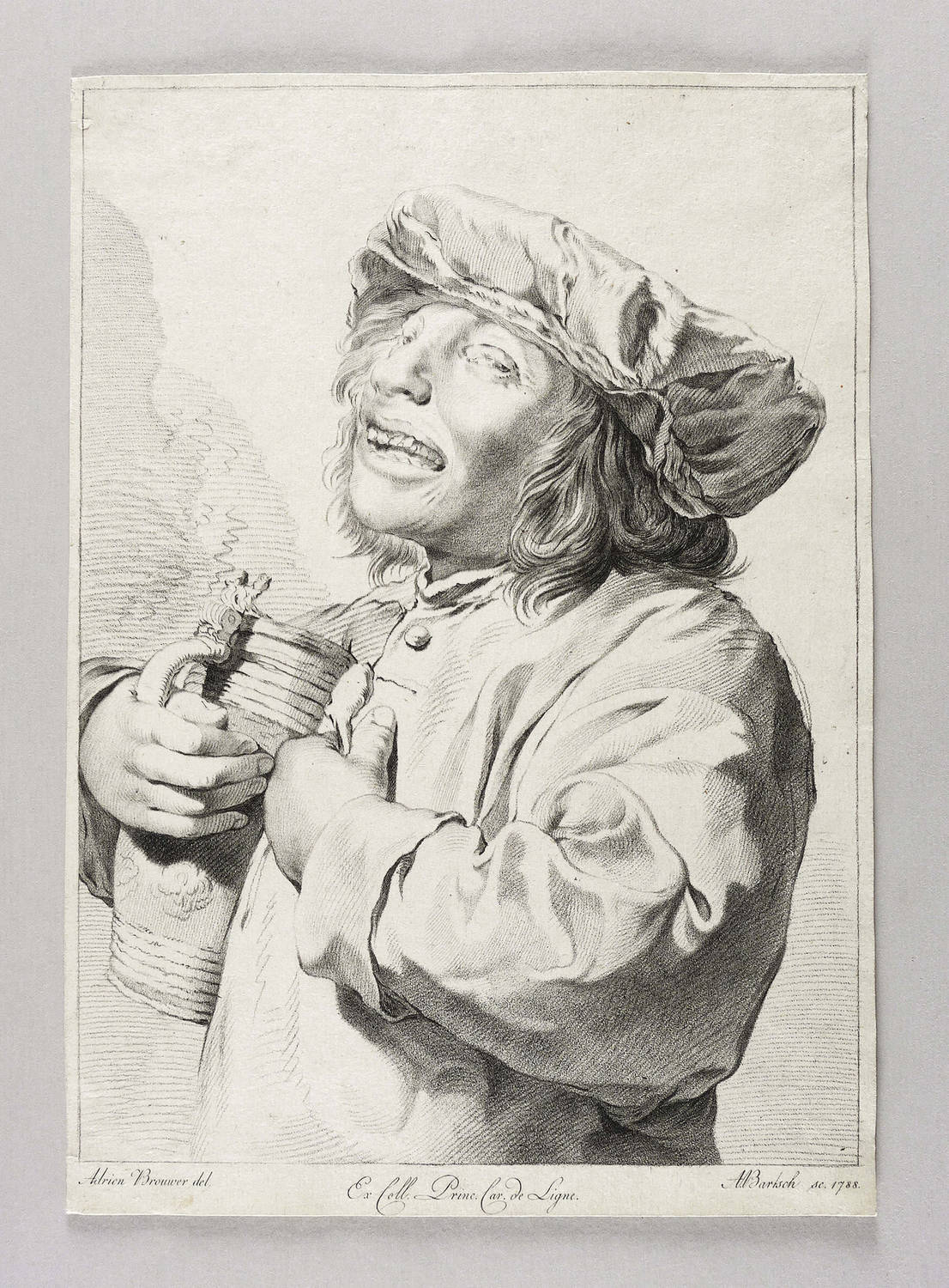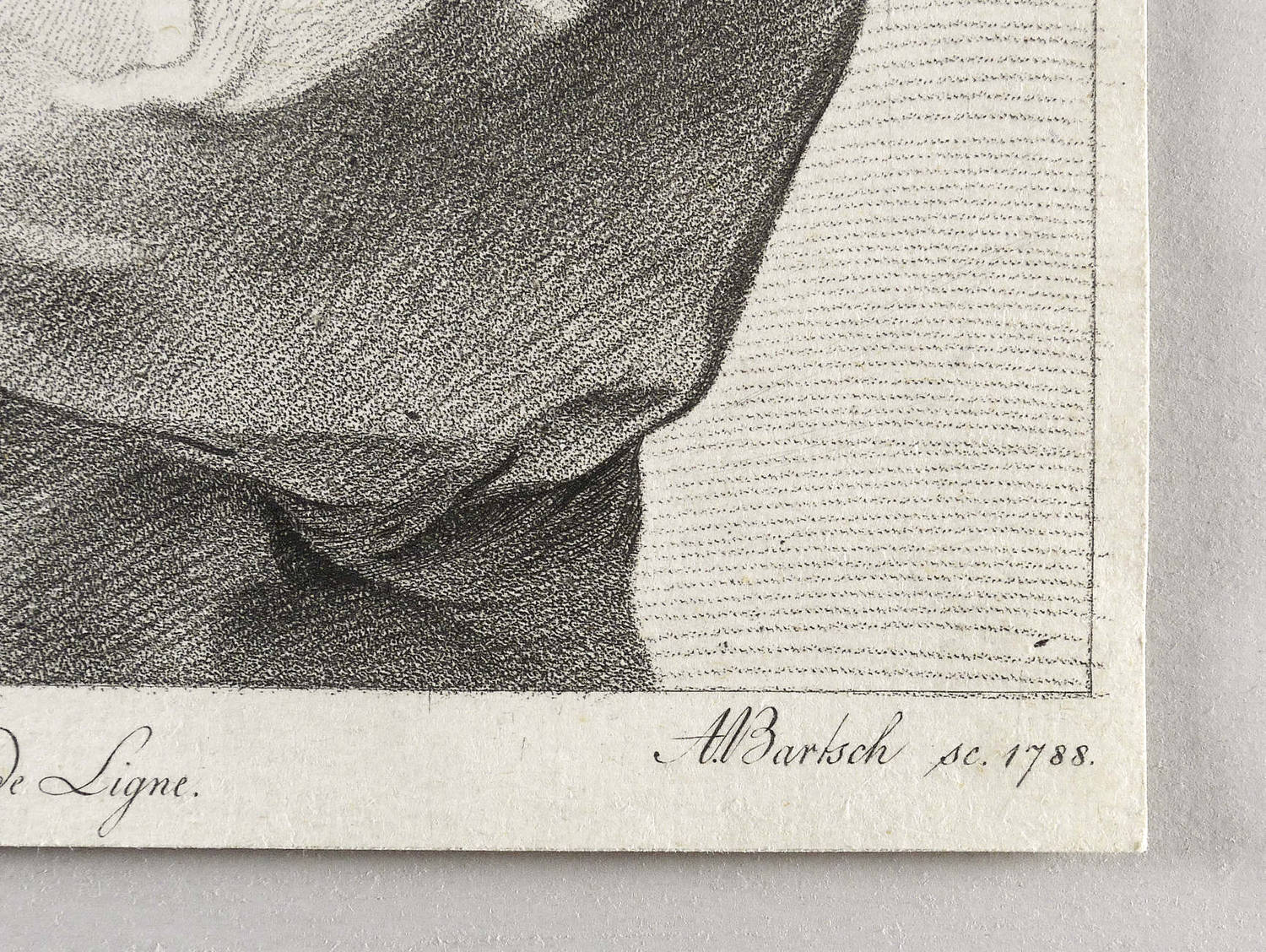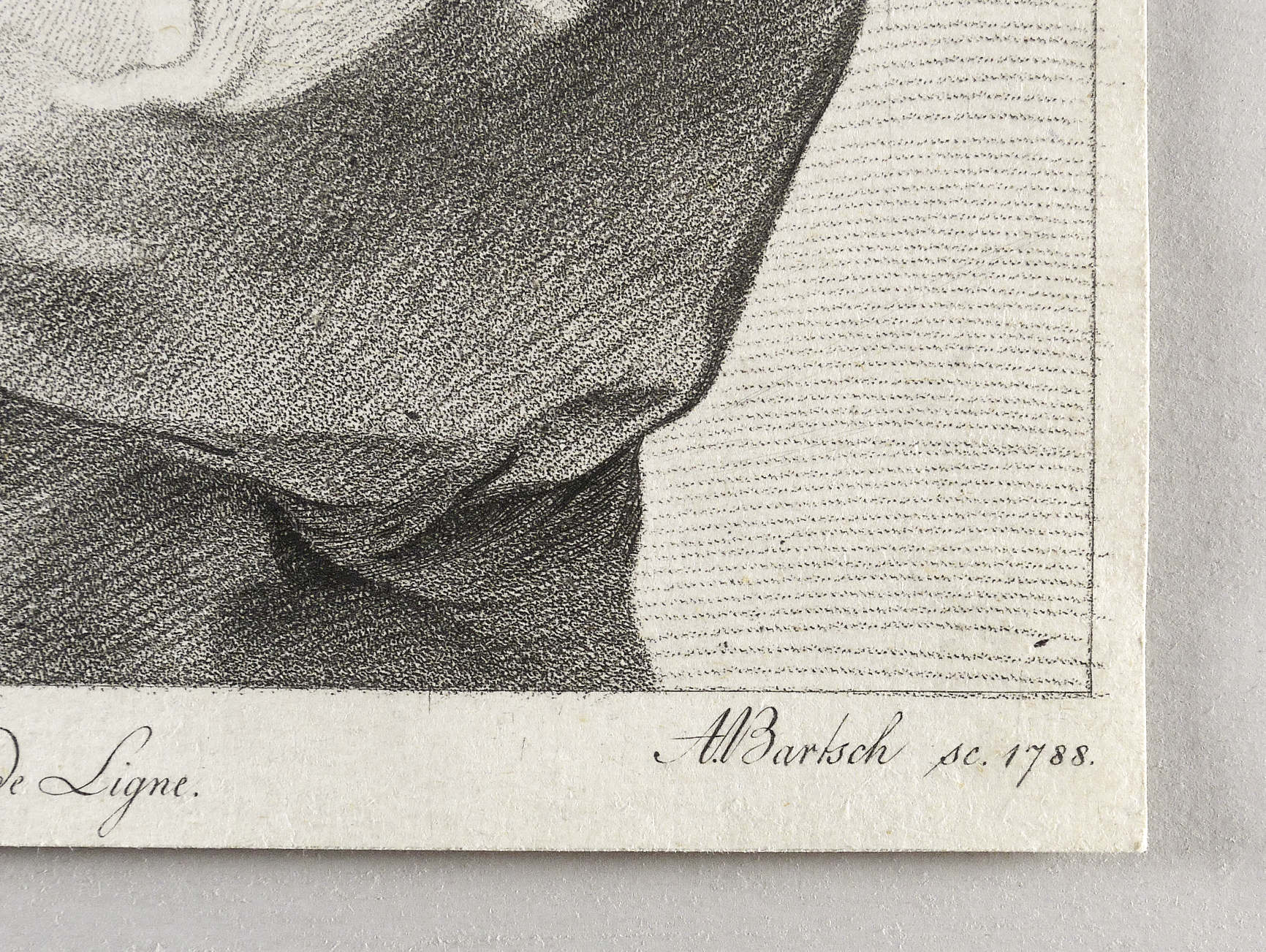 In der Platte rechts unten signiert und datiert: ″A. Bartsch sc. 1788.″ Mittig bezeichnet: ″Ex coll. Princ. Car. de Ligne.″ – Blatt bis auf den Plattenrand beschnitten. Verso mit Montageresten, teils mit leicht ausgedünntem Papier. Sonst aber guter Zustand.