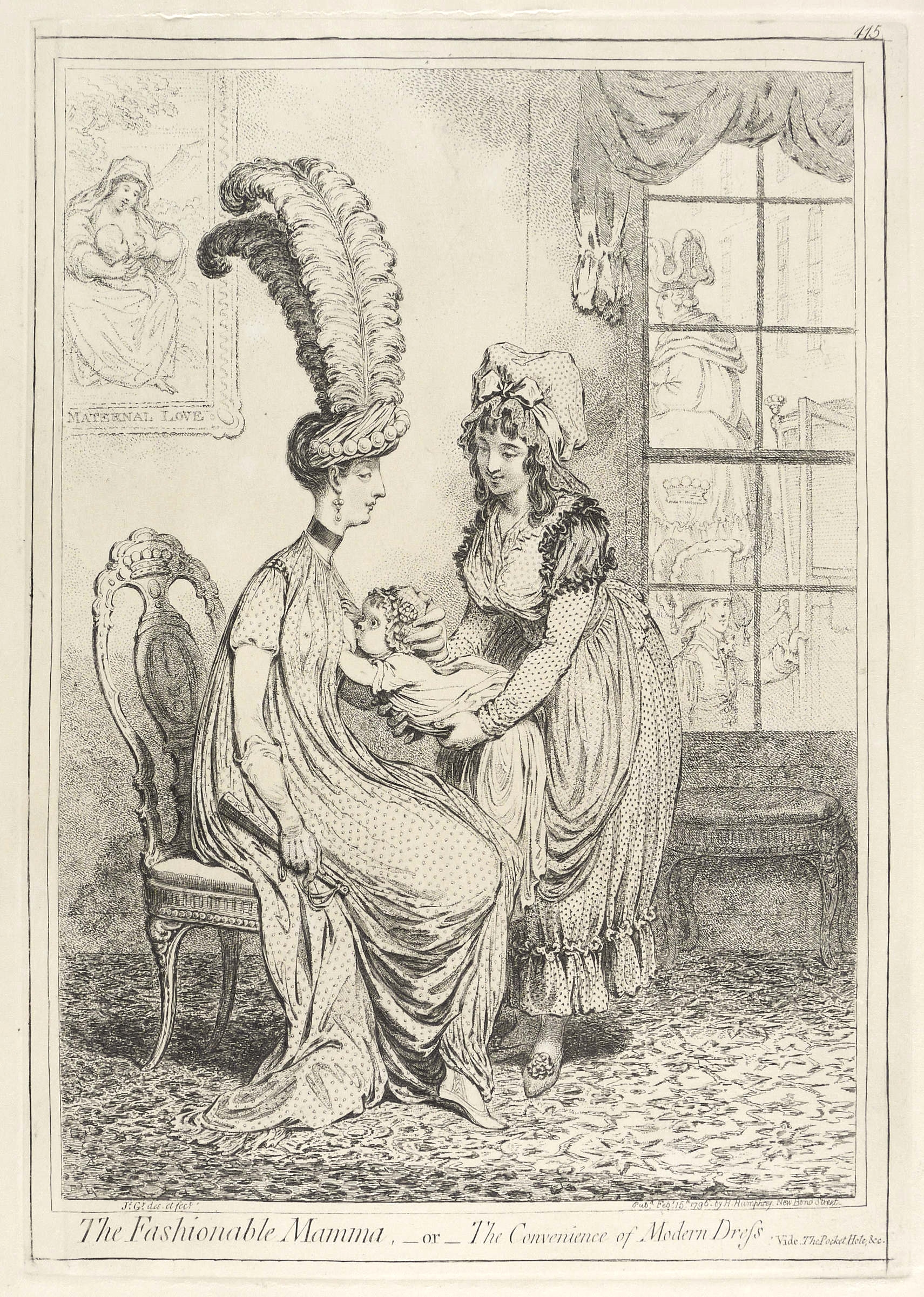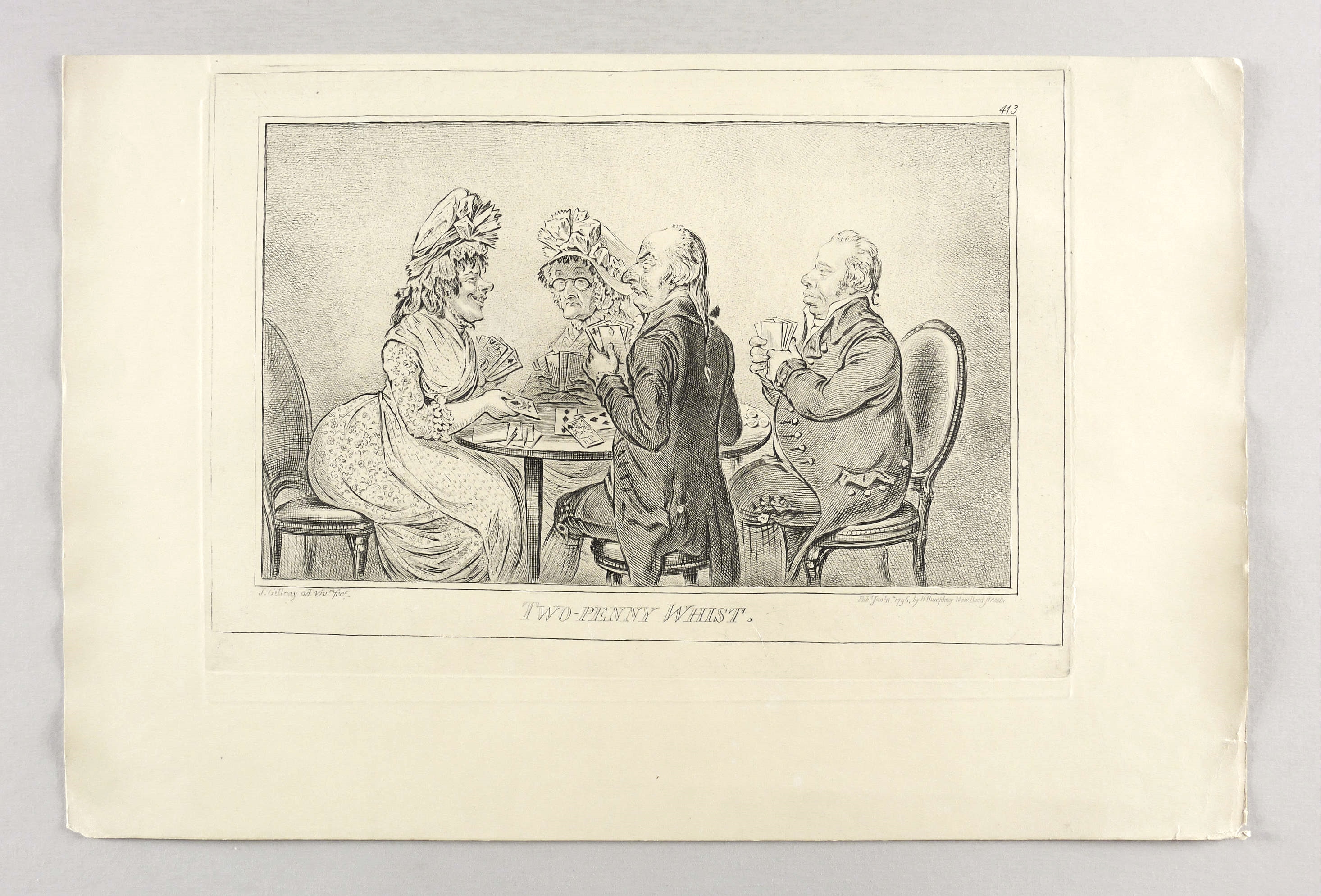 Links unten signiert: ″J. Gillray ad viv. fec.t″. Unterhalb der Darstellung Titel und rechts Verlegeradresse mit Datierung. – Verso weitere Karikatur: ″The fashionable mamma, or the convenience of modern dress″, Gillray, 1796. – Ecken leicht bestoßen. Sonst aber guter Zustand.