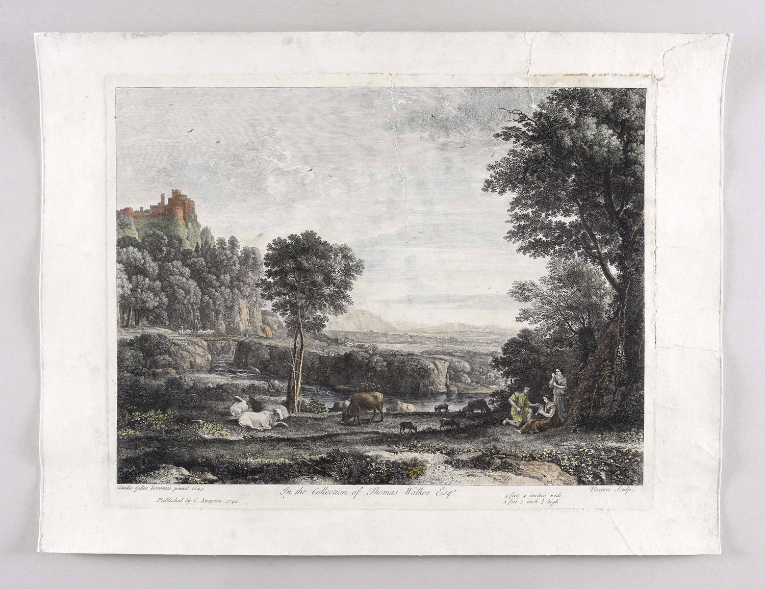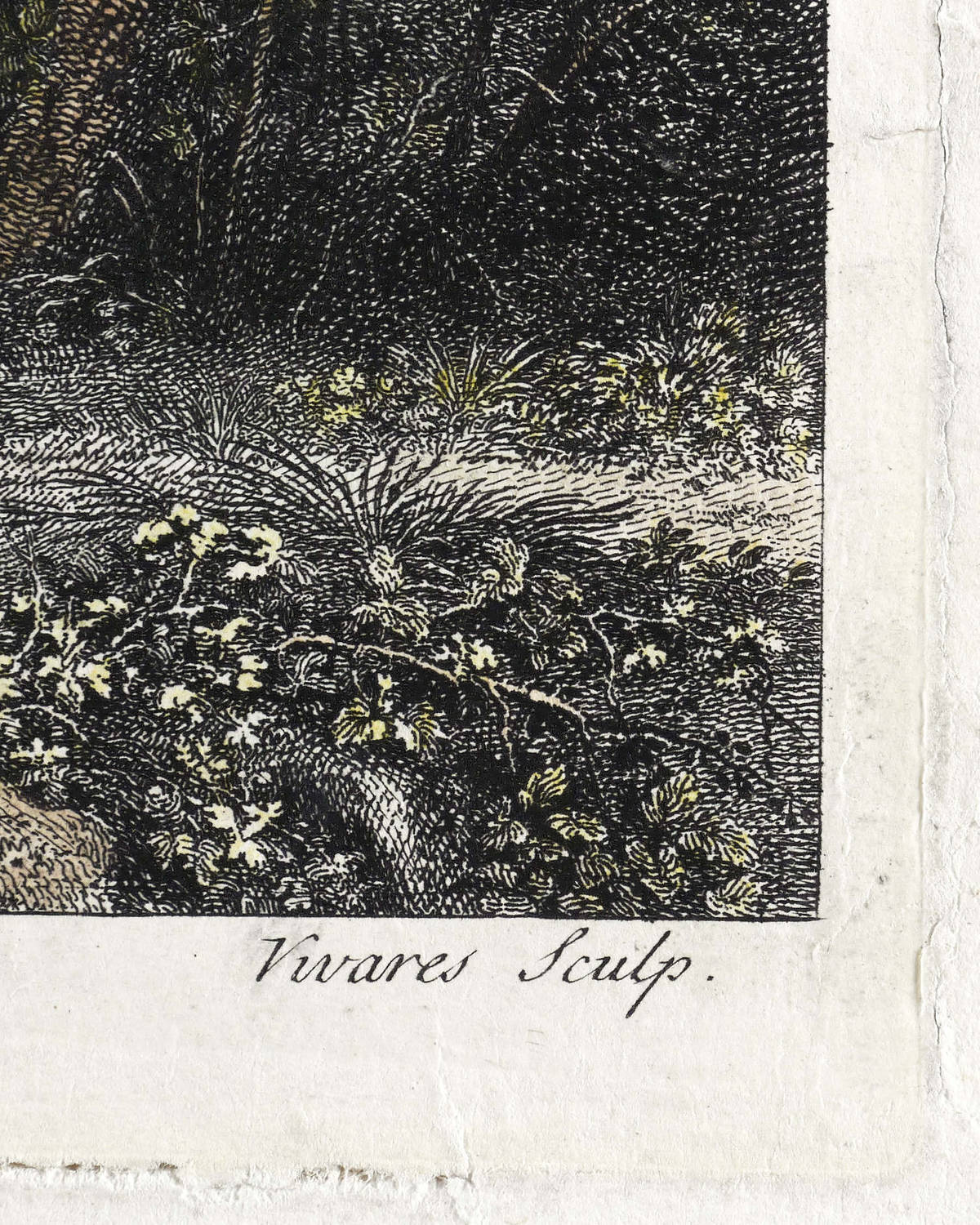 Rechts unten signiert: ″Vivares sculp.″. Links unterhalb der Darstellung Verlegeradresse mit Datierung. – Blatt zur Stabilisierung aufgezogen. Größere Fehlstellen im rechten oberen Rand. Insgesamt mäßig guter bis mangelhafter Zustand.