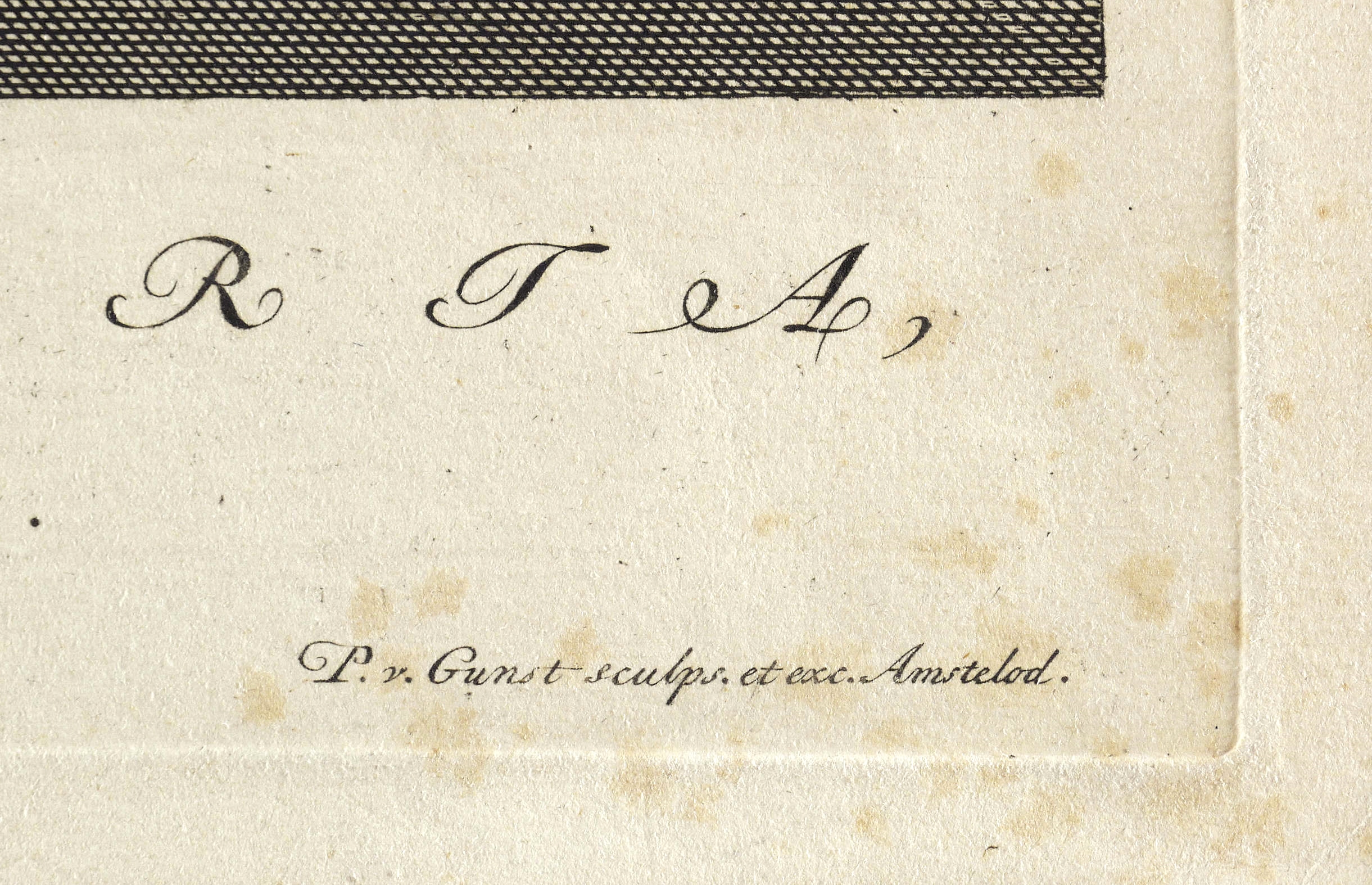 In der Platte rechts unten signiert: ″P. v. Gunst sculps et exc Amstelod″. Unterhalb der Darstellung betitelt. – Blatt mit leichten Lagerspuren und vereinzelt schwach fleckig. Sonst aber guter Zustand.