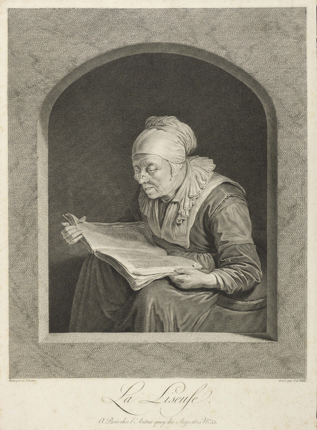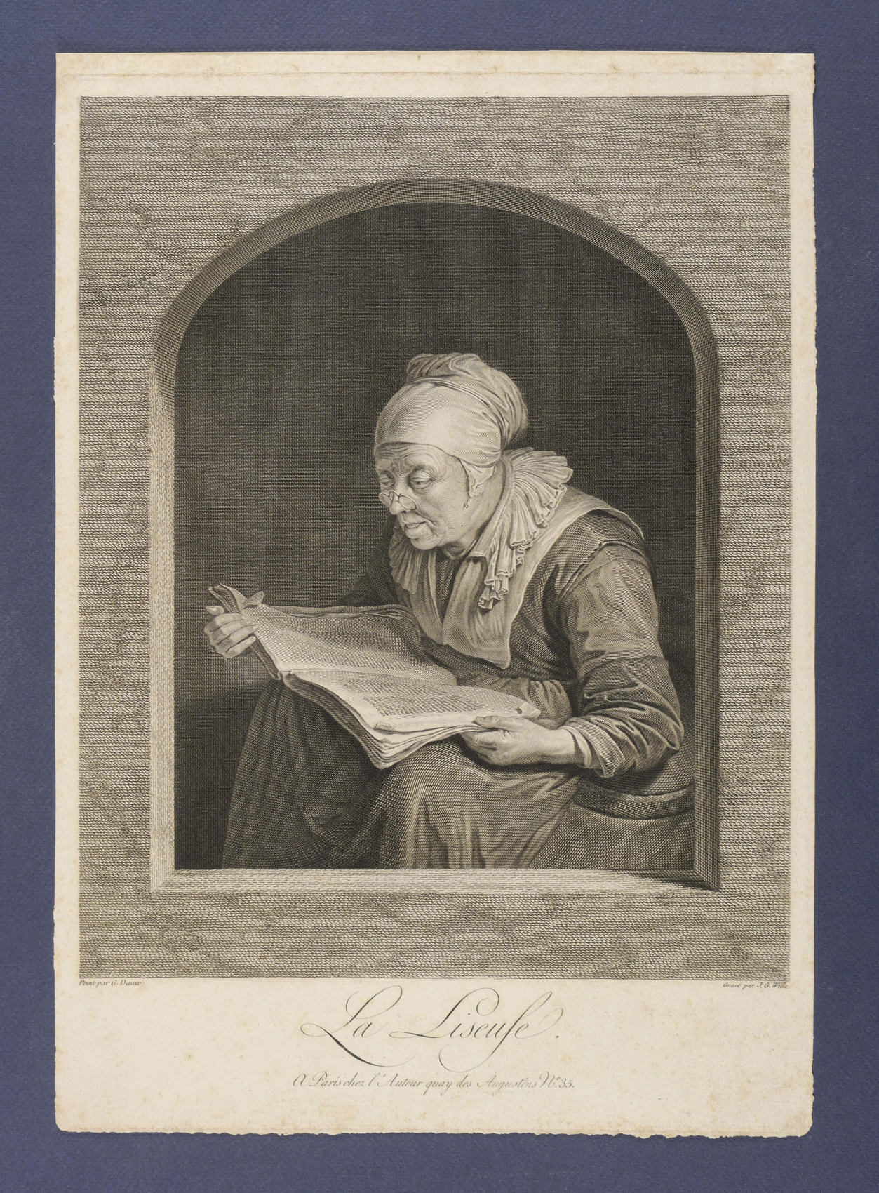 Wille, Johann Georg. – Nach Gerard Dou. – „La Liseuse. Die Vorleserin”.