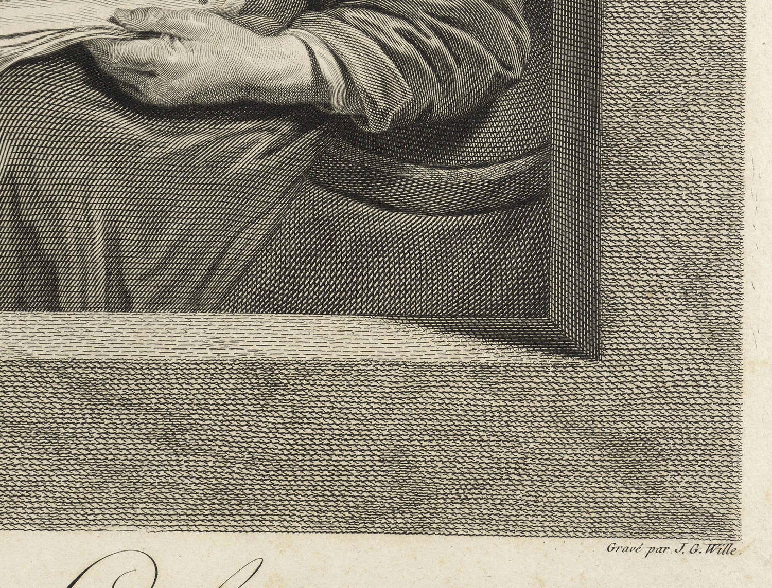 In der Platte rechts unten signiert und datiert: ″Gravé par J.G. Wille.″ Unten mittig Titel sowie Verlegeradresse von Wille. – Oben mit schmalem Rand um die Platte, seitlich und unten auf die Plattenkante geschnitten bzw. gerissen. Papier altersbedingt fleckig. Insgesamt nur mäßig guter Erhaltungszustand.
