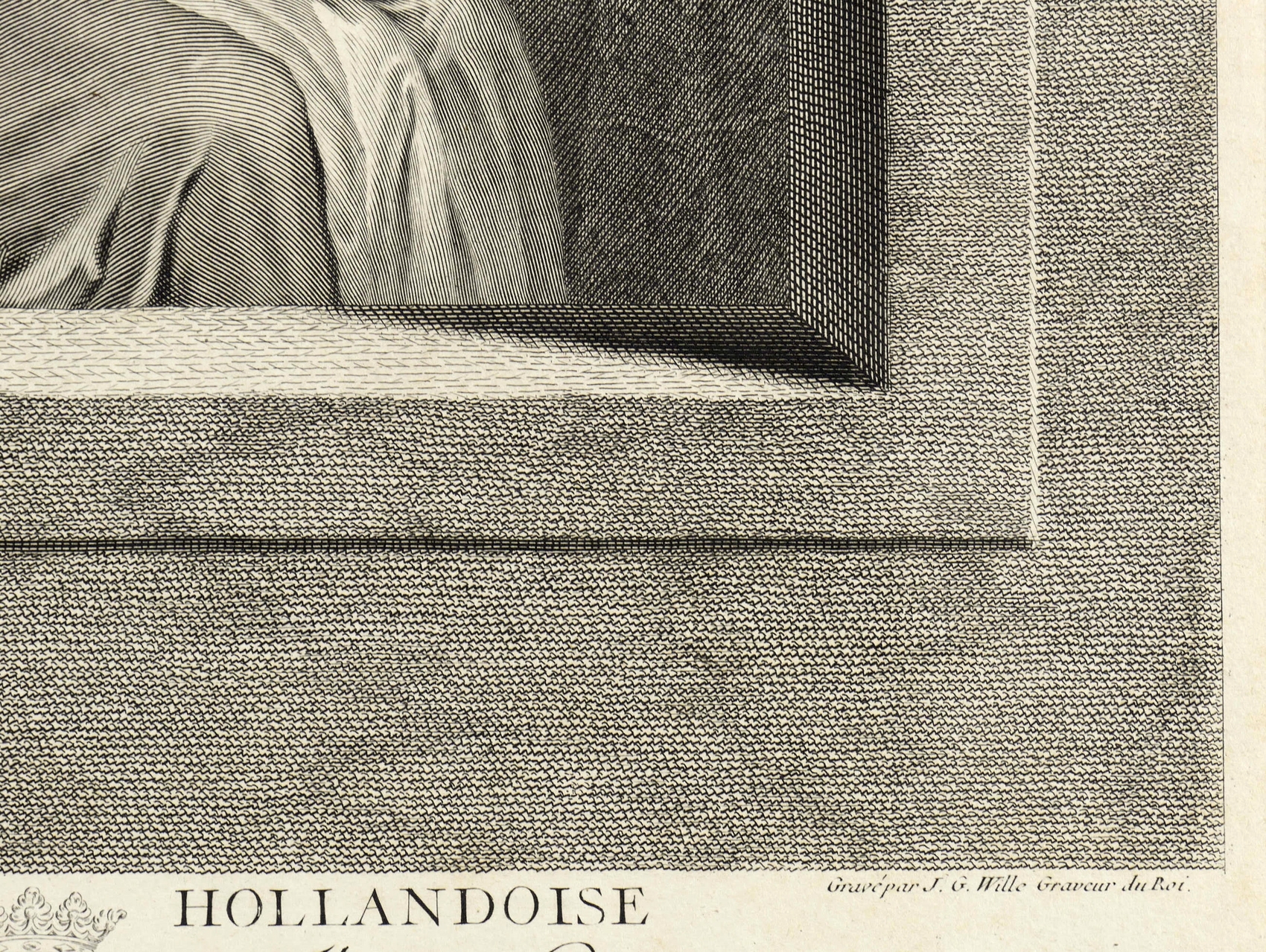 Le Blanc 64 II. – In der Platte rechts unten signiert und datiert: ″Grave par J.G. Wille Graveur du Roi. 1766.″ Unten mittig Titel sowie Dedikation und Verlegeradresse von Wille. – Ausreichender Rand um die Platte. Papier altersbedingt geringfügig fleckig. Insgesamt aber noch sehr guter Erhaltungszustand.
