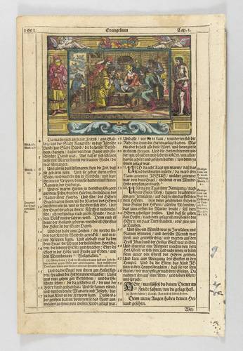 Aus: Biblia. Das ist: die gantze Heilige Schrifft, Altes und Neues Testaments (Nürnberg: Christoph Endter 1656). – Oberhalb typografisch bezeichnet. – Verso weiterer Holzschnitt mit der Taufe des Johannes. – Im rechten Rand Wurmfraß. Papier geringfügig gebräunt und fleckig. Insgesamt mäßig guter Zustand.
