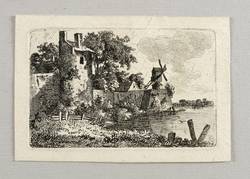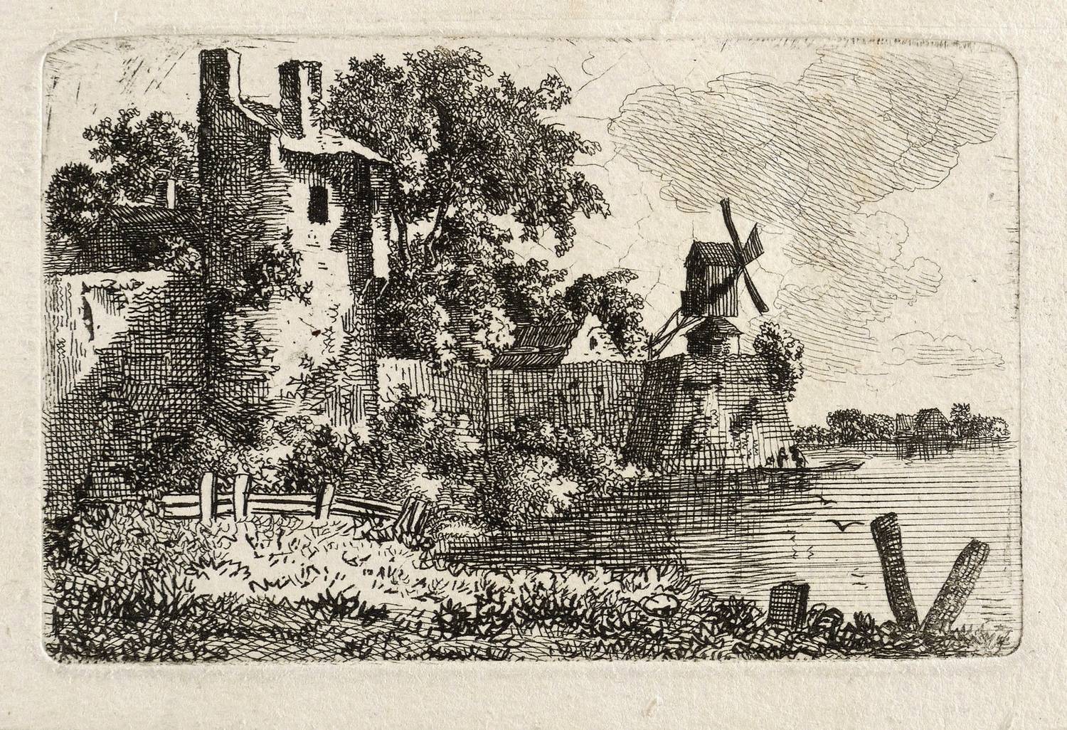 Rümann 34. Fröhlich G 34. – Verso in Bleistift von diversen Händen bezeichnet und nummeriert: ″Flußlandschaft mit Mauerturm und Windmühle // 32 // Rüm. 34″. – Mit schmalem Rand um die Platte. Rückseitig leichte Montagereste. Schön erhalten. Guter Zustand.