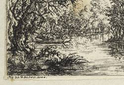 Aus: Christian Ludwig von Hagedorn, Landschaften und Köpfe in Kupfer geätzet (1745). – In der Platte links unter der Darstellung bezeichnet ″No. 31. d. 11. Dec. 1744.″ Rechts monogrammiert ″HvD.″ – Aus einer thüringischen Grafik-Sammlung des frühen 19. Jahrhundert. – Mit schmalem Rändchen um die Darstellung. Auf die Plattenkante beschnitten. Alt auf Trägerbüttenpapier (1824-54, Papiermühle Christian Friedrich Hempel in Stadtroda) gesetzt. Insgesamt guter Zustand.