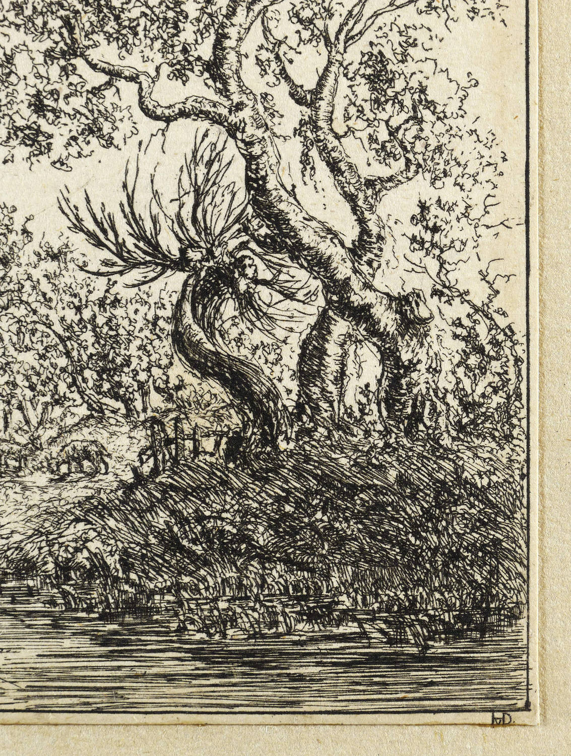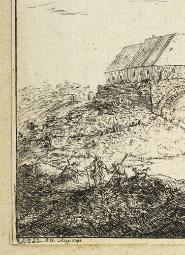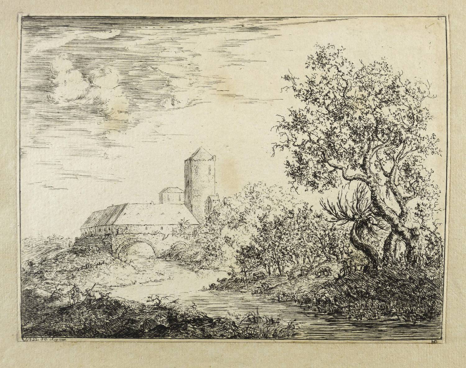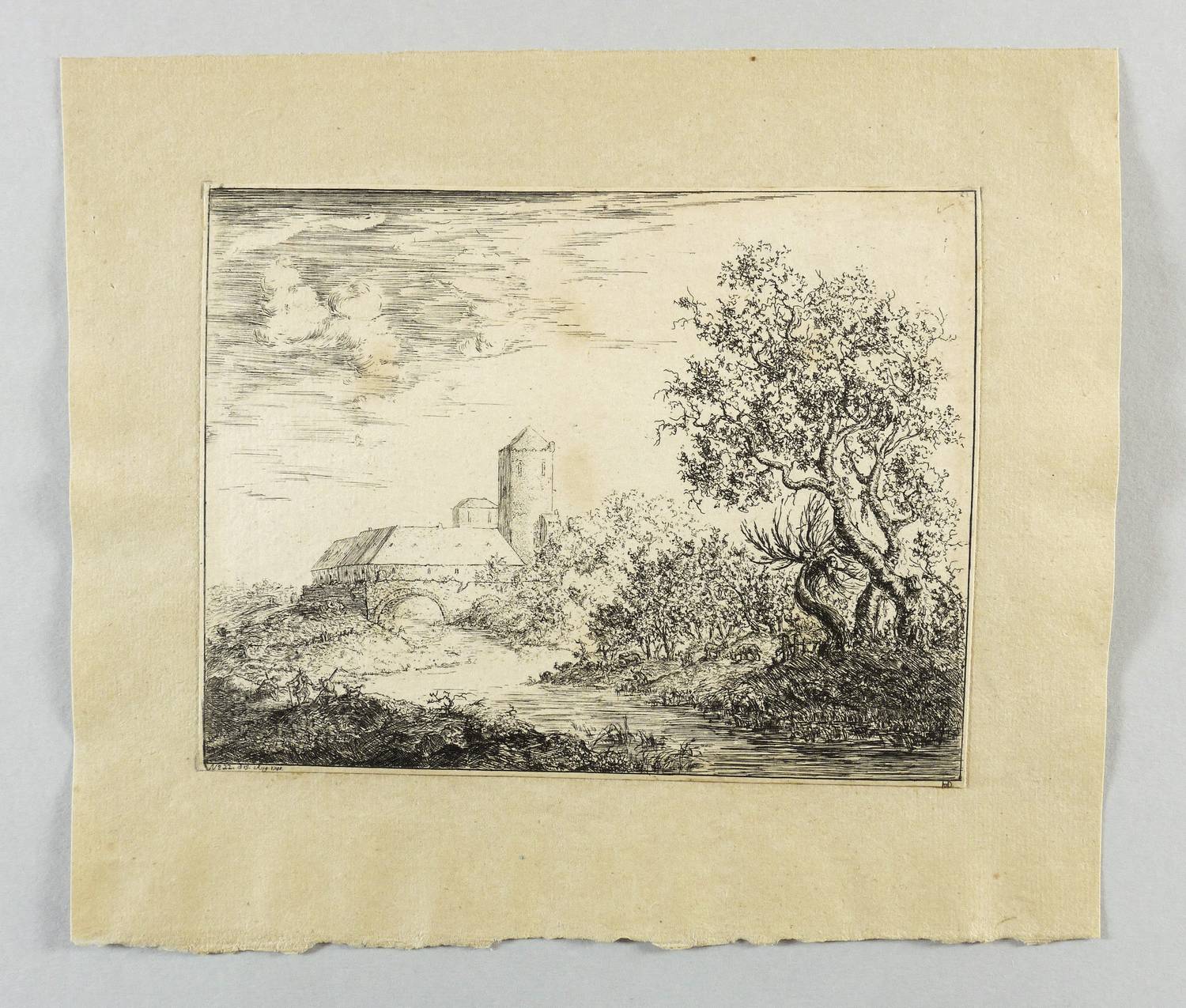 Aus: Christian Ludwig von Hagedorn, Landschaften und Köpfe in Kupfer geätzet (1745). – In der Platte links unter der Darstellung bezeichnet ″No. 22. d. 15. Aug. 1744.″ Rechts monogrammiert ″HvD.″ – Aus einer thüringischen Grafik-Sammlung des frühen 19. Jahrhundert. – Mit schmalem Rändchen um die Darstellung. Auf die Plattenkante beschnitten. Alt auf Trägerbüttenpapier (1824-54, Papiermühle Christian Friedrich Hempel in Stadtroda) gesetzt. Insgesamt guter Zustand.