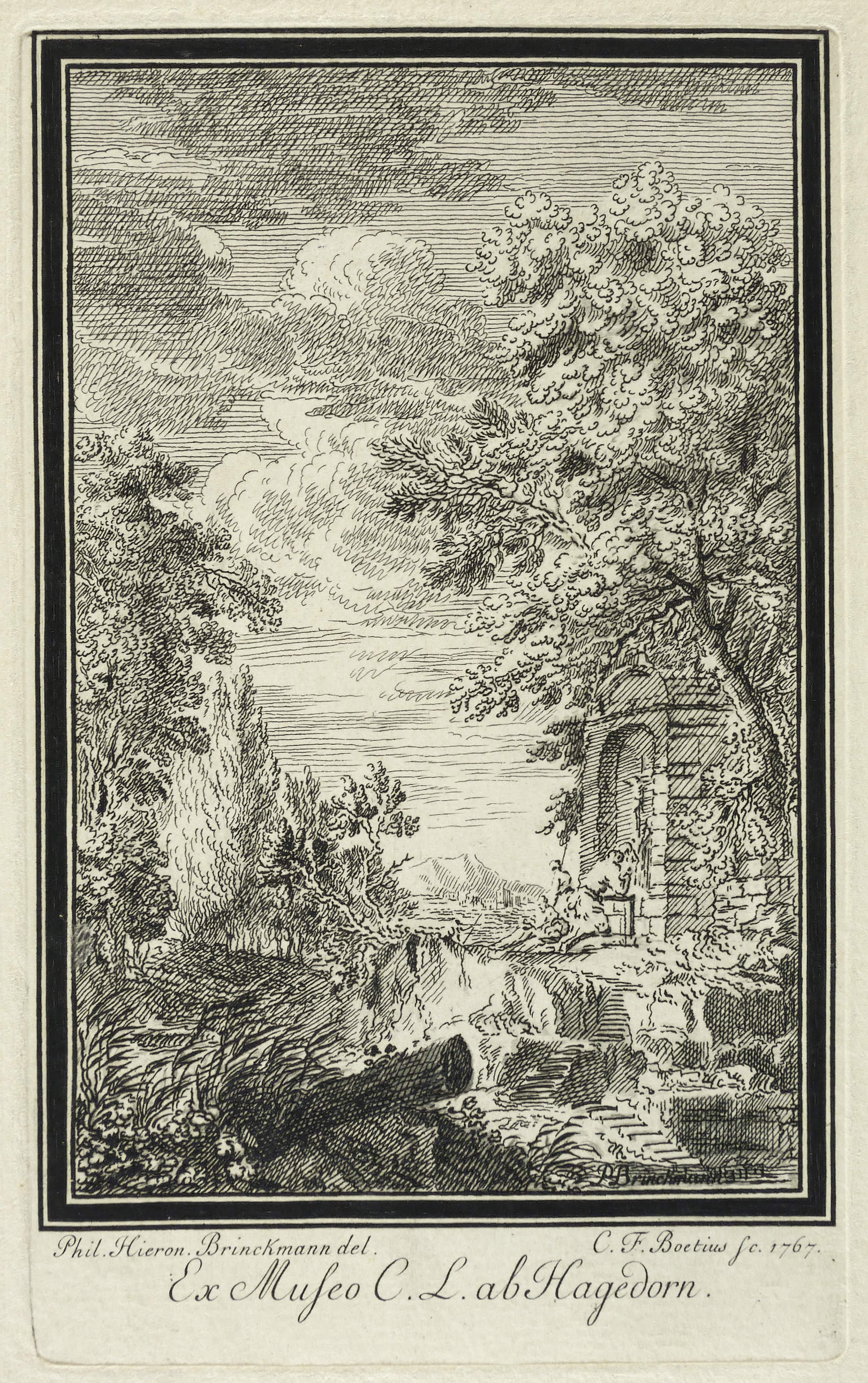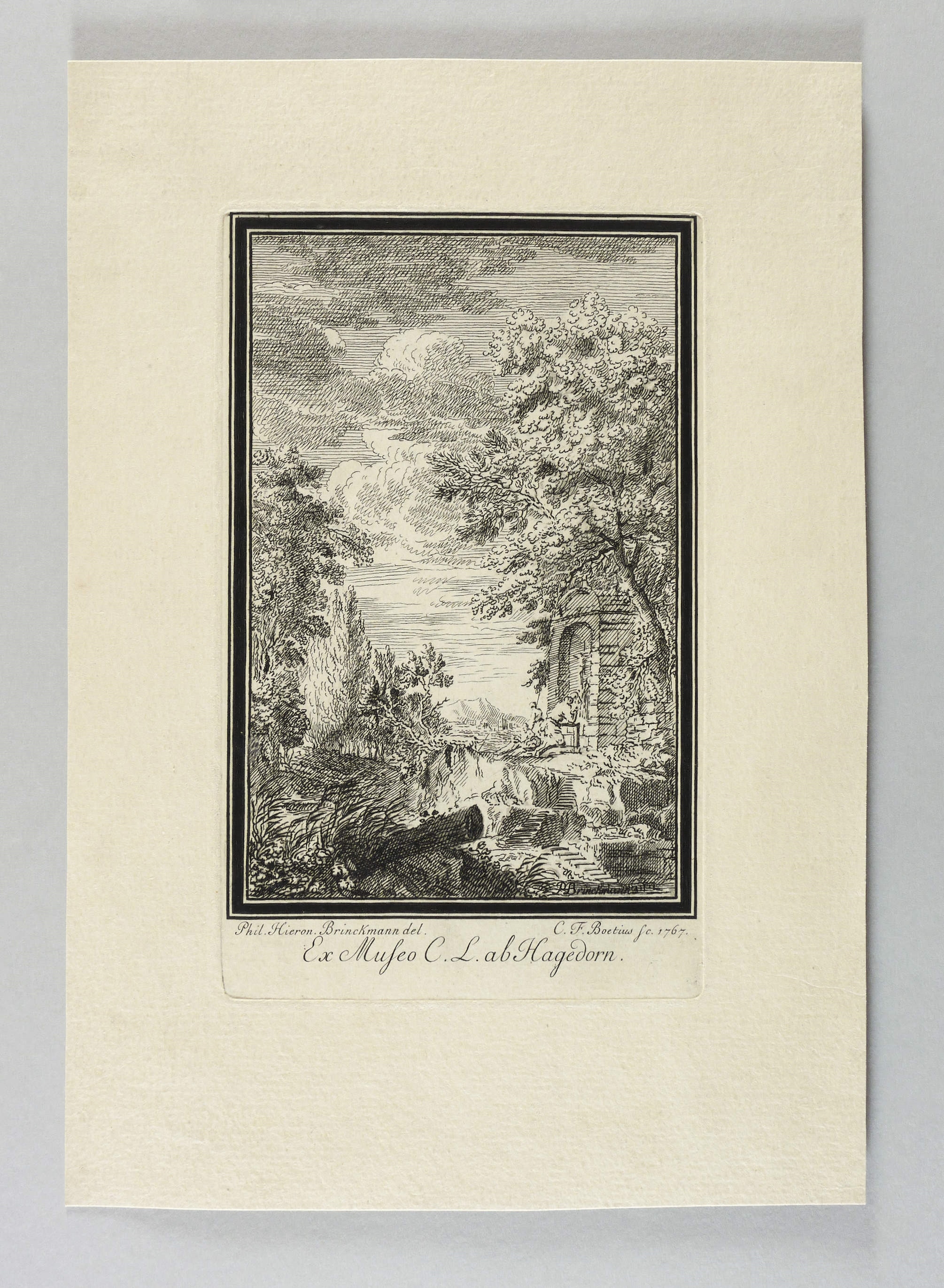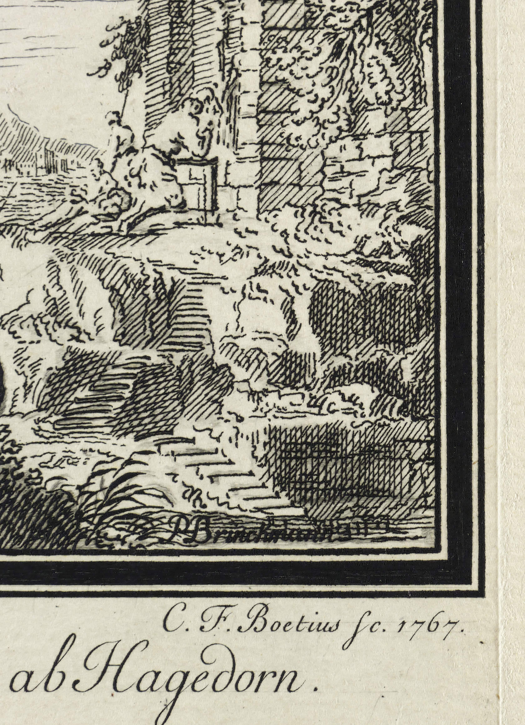 In der Platte rechts unterhalb der Darstellung signiert und datiert: ″C.F. Boetius sc. 1767″. Mittig bezeichnet: ″Ex Museo C.L. ab Hagedorn.″ – Breiter Rand um die Platte. Keine Mängel. Sehr guter Zustand.