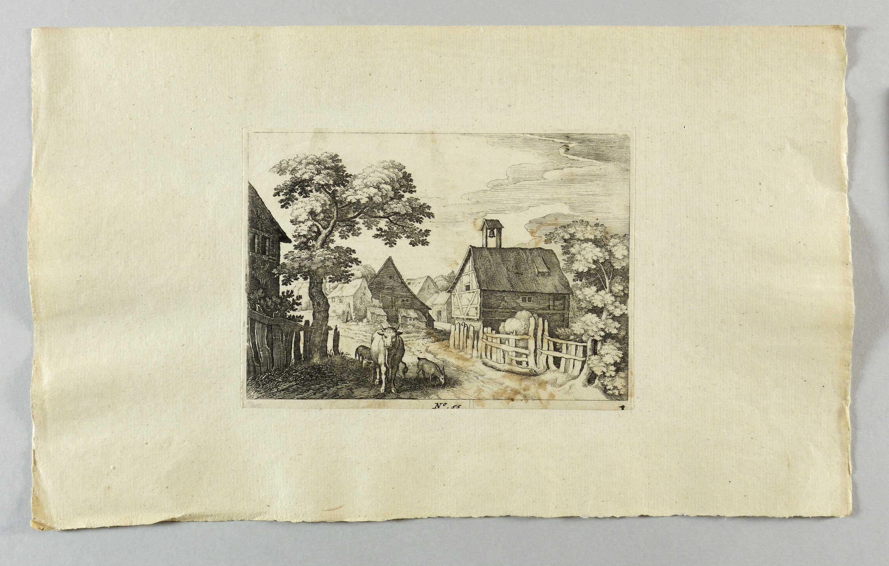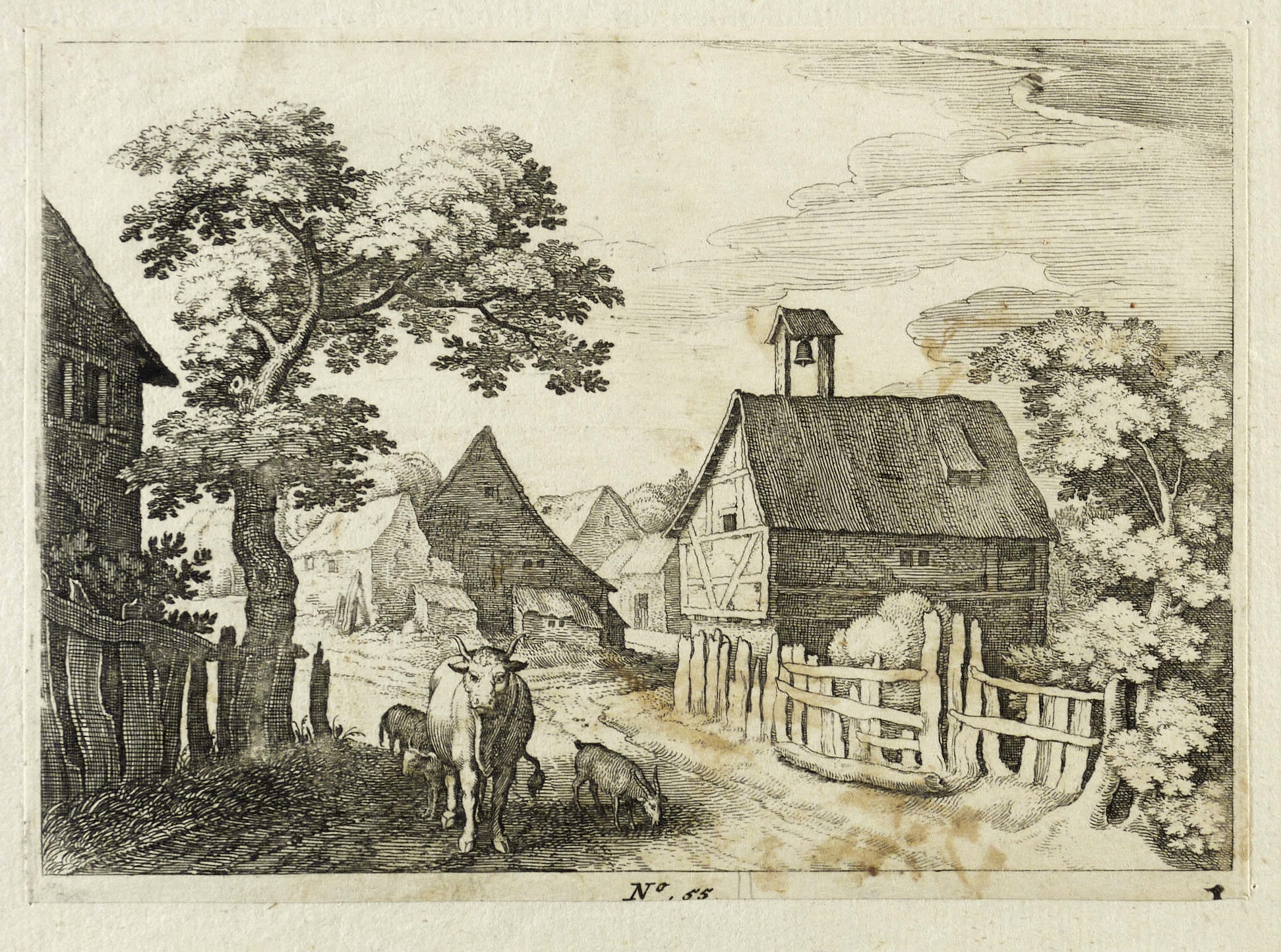 Merian, Matthäus d.Ä. – Schwalbacher Reise. – nach Anton Mirou. – „Dorfstraße mit Kuh von vorn”.
