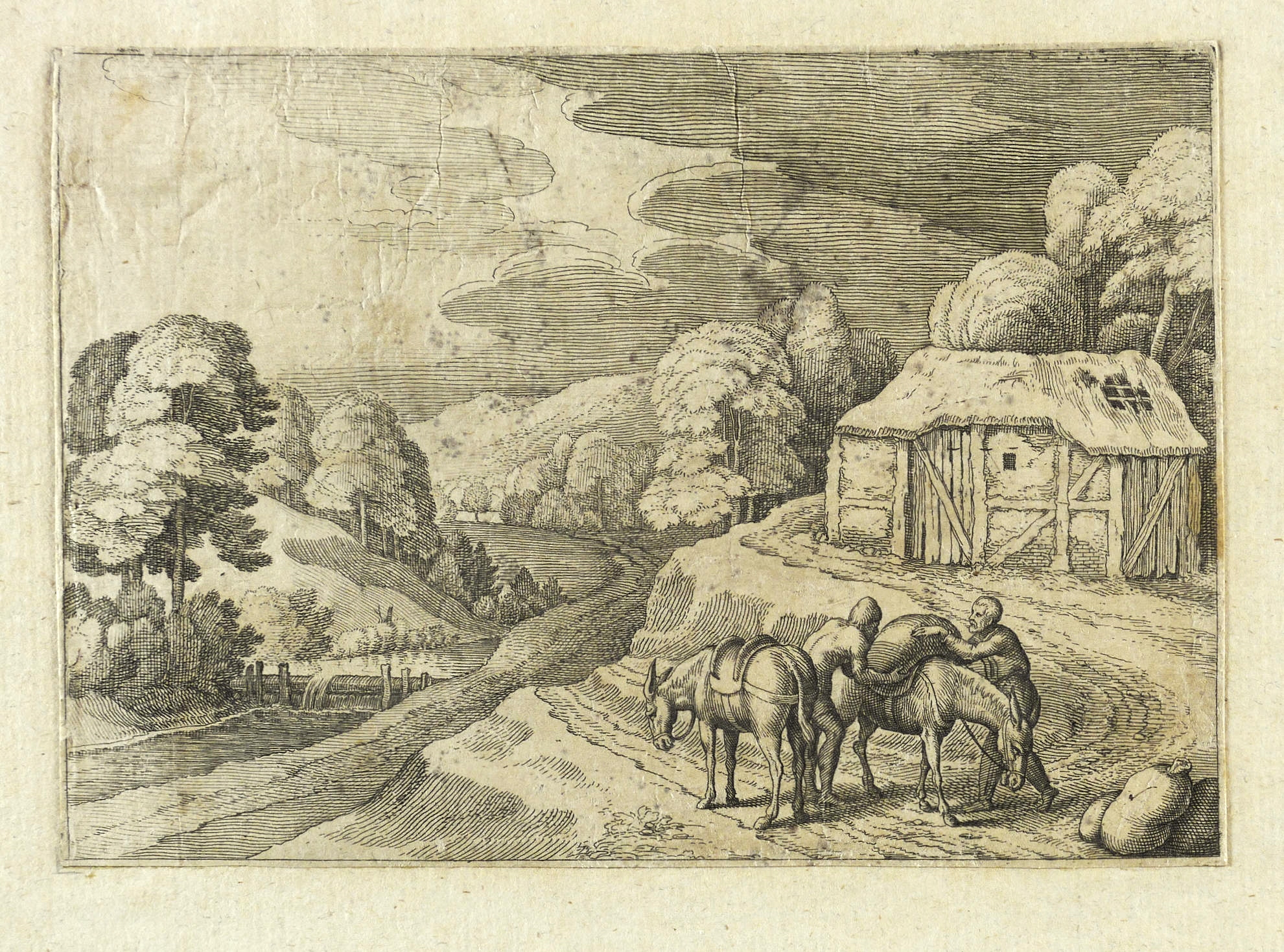 Merian, Matthäus d.Ä. – Schwalbacher Reise. – nach Anton Mirou. – „Männer beladen zwei Maulesel mit Säcken”.