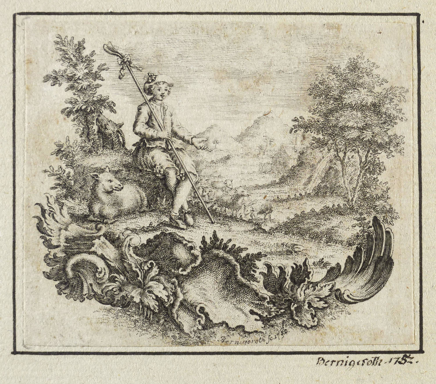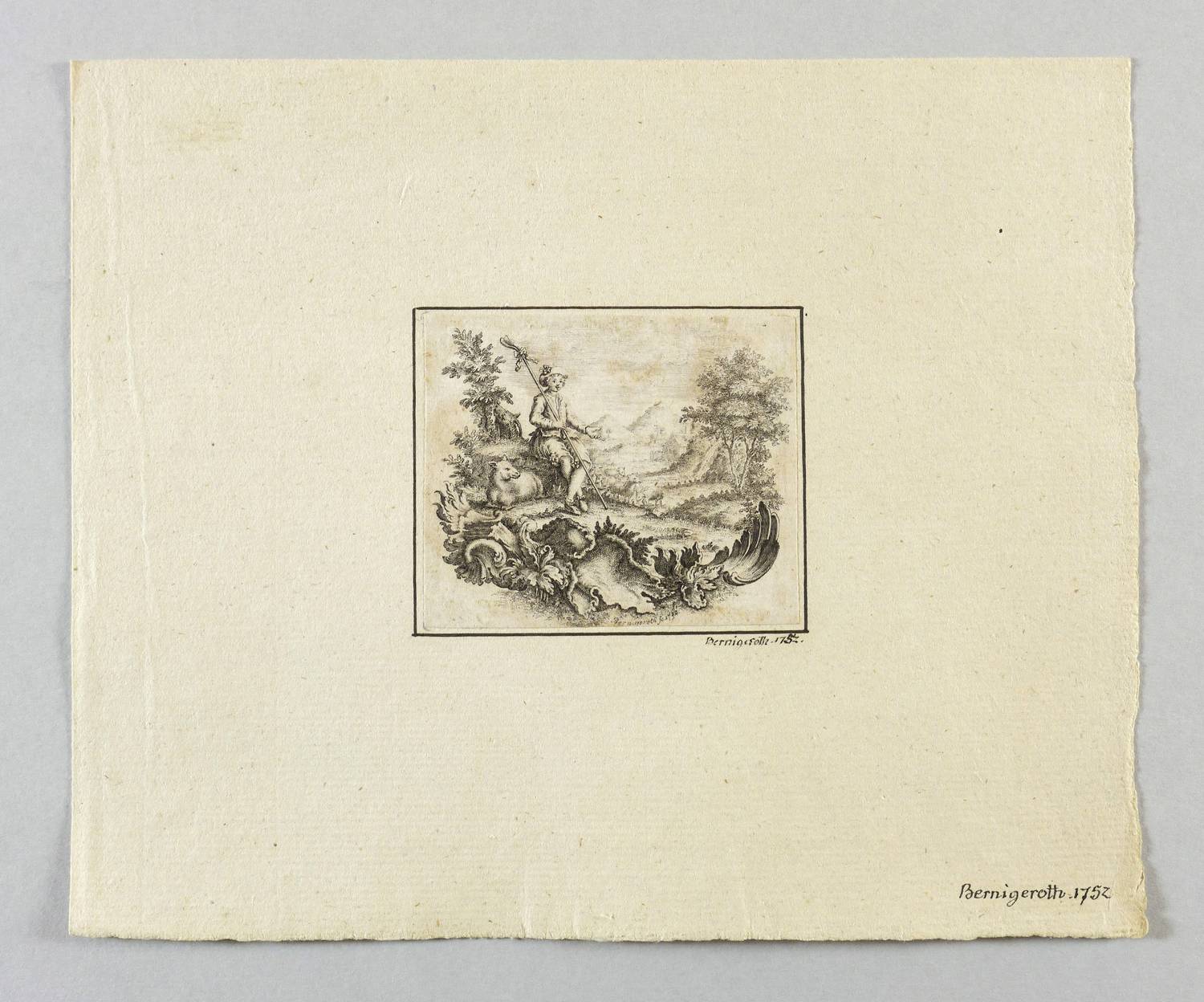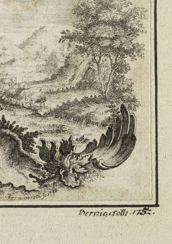 1752. Radierung / Strichätzung. – Originale Künstlergrafik, von Johann Martin Bernigeroth. – 17,5 x 21 cm (Trägerblatt), 6,2 x 7,4 cm (Darstellung / Blatt).