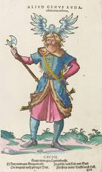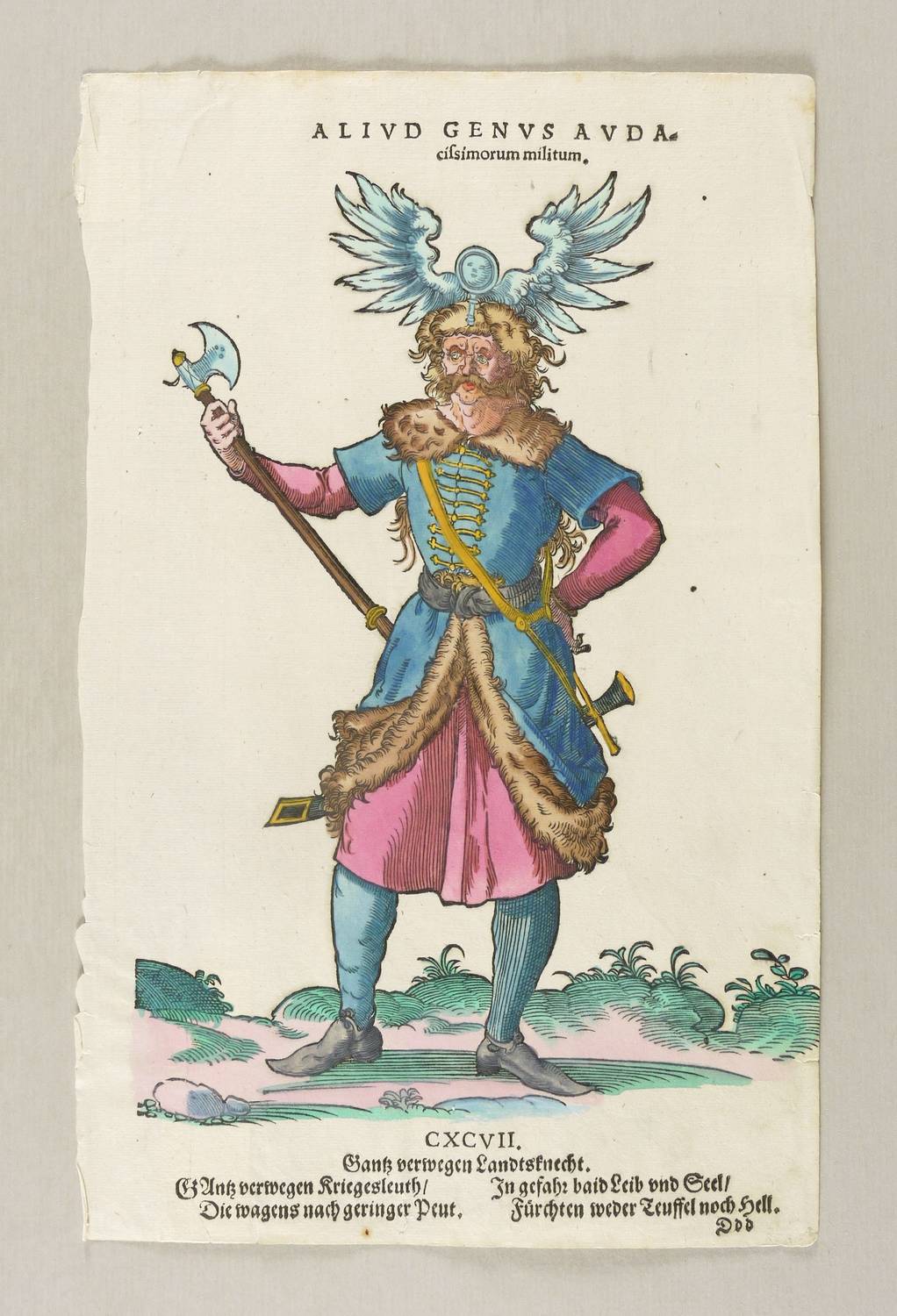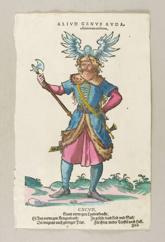 Aus: Habitus praecipuorum populorum. tam virorum quam fœminarum singulari arte depicti . Trachtenbuch: darin fast allerley und der fürnembsten Nationen, die heutigs tags bekandt sein, Kleidungen, beyde wie es bey Manns und Weibspersonen gebreuchlich, mit allem vleiß abgerissen sein, seh (Hans Weigel: Nürmberg 1577). – Oberhalb und unterhalb der Darstellung bezeichnet, zudem nummeriert: ″CXCVII.″ und mit Vierzeiler: ″Gantz verwegen Kriegesleuth / Die wagens nach geringer Peut. In gefahr baid Leib und Seel / Fürchten weder Teuffel noch Hell.″ – Guter Zustand.