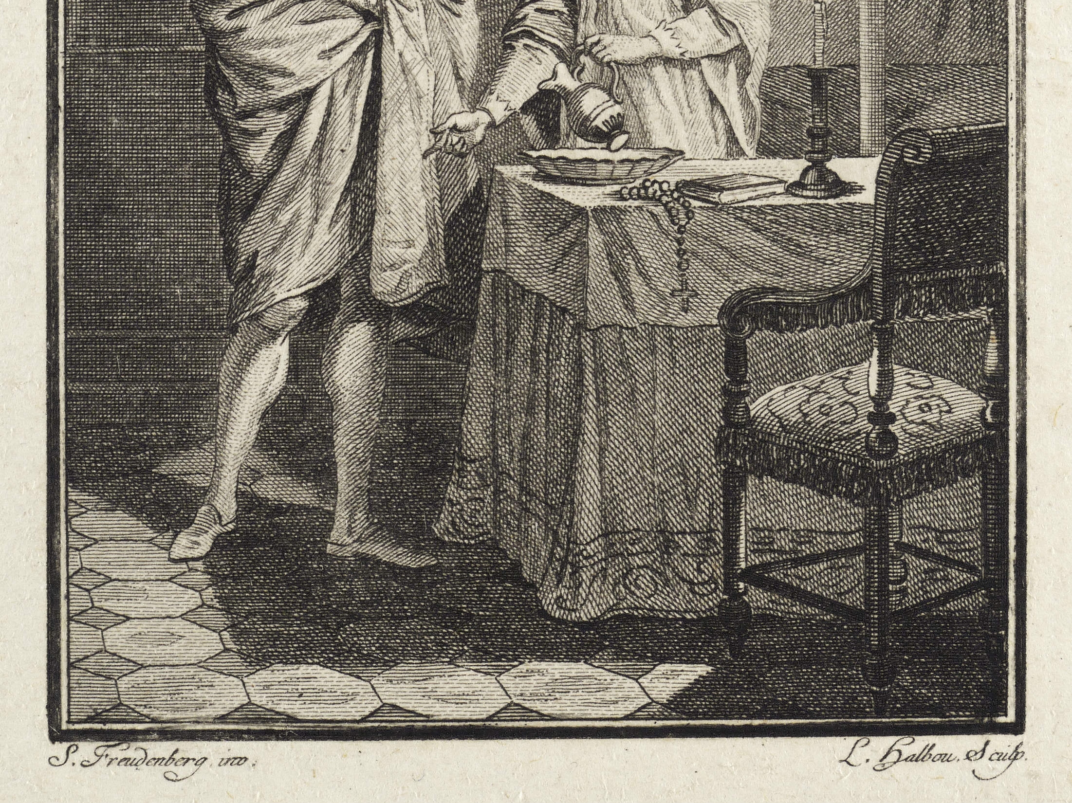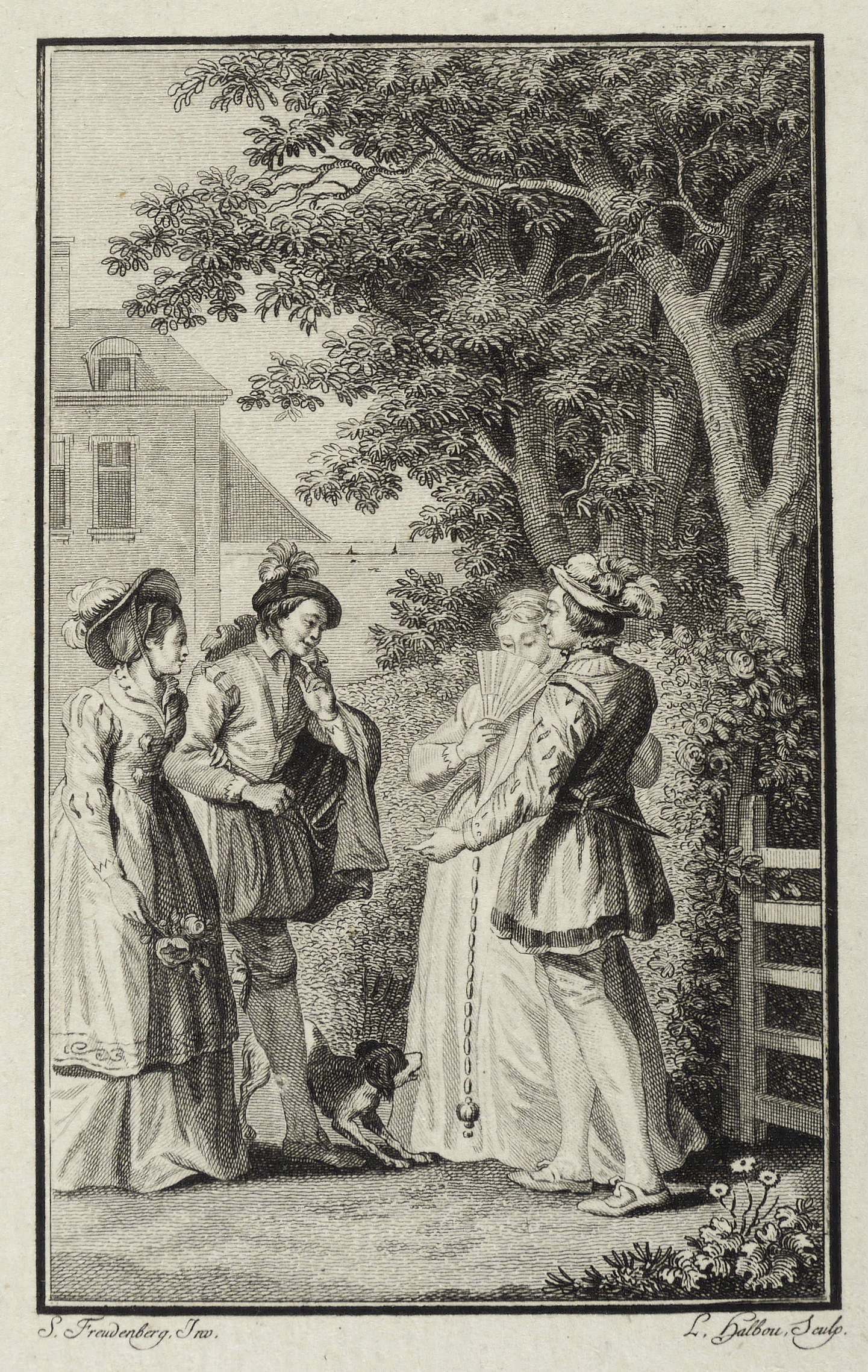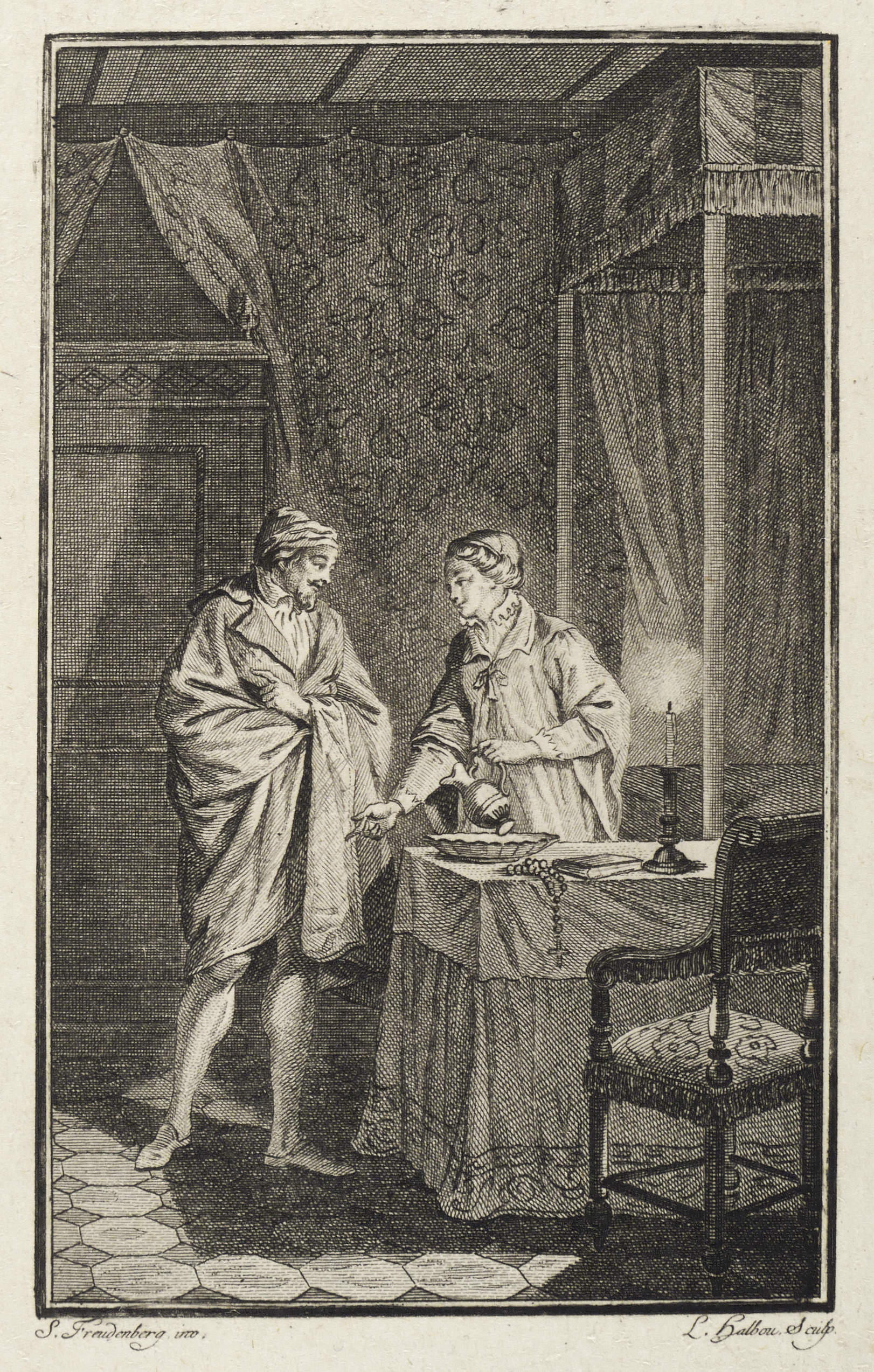 1780/1781. Radierung / Strichätzung, 6 Blätter, in Schwarz, auf Bütten. – Buchillustration, von Louis Michel Halbou. – 10,2 x 6,4 cm (Darstellung / mit Schmuckrahmen), 14 x 9,5 cm (Blatt).