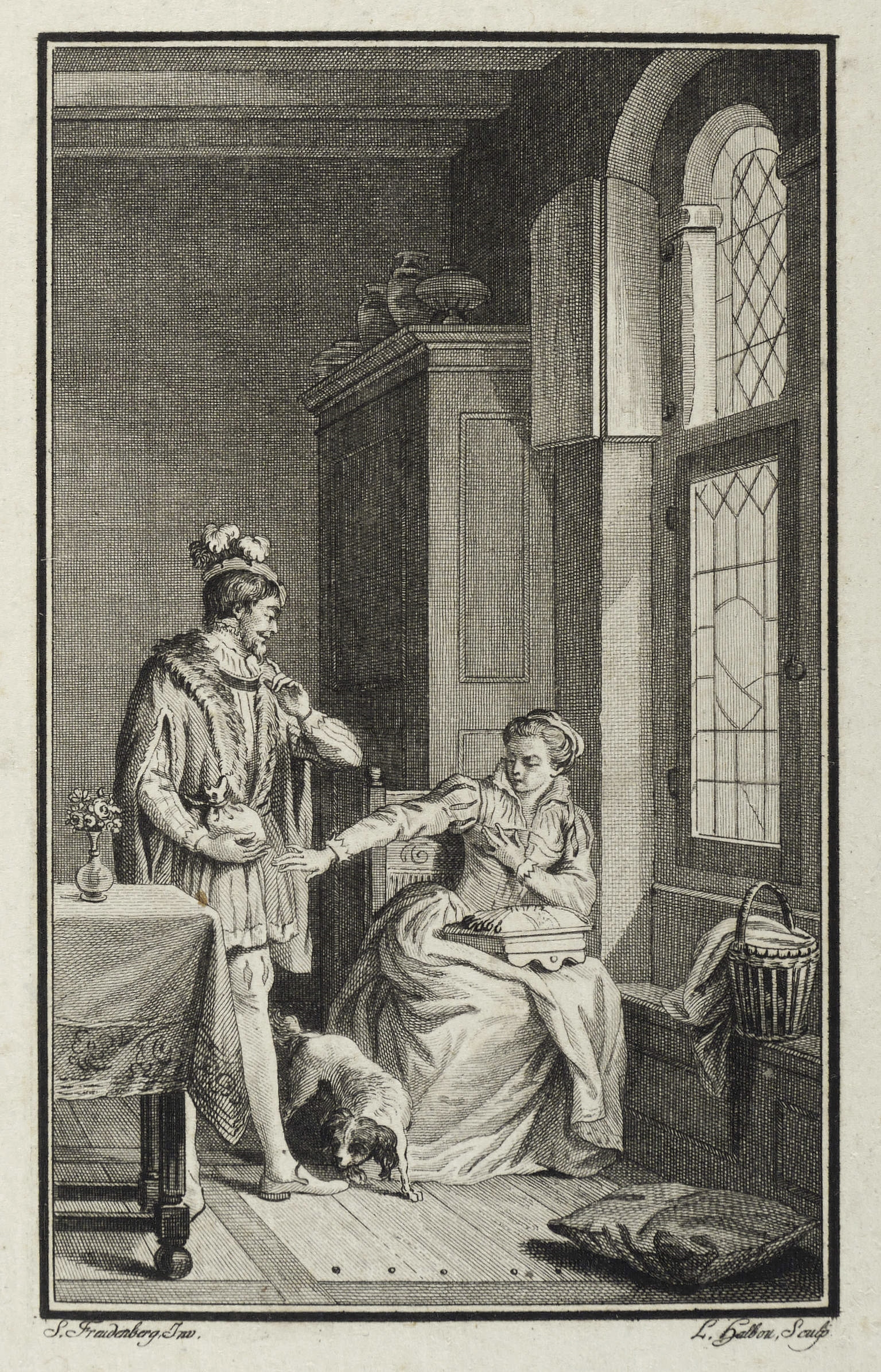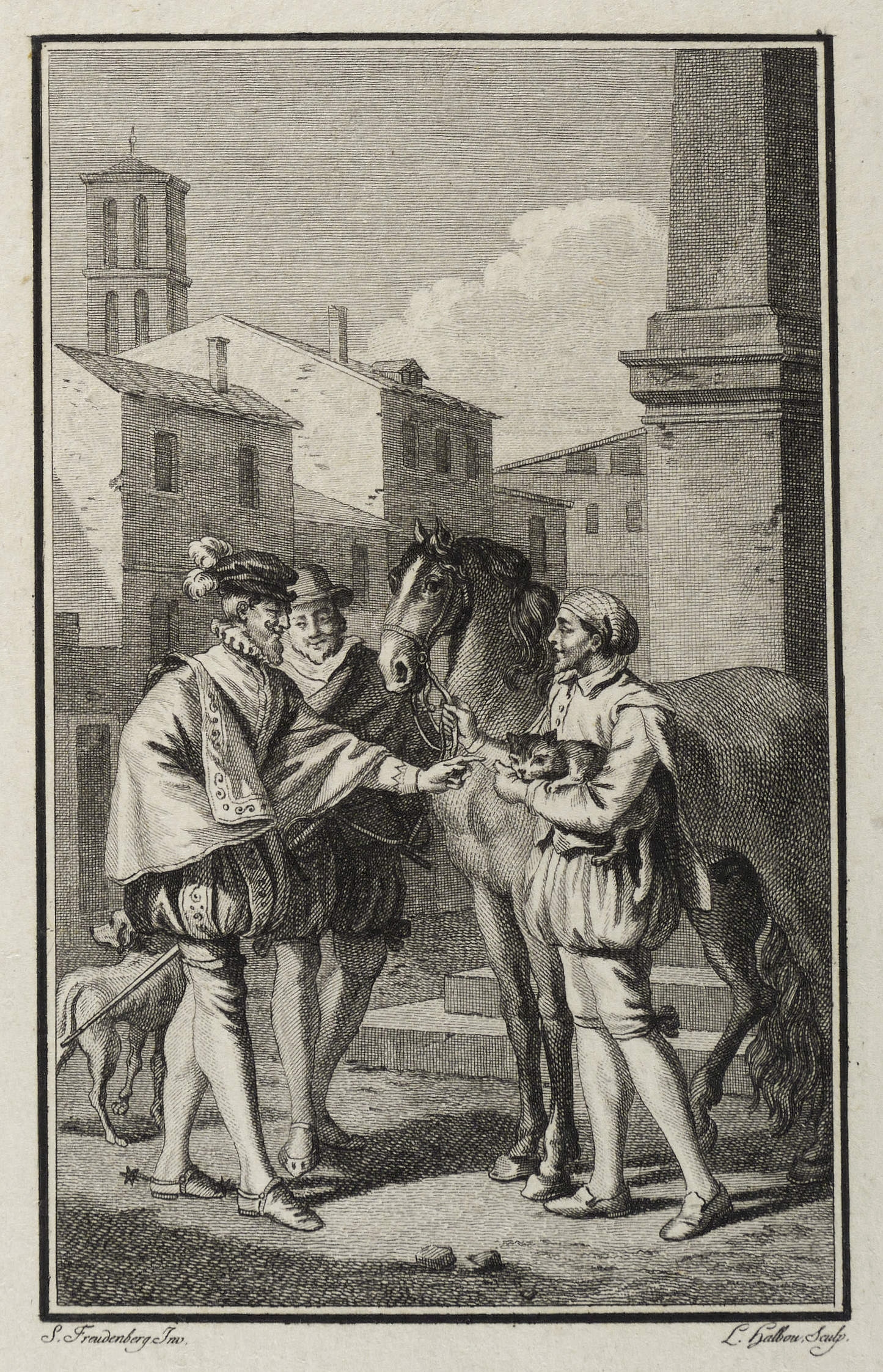 Aus: Margarete von Navarra, Les nouvelles. Heptaméron français (Bern: Walthard & Nouvelle Société Typographique 1780/1781), Bd. 1-3. – Rechts unten signiert: ″L Halbou, sculp.″ – 6 Bll. der reich illustrierten Berner Ausgabe des ″Heptaméron″ von Margarete von Navarra. – Blätter mit unterschiedlich breitem Rand um die Darstellung. Vereinzelt leicht fleckig, teils etwas stärker. Sonst guter Zustand.
