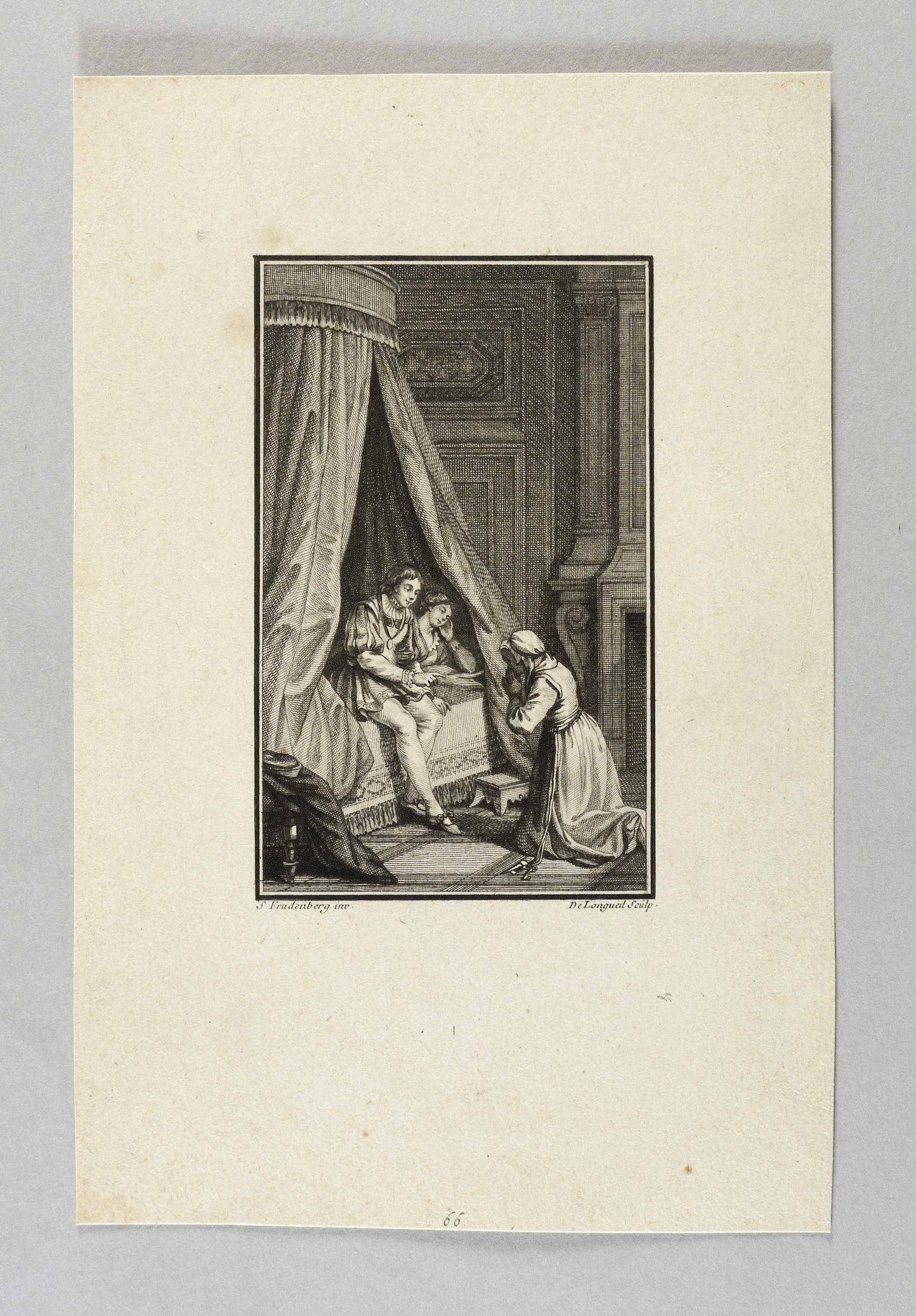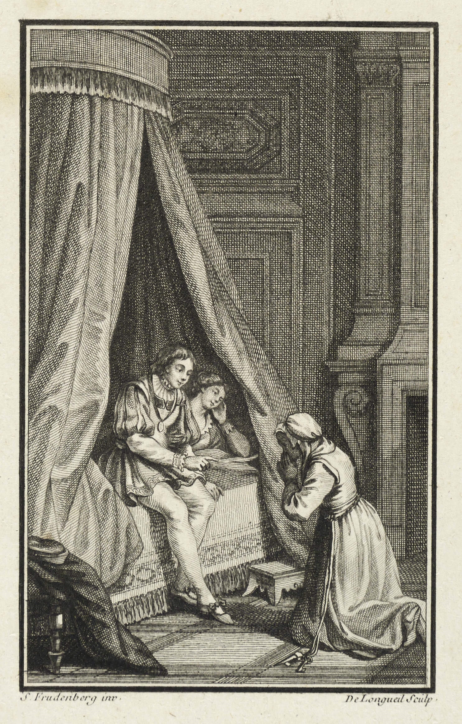 Aus: Margarete von Navarra, Les nouvelles. Heptaméron français (Bern: Walthard & Nouvelle Société Typographique 1780/1781), Bd. 1-3. – Rechts unten signiert: ″De Longueil Sculp.″ – Illustration zur reichlich illustrierten ersten Berner Ausgabe des ″Heptaméron″ von Margarete von Navarra. – Sehr guter Zustand.