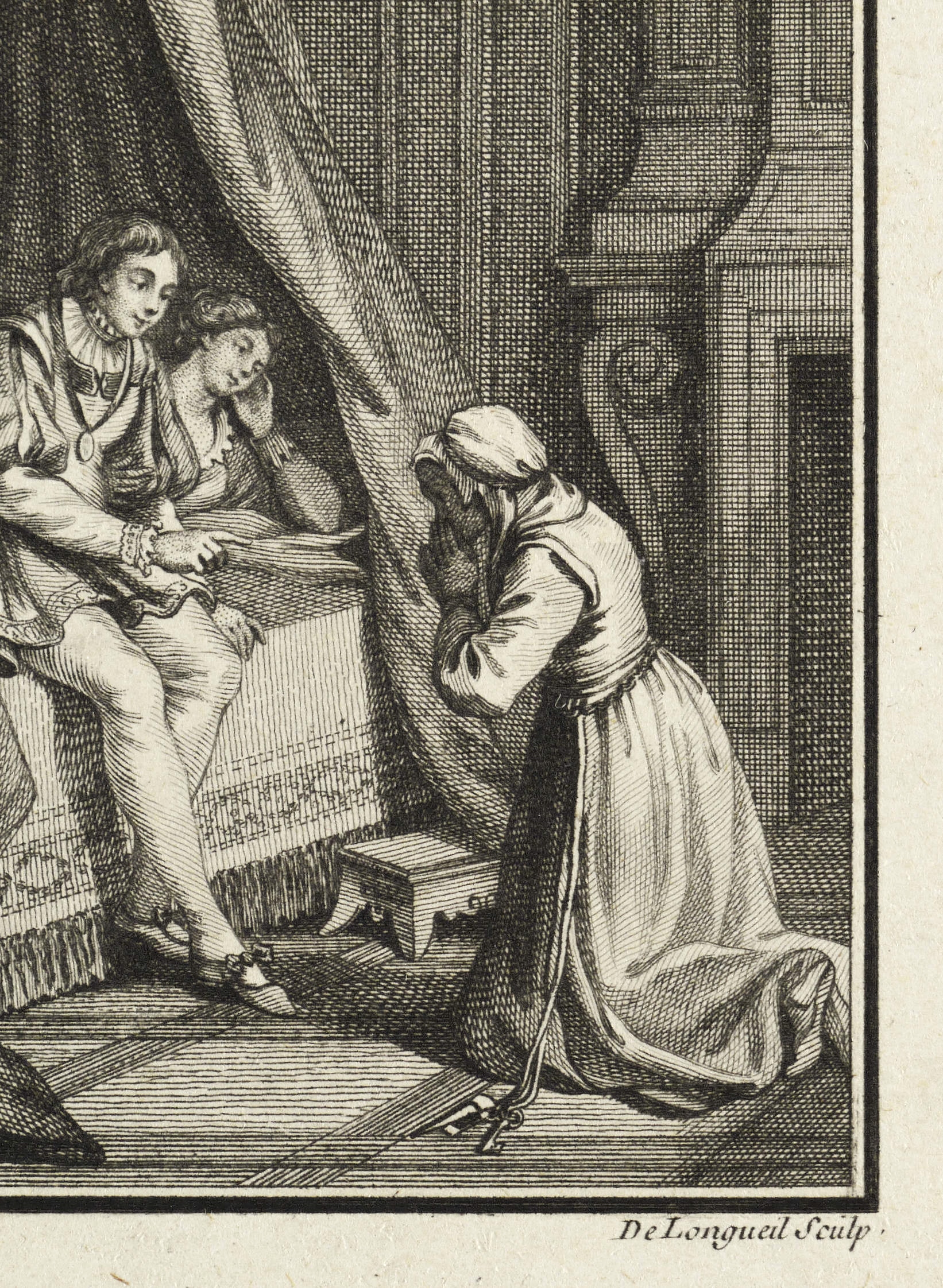 Joseph de Longueil (1730 Givet - 1792 Paris). Französischer Zeichner und Kupferstecher. Ging 1748 nach Paris, um bei Jacques Philippe Le Bas zu lernen. War auch in den Ateliers von Jacques Aliamet und Jean-Georges Wille tätig. Ab 1776 königlicher Hofkupferstecher, ab 1779 Graveurs des Fürsten von Condé. 1781 Heirat mit Mademoiselle Guerin, die schon 1790 starb.