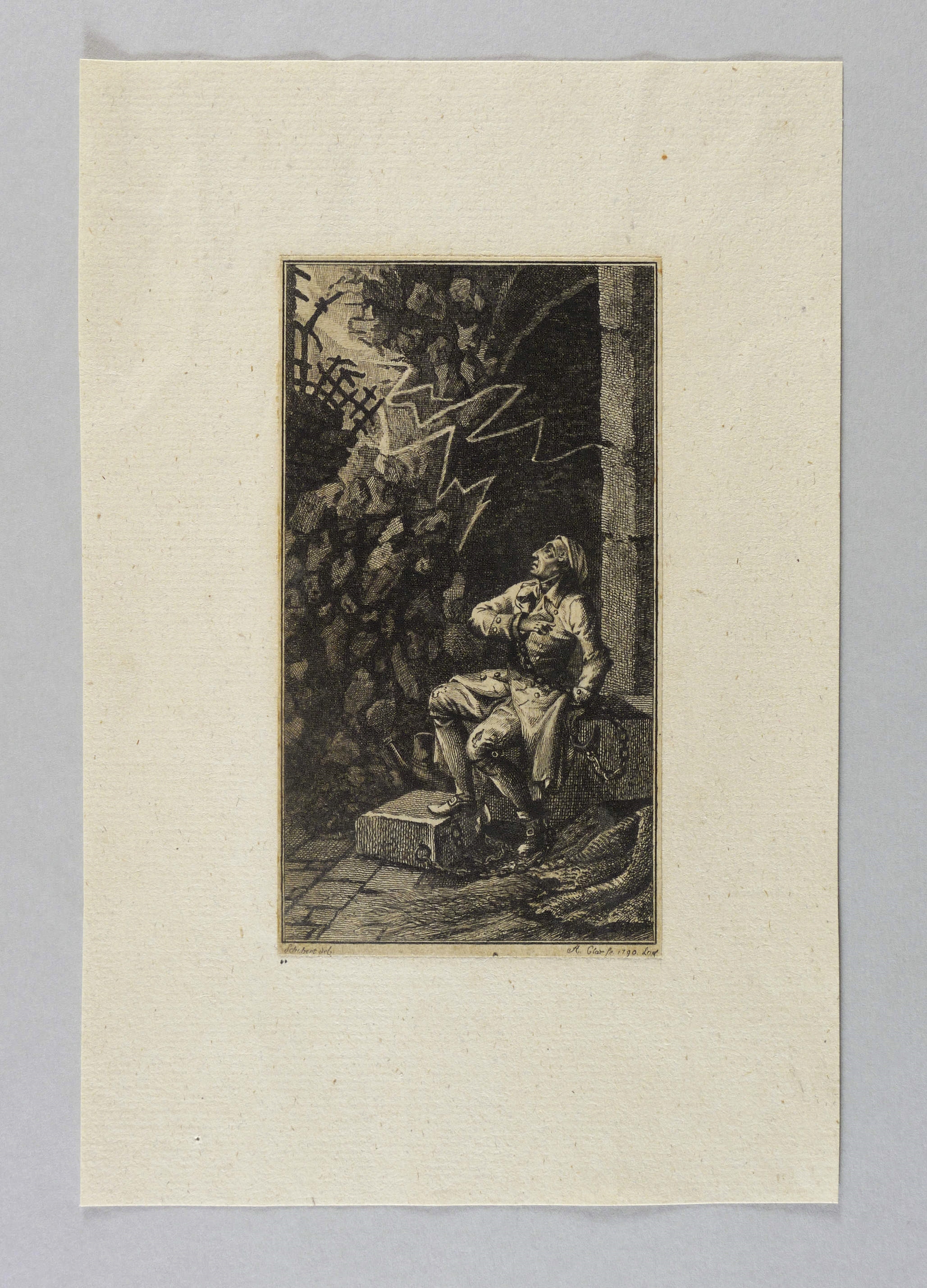 1790. Kupferstich / Linienstich. – Historische Buchillustration, von Johann Friedrich August Clar. – 12,2 x 6,7 cm (Darstellung), 12,5 x 6,9 cm (Blatt), 20,5 x 13,5 cm (Trägerblatt).