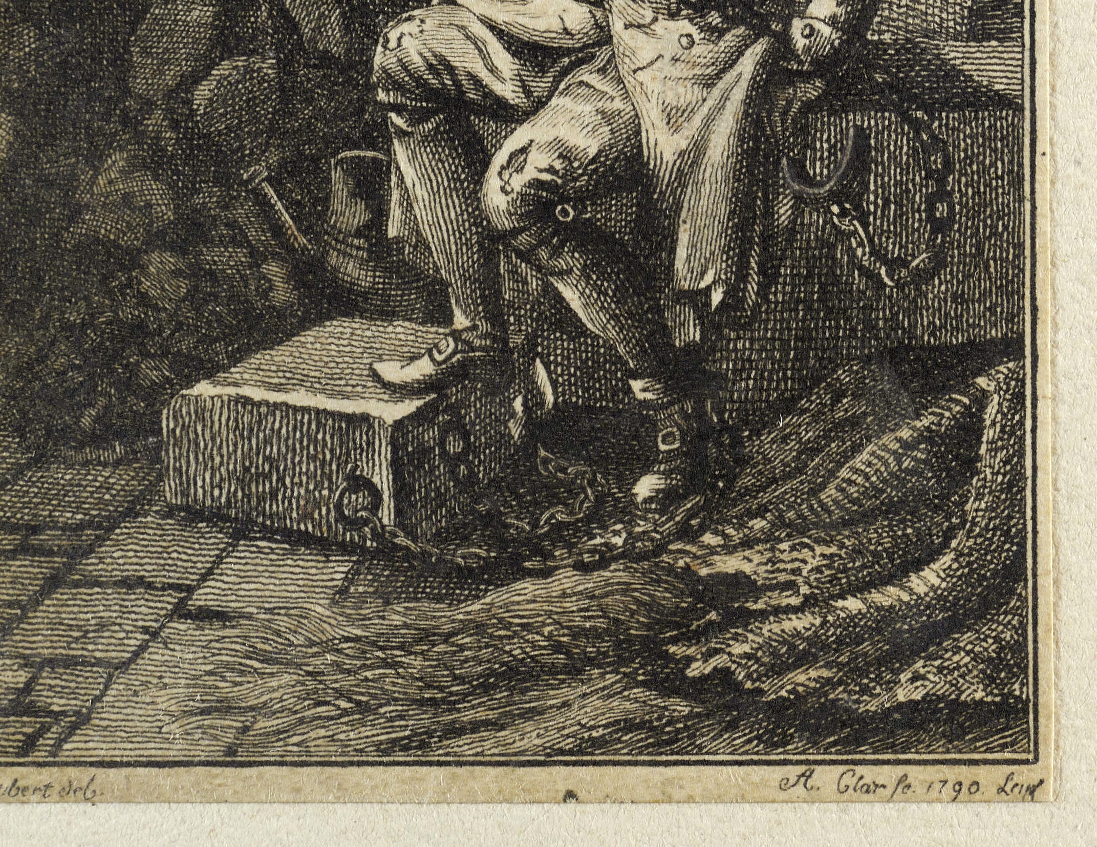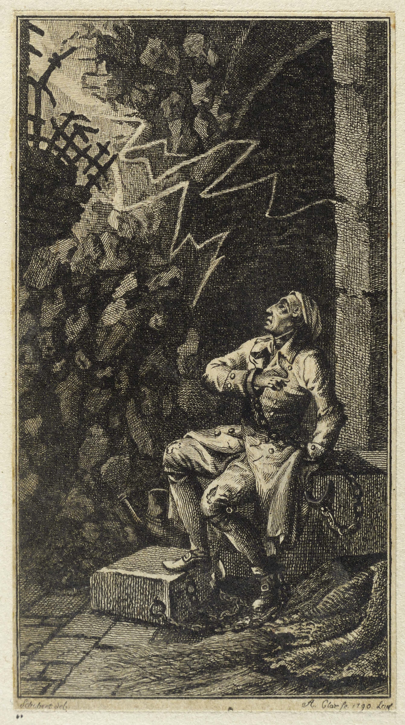 Aus: Christiane Benedikte Naubert, Alf von Dülmen. Oder Geschichte Kaiser Philipps und seiner Tochter. Aus den ersten Zeiten der heimlichen Gerichte (Leipzig: Weygandsche Buchhandlung 1791). – Rechts unten signiert und datiert: ″A. Clar sc. 1790. Leipz″. – Blatt mit sehr schmalem Rand um die Darstellung und alt auf Trägerbütten (1824-54, Papiermühle Christian Friedrich Hempel in Stadtroda / Zeitzbach) montiert. Sonst guter Zustand.