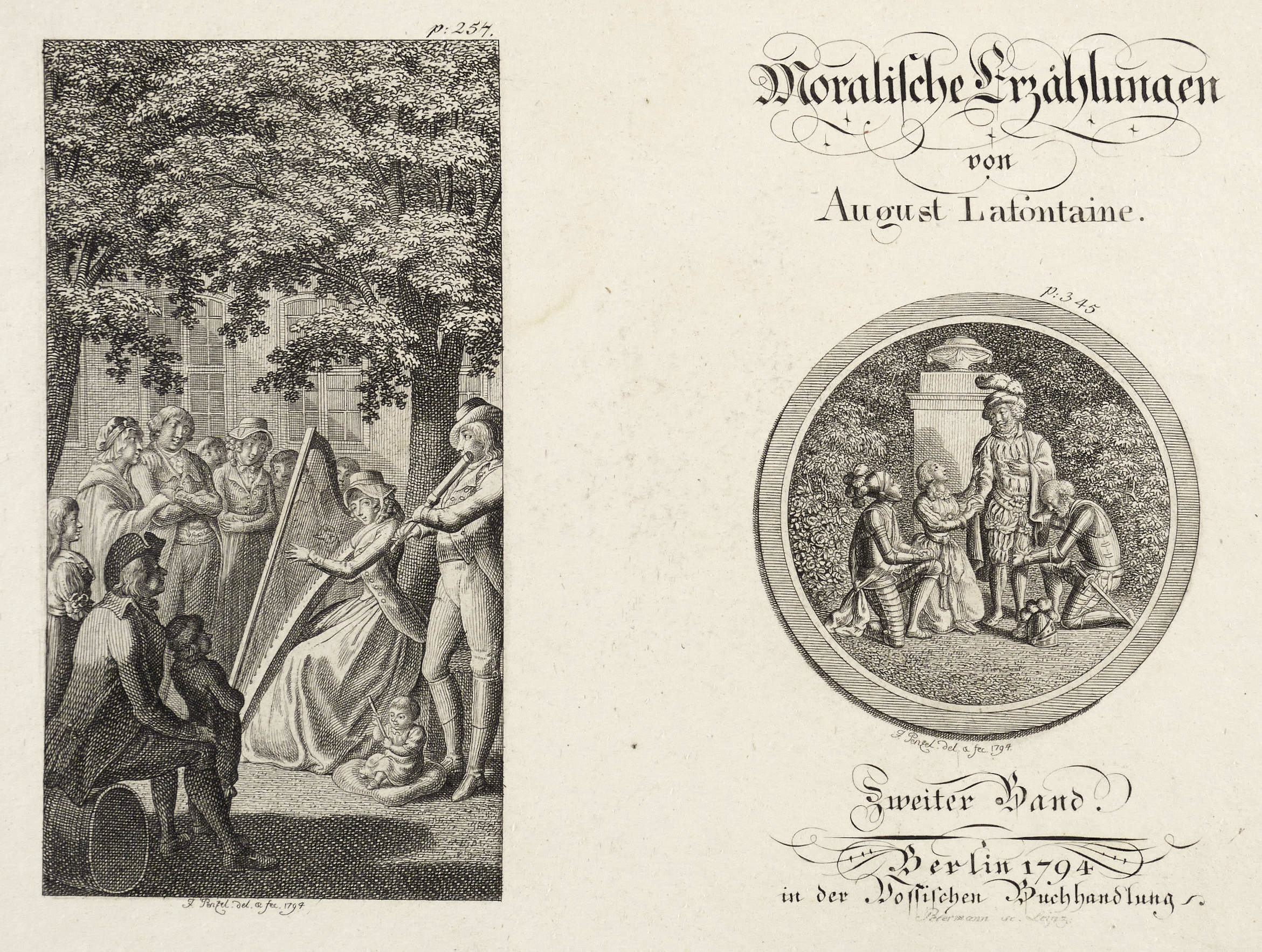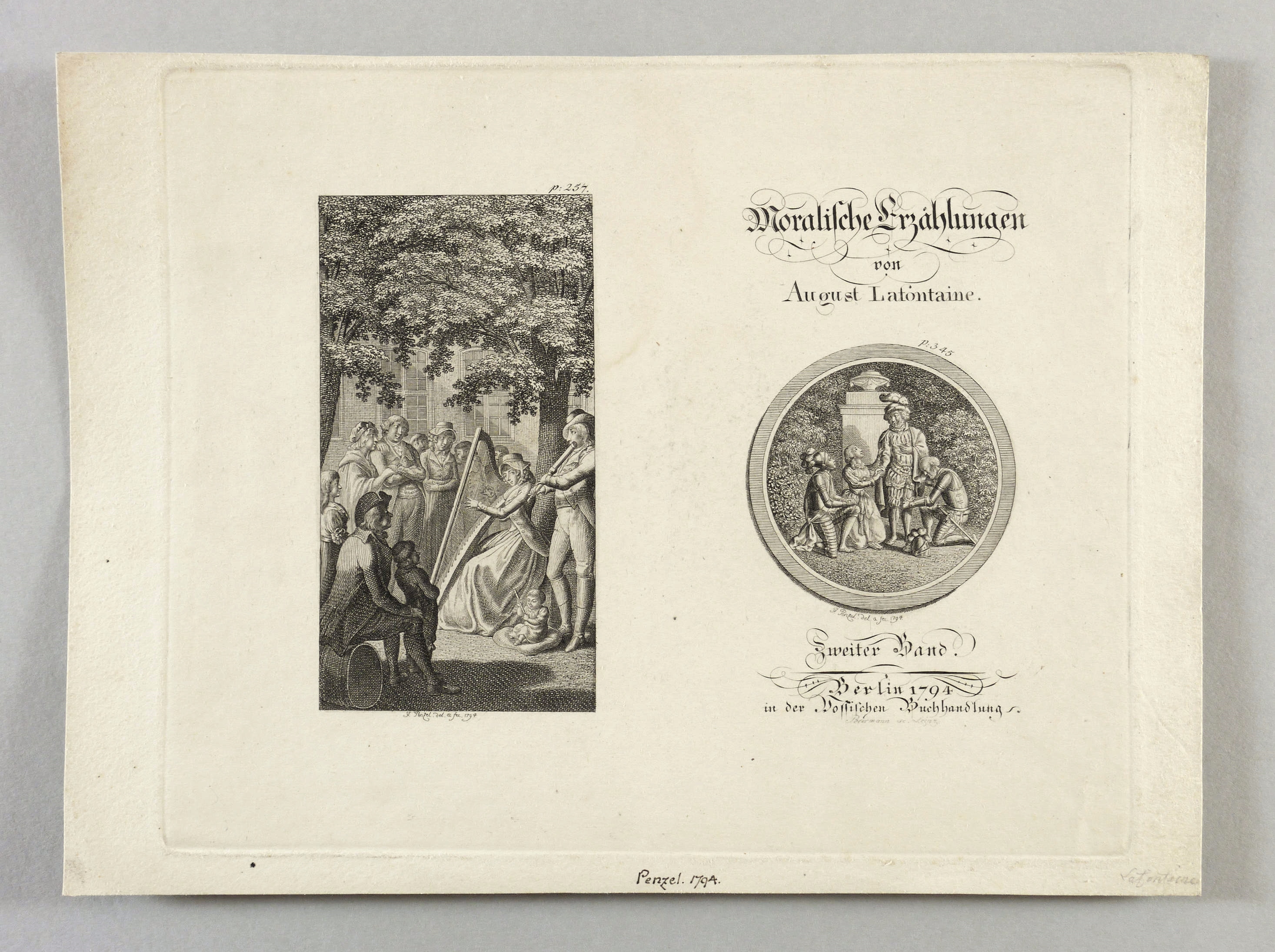 Aus: August Lafontaine, Moralische Erzählungen (Berlin: Voss 1794-1800). – Jeweils unterhalb der Darstellung signiert und datiert.: ″J. Penzel. del. et fec. 1794.″ Mit Titel und Verlagsangabe. Darunter Schriftstechersignatur: ″Beermann sc. Leipz:″ – Guter Zustand.