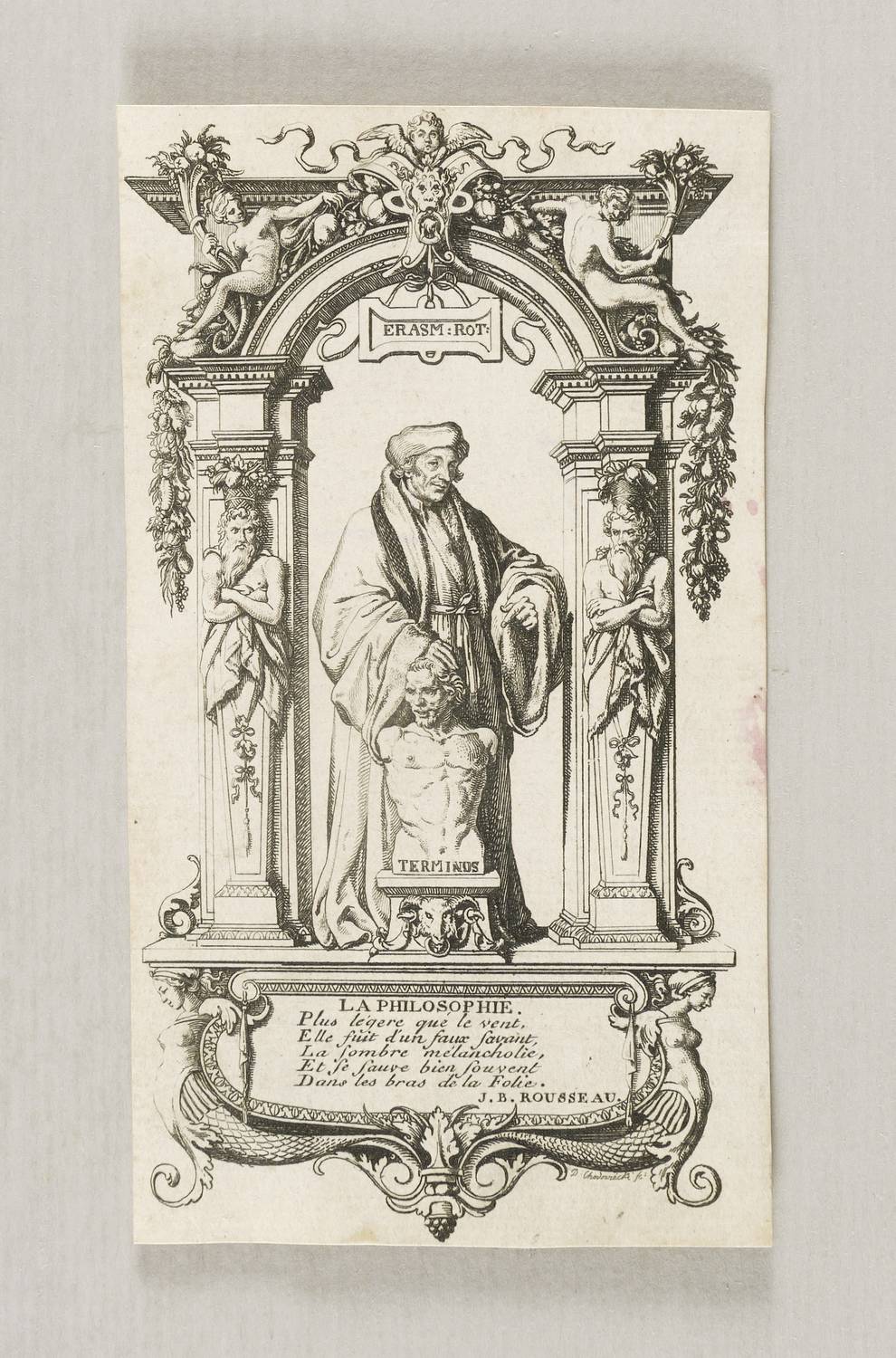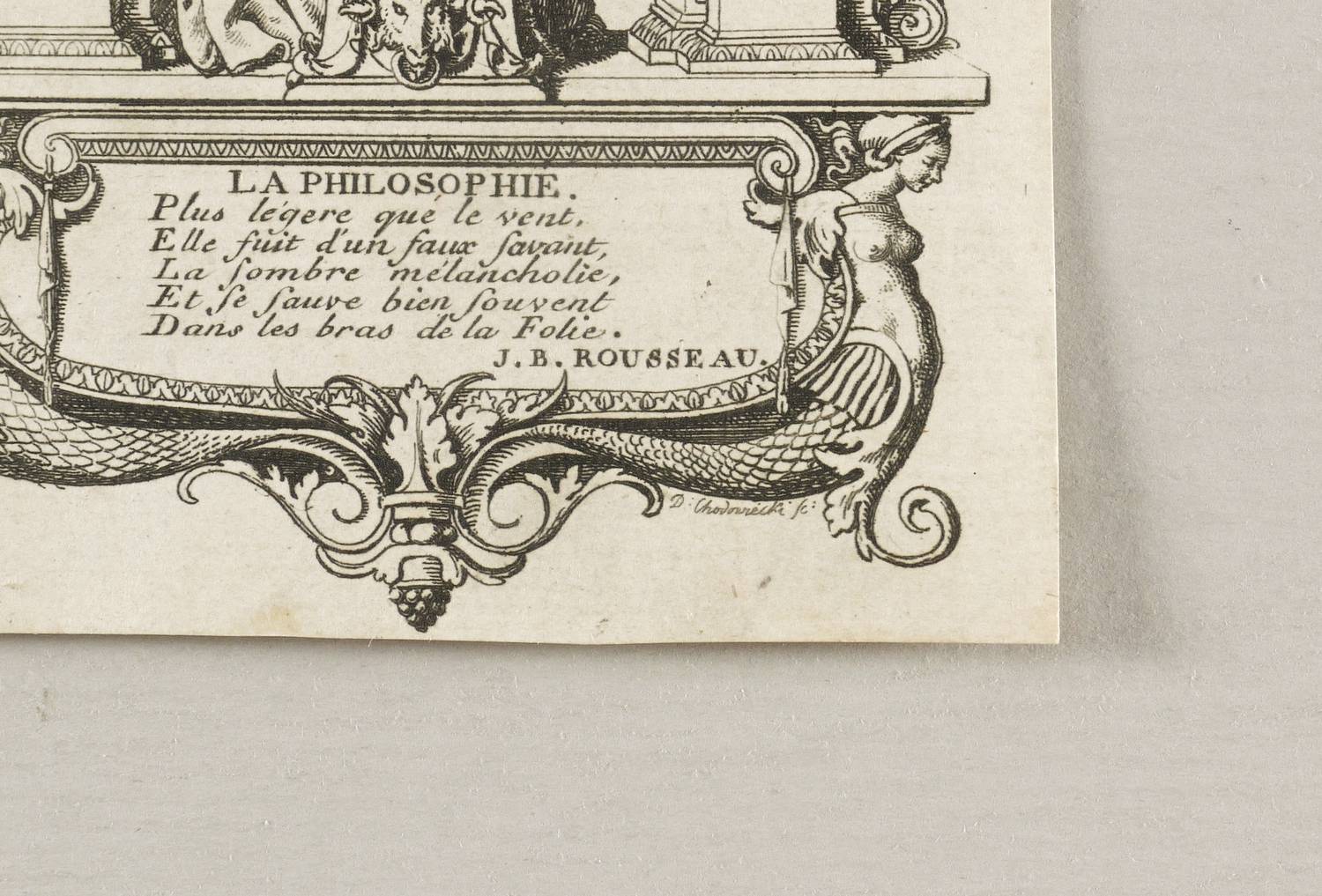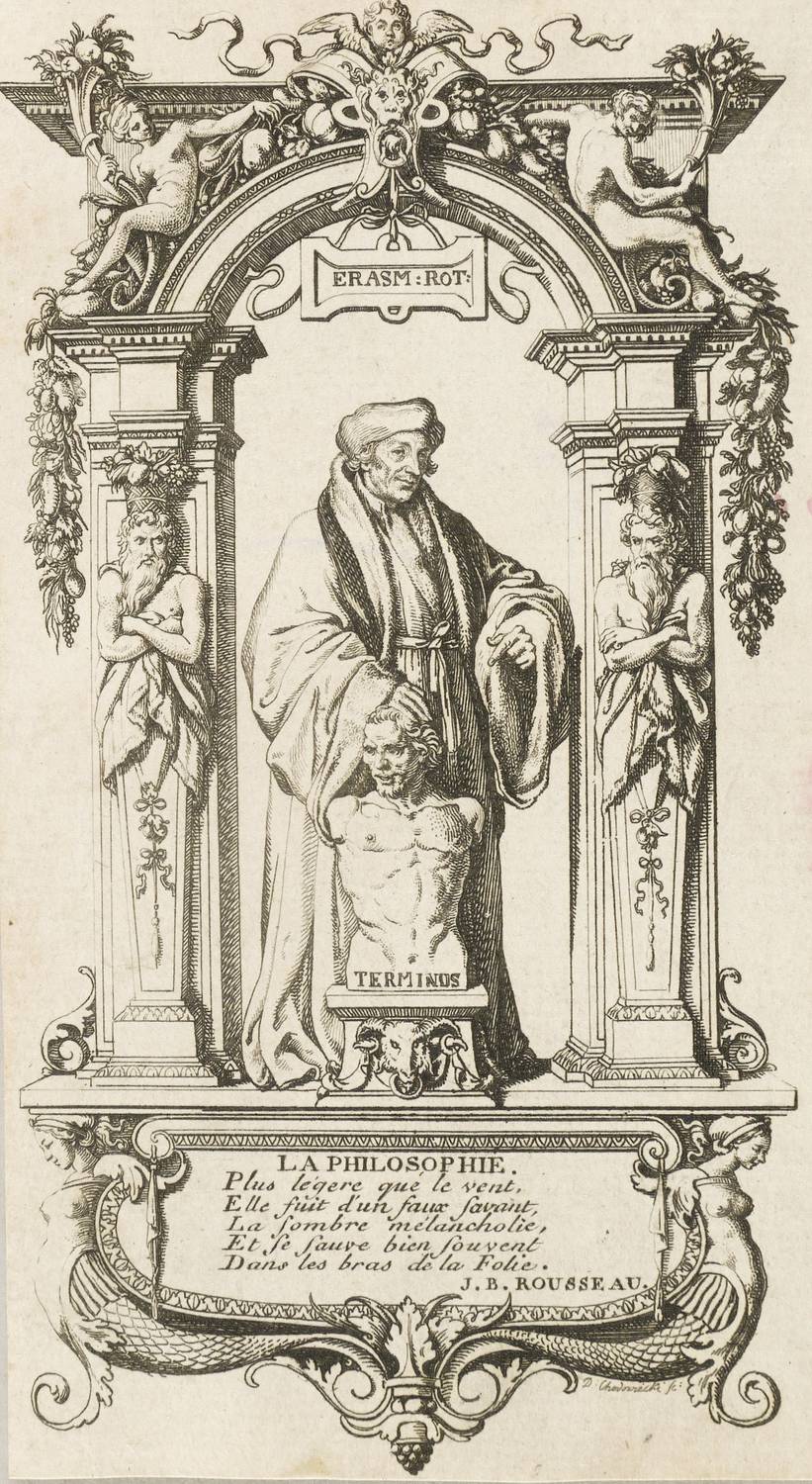 Bauer 802. Engelmann 377. – Aus: Desiderius Erasmus von Rotterdam, Lob der Narrheit. aus dem Lateinischen des Ersamus (Berlin und Leipzig: Georg Jacob Decker 1781). – Unten rechts signiert: ″D: Chodowiecki sc:″. Unterhalb der Darstellung Zitat Rousseau. – Bis über die Platte beschnitten. Im rechten Rand wenig fleckig. Sonst aber guter Zustand.