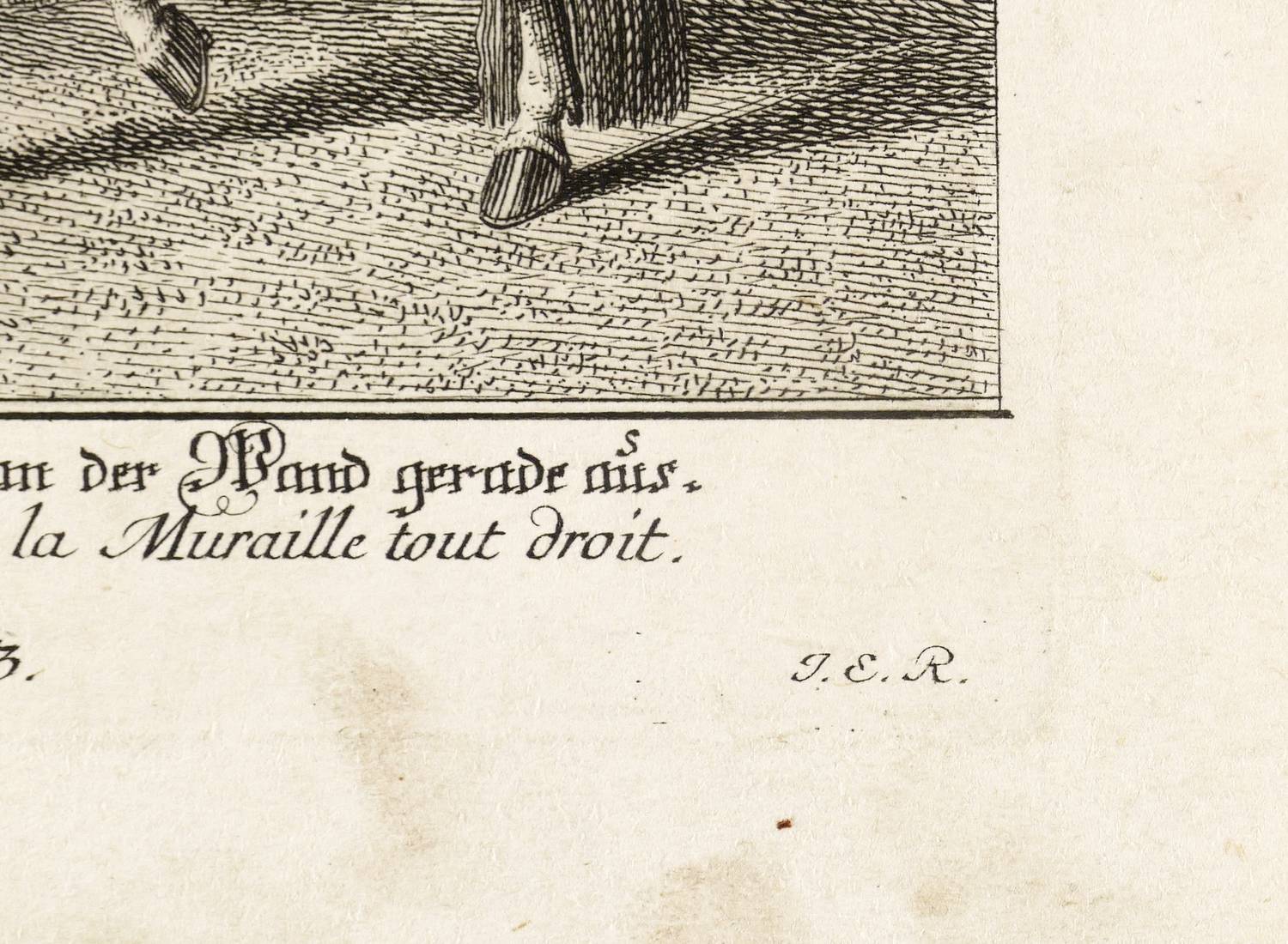 Thienemann 659. – Aus: Johann Elias Ridinger, Vorstellung und Beschreibung derer Schul und Campagne Pferden nach ihren Lectionen, In was vor gelegenheiten solche koennen gebraucht werden. (Augsburg: Johann Elias Ridinger 1760). – Rechts unten monogrammiert: ″J. E. R.″ Unterhalb der Darstellung betitelt und nummeriert: ″N.o 13.″ – Blatt im unteren Rand leicht fingerfleckig. Sonst aber guter Zustand.