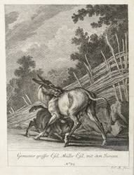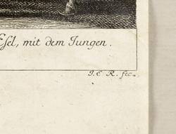 Thienemann 512. – Aus: Entwurff einiger Thiere. wie solche nach ihren unterschiedenen Arten, Actionen und Leidenschafften, nach dem Leben gezeichnet, samt beygefügten Anmerckungen (Augsburg: Mahlern 1738-1754). – Rechts unten monogrammiert: ″J. E. R. fec.″ Unterhalb der Darstellung betitelt und nummeriert: ″N.o 32.″ – Blatt im unteren Rand schwach fingerfleckig. Sonst aber guter Zustand.