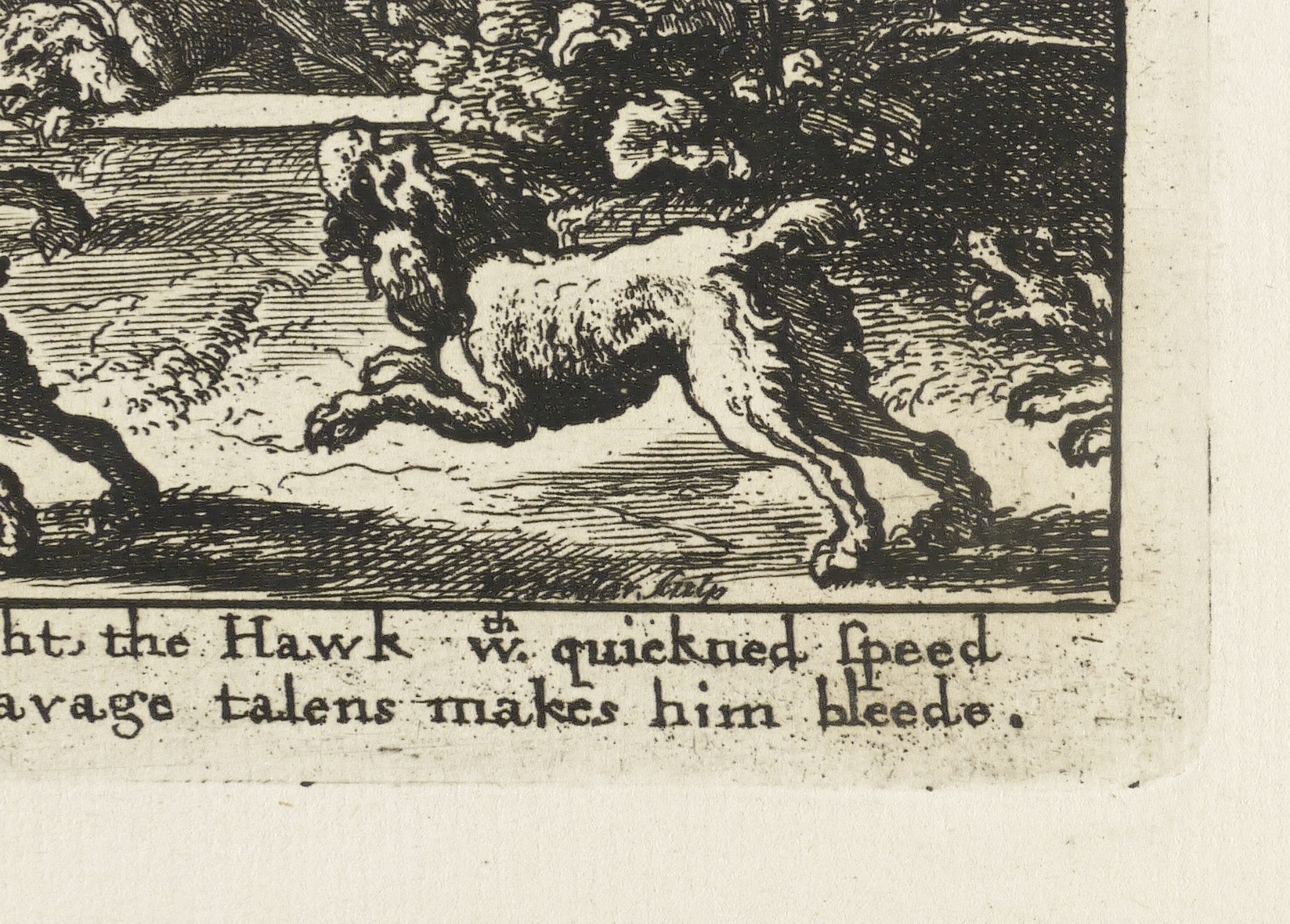 Parthey 2035. – Aus: Francis Barlow / Wenzel Hollar, Seuerall wayes of hunting, hawking and fishing according to the English manner (London: John Overton 1671). – Rechts unten signiert: ″Hollar sculp.″ Ober- und unterhalb der Darstellung englisch bezeichnet. – Breitrandiges Blatt verso mit Montageresten. Sonst aber guter Zustand.