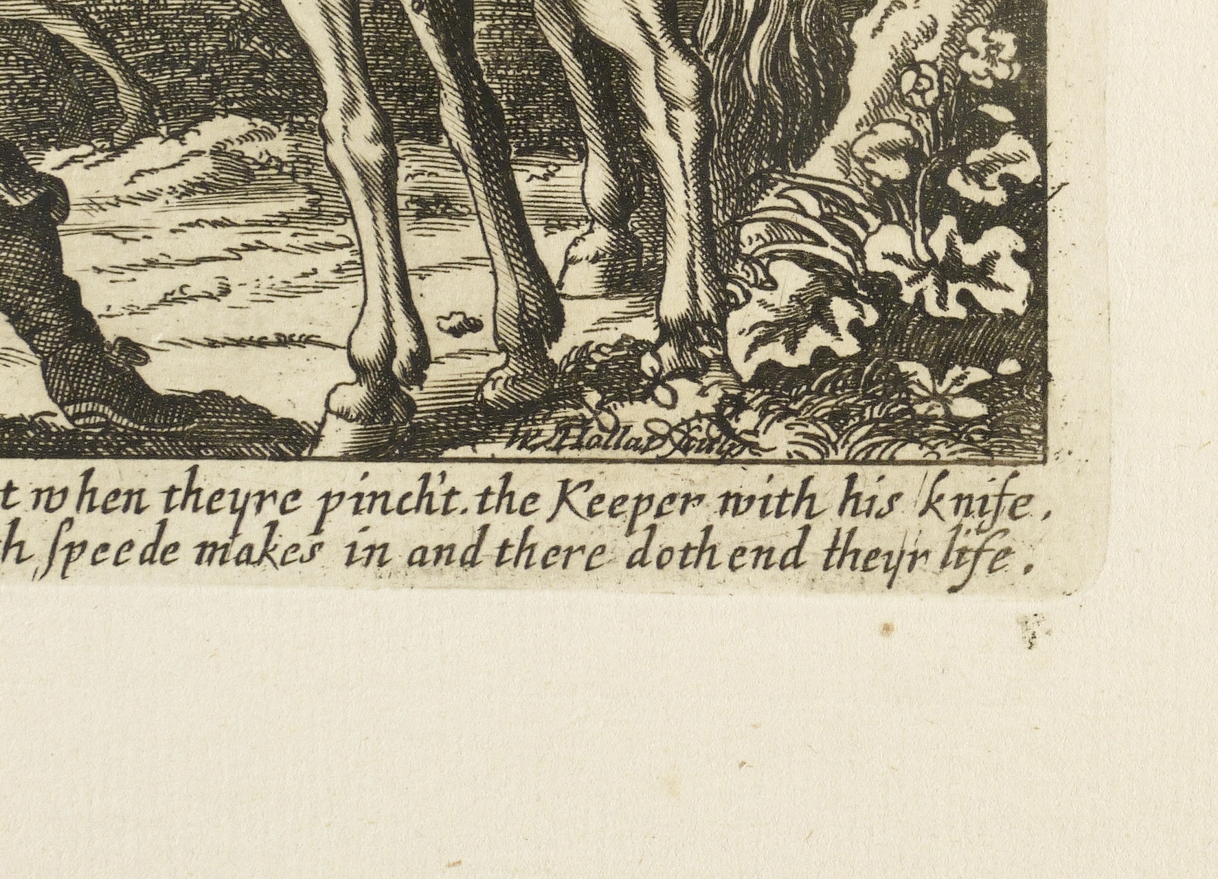 Parthey 2038. – Aus: Francis Barlow / Wenzel Hollar, Seuerall wayes of hunting, hawking and fishing according to the English manner (London: John Overton 1671). – Rechts unten signiert: ″Hollar sculp.″ Unterhalb der Darstellung englisch bezeichnet. – Breitrandiges Blatt. Guter Zustand.