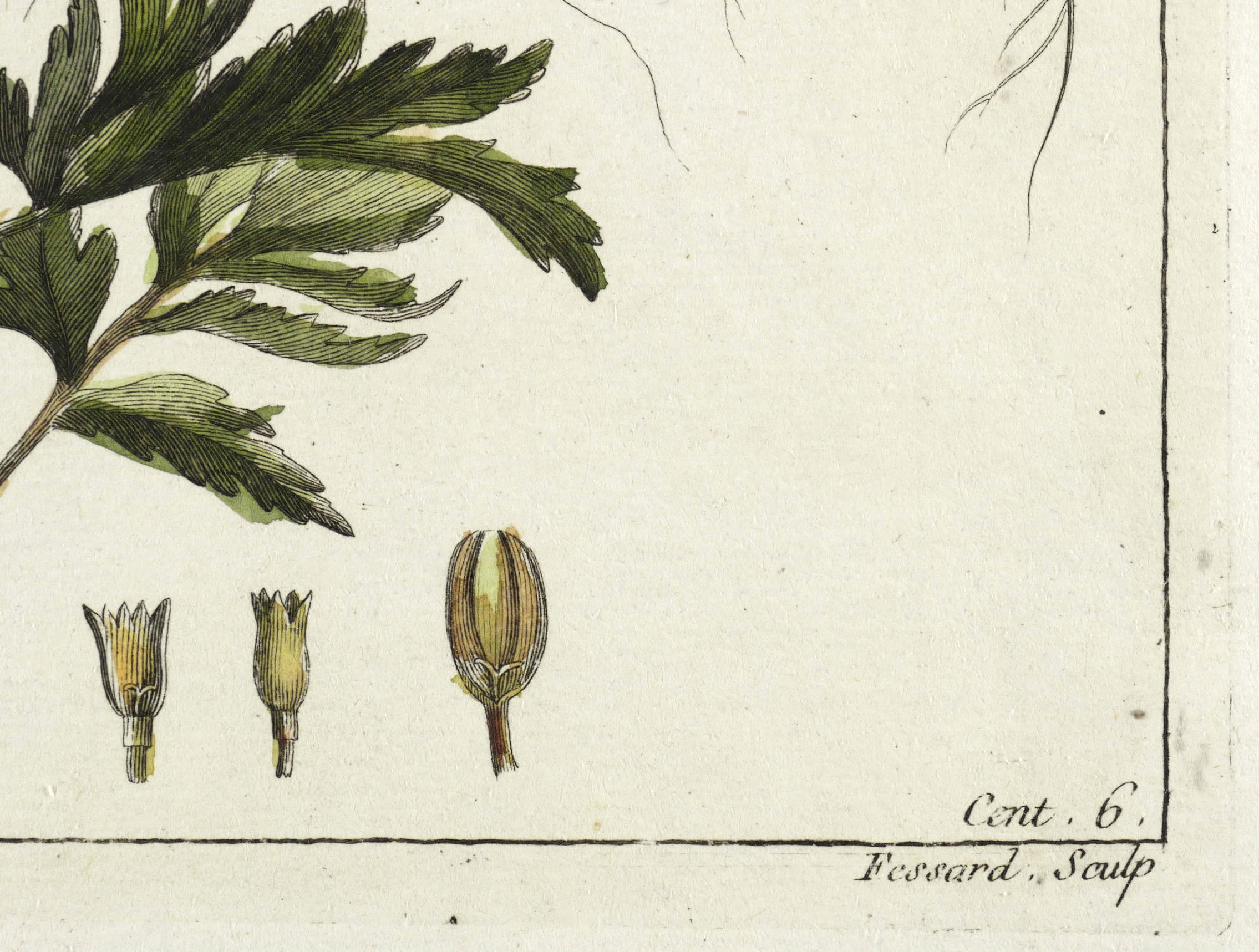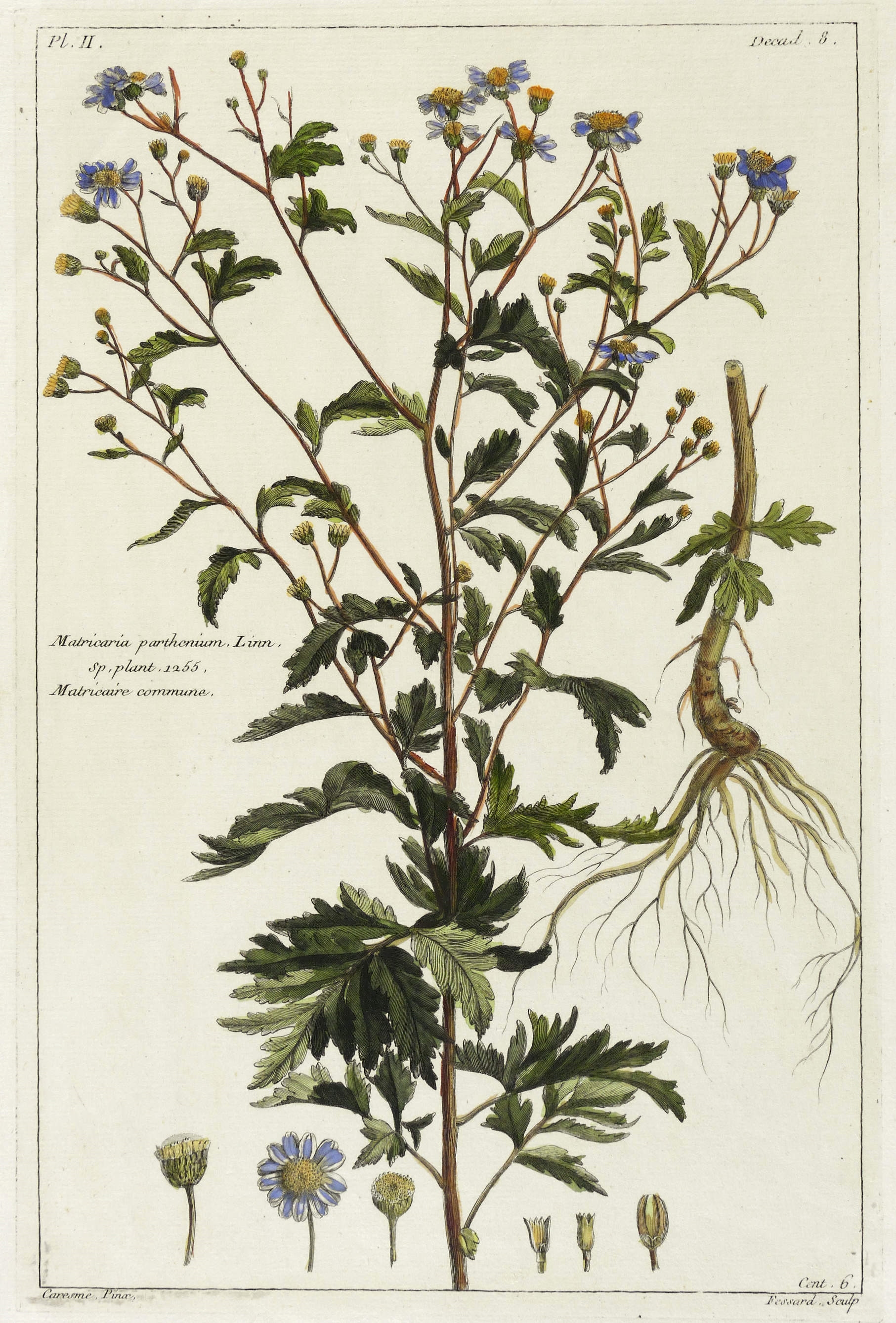 Rechts unten signiert: "Fessard, Sculp". Innerhalb der Darstellung bezeichnet. – Syn.: Chrysanthemum parthenium (L.) Bernh. – Obere rechte Ecke leicht bestoßen. Sonst guter Zustand.