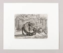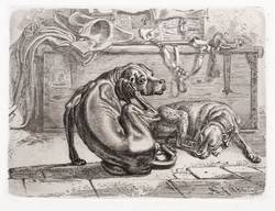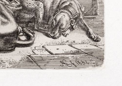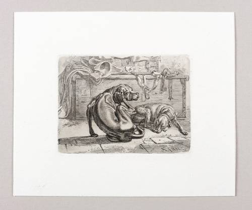 Jahn 302 III (von III). – In der Platte unten rechts signiert und datiert: "JAK f 1832". – Ein Hund mit gestutzten Ohren und Halsband schläft rechts, der Hund links kratzt sich am rechten Behang, dahinter eine Kiste mit militärischer Ausrüstung, einem dreieckigen Hut, einem Mantel, einem Degen und einem verschlossenen Koffer. - Aus einer Folge von sechs Blatt Hunden (WVZ Jahn 298-303), die der Künstler 1832 im Eigenverlag herausgab. – Tadellos. Sehr guter Zustand.
