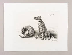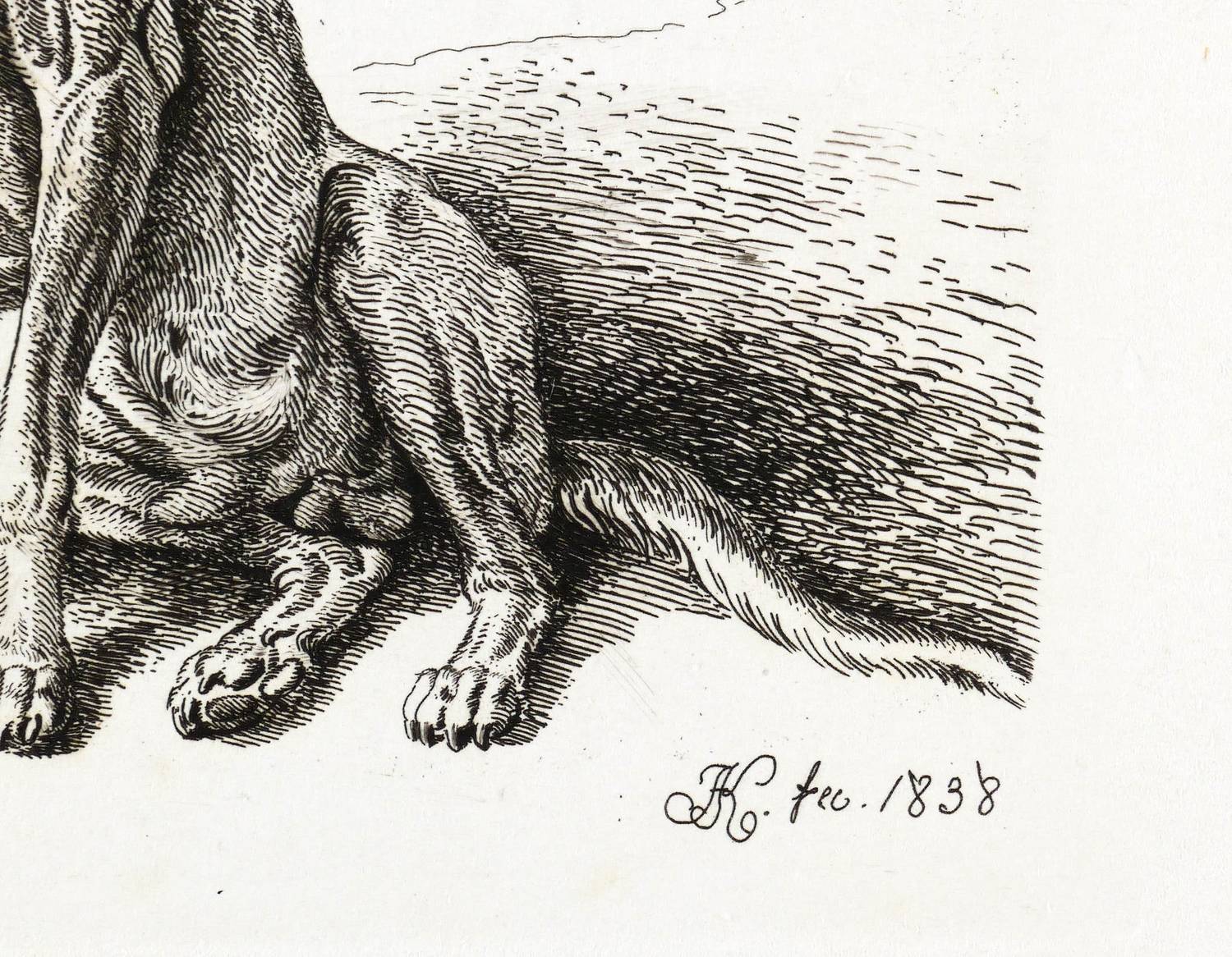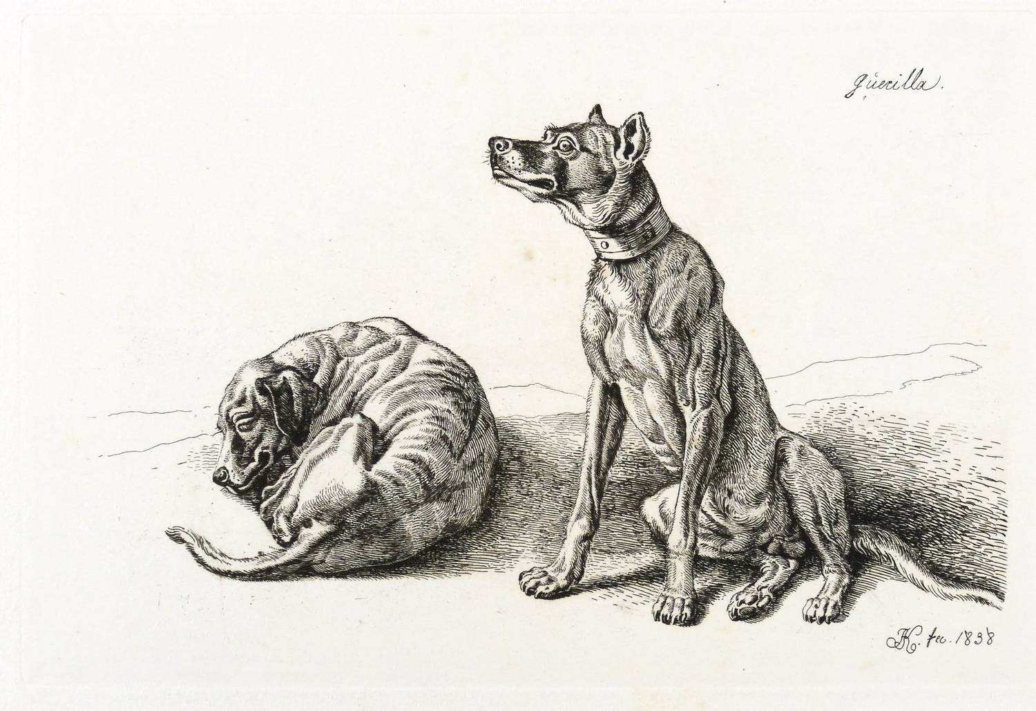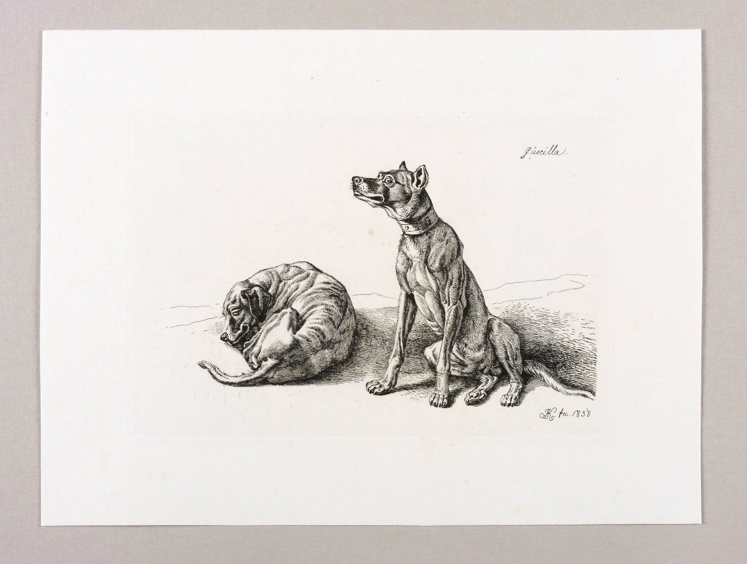 Jahn 315 II (von II). – In der Platte unten rechts signiert und datiert: ″JAK. fec. 1838″. Oben bezeichnet: ″Guerilla″. verso Sammlerstempel: ″Heymann″ (nicht bei Lugt). – In der Beschreibung von Jahn: ″Hatzhund mit gestutzten Ohren und einem breiten Halsband rechts sitzend, nach links gewandt. Links daneben liegt vom Rücken gesehen ein schlafend zusammengekauerter Hund mit langen Ohren.″ (WVZ Jahn, S. 132). - Aus einer ″Folge von sieben Blatt Studien″ (WVZ Jahn 312-318), die der Künstler 1838 im Eigenverlag herausgab. – Tadellos. Sehr guter Zustand.