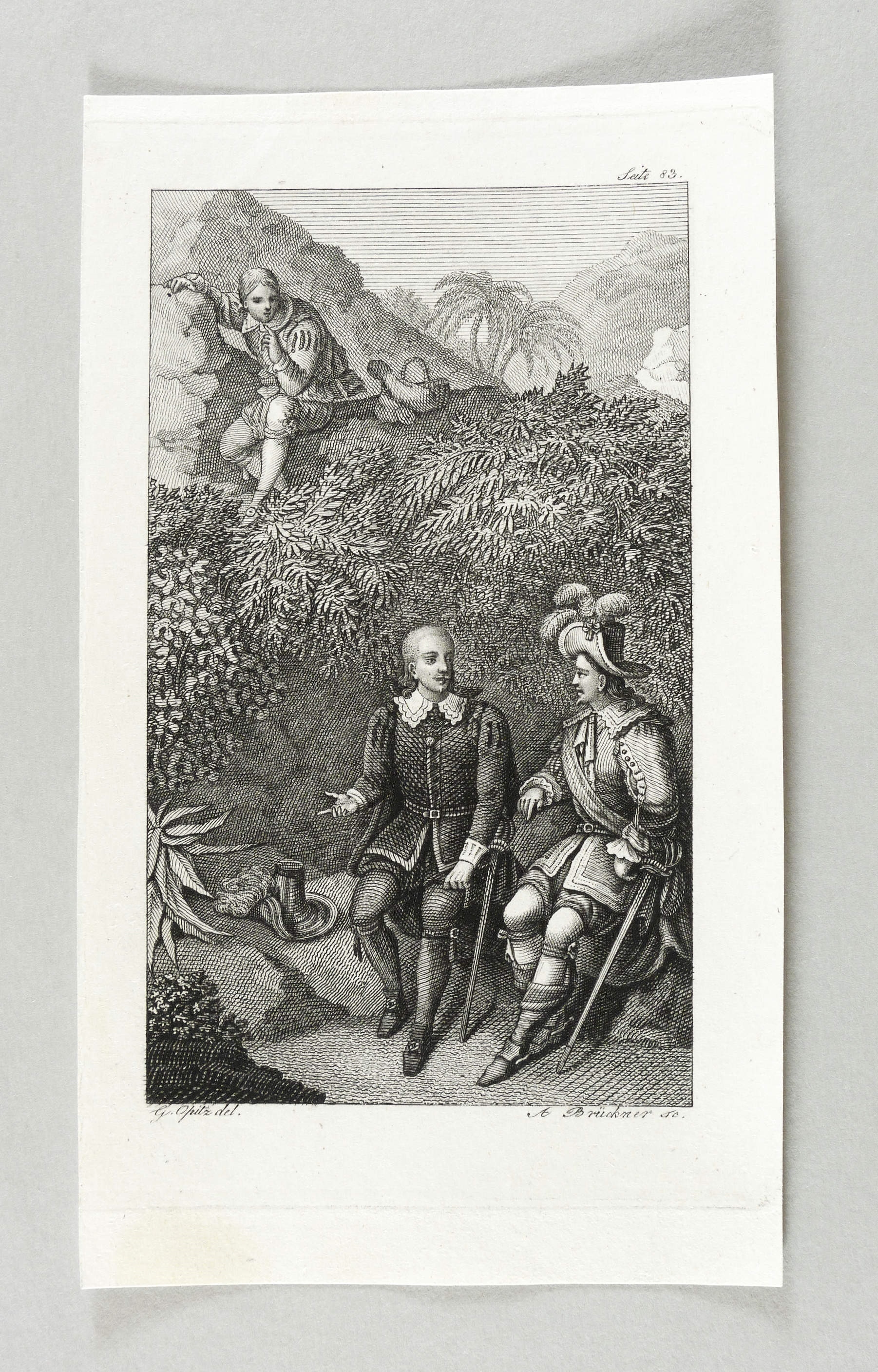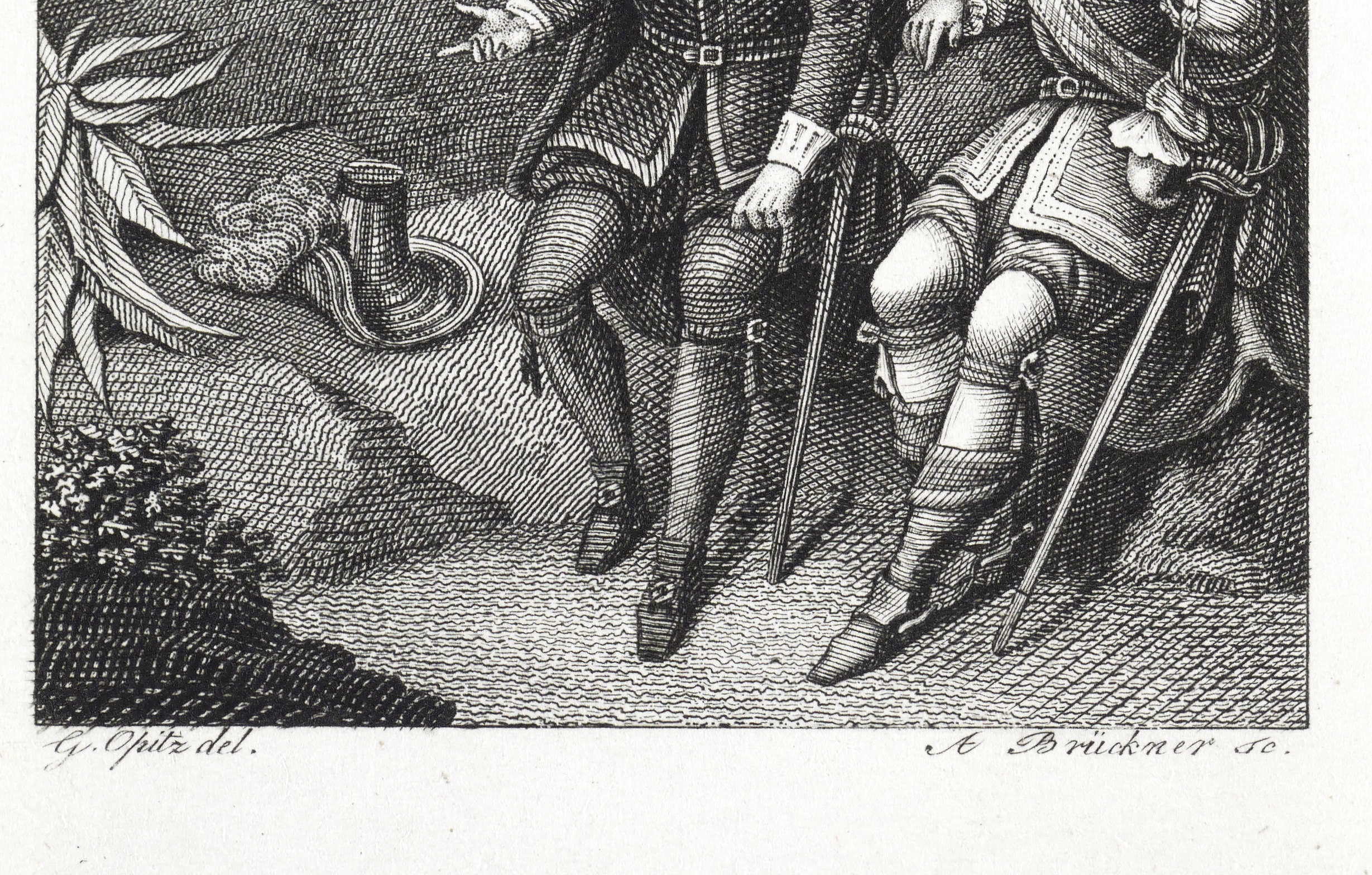 Aus: Christiane Benedikte Naubert, Turmalin und Lazerta. eine Reliquie des 17. Jahrhunderts 1680-1682 (Leipzig: J. C. Hinrichs'sche Buchhandlung 1820). – Rechts unten signiert: ″A. Brückner sc.″ – Guter Zustand.
