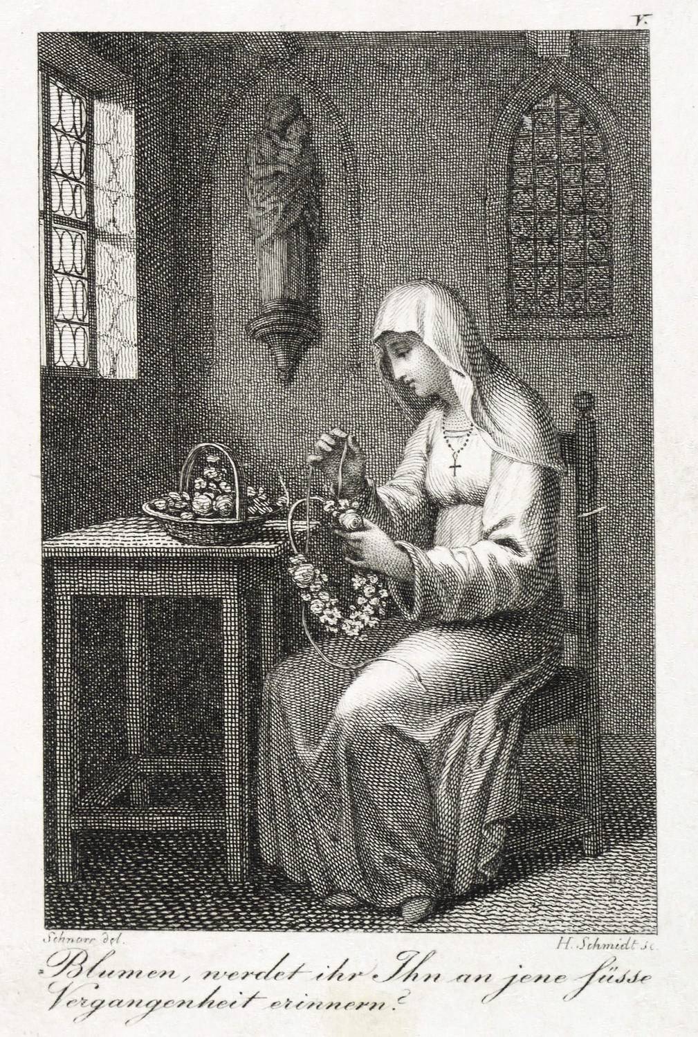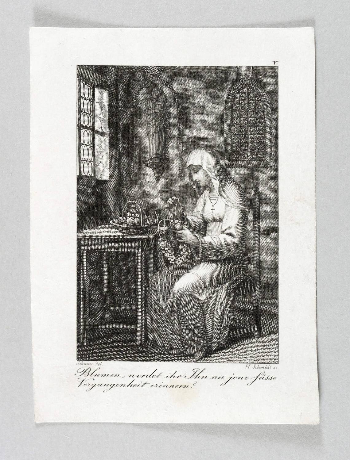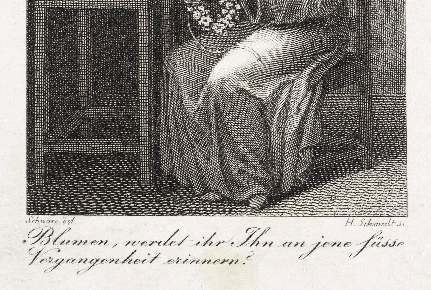 Aus: Frauenzimmer-Almanach. Zum Nutzen und Vergnügen für die Jahre 1814 & 1815 (Leipzig: Adam Friedrich Böhme 1814). – In der Platte links und rechts unten signiert: ″Schnorr del. // H. Schmidt sc.″ Darunter bezeichnet: ″Blumen, werdet ihr Ihn an jene süsse Vergangenheit erinnern?″ – Illustration zu ″Amalgunde, Kaiser Adolphs von Nassau erste Geliebte″ von Georg Karl Claudius (1757–1815). – Guter Zustand.