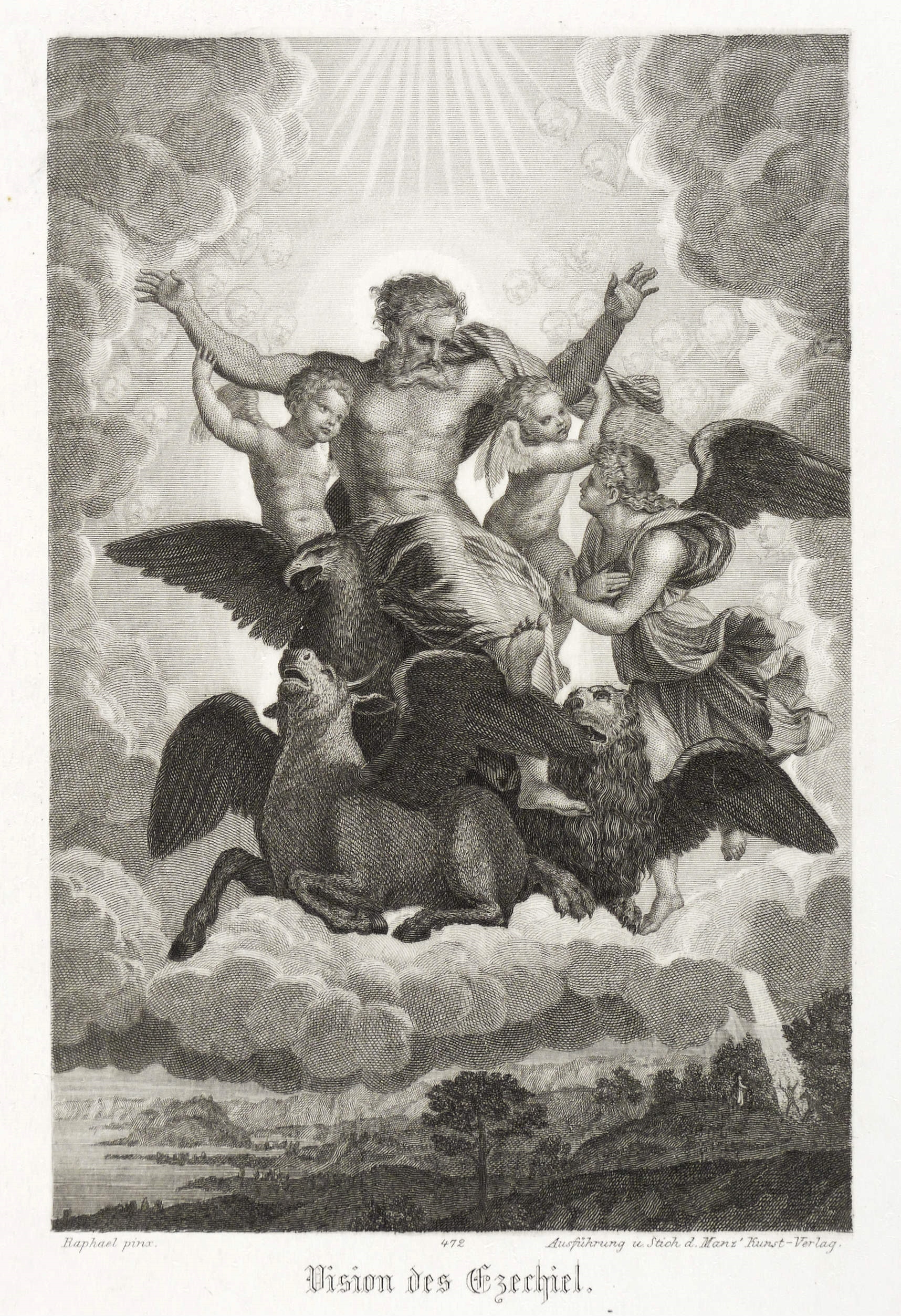 Raffael (1483 Urbino - 1520 Rom). Italienischer Maler und Architekt der Hochrenaissance. Um 1500 ging er nach Perugia in die Lehre von Pietro Vanucci, genannt Perugino. 1504-06 war Florenz wie auch Perugia tätig. Ab 1508 unter dem kunstsinnigen Papst Julius II. in Rom tätig. Nach Bramantes Tod im Jahre 1514 übernahm Raffael die Leitung des Baues der neuen Peterskirche.